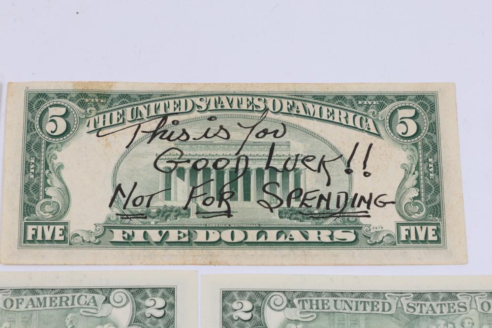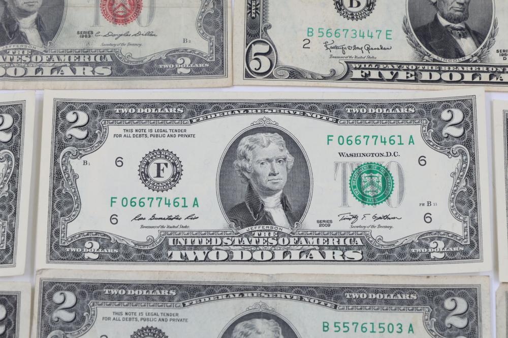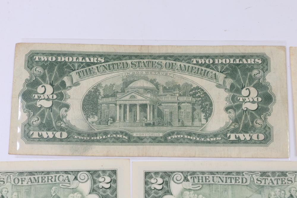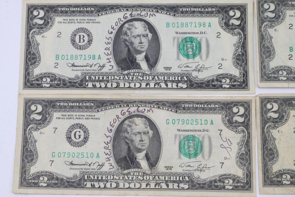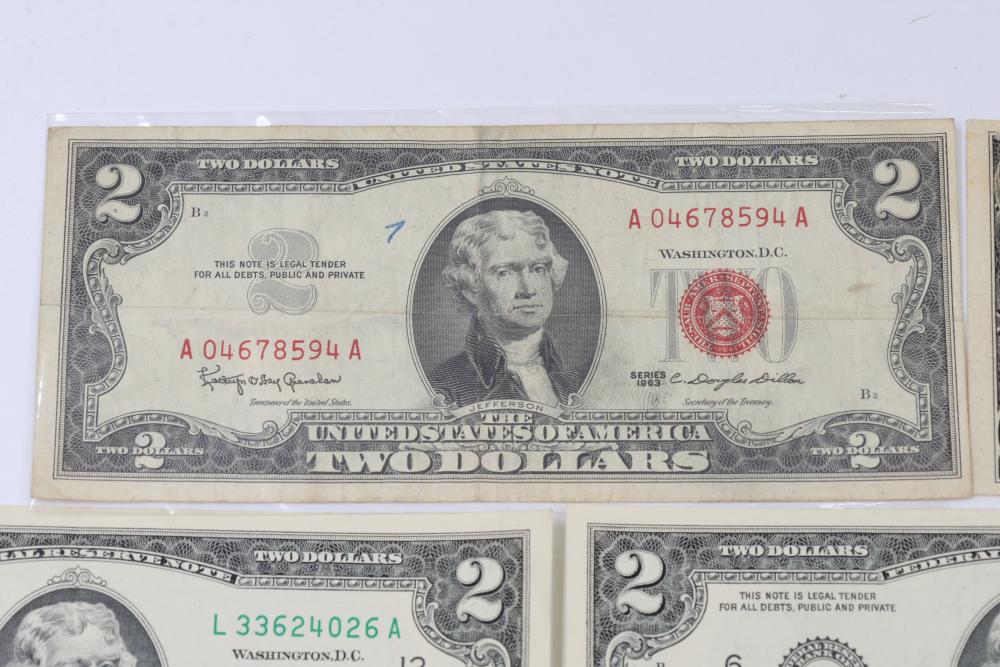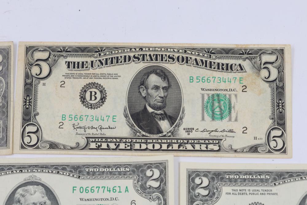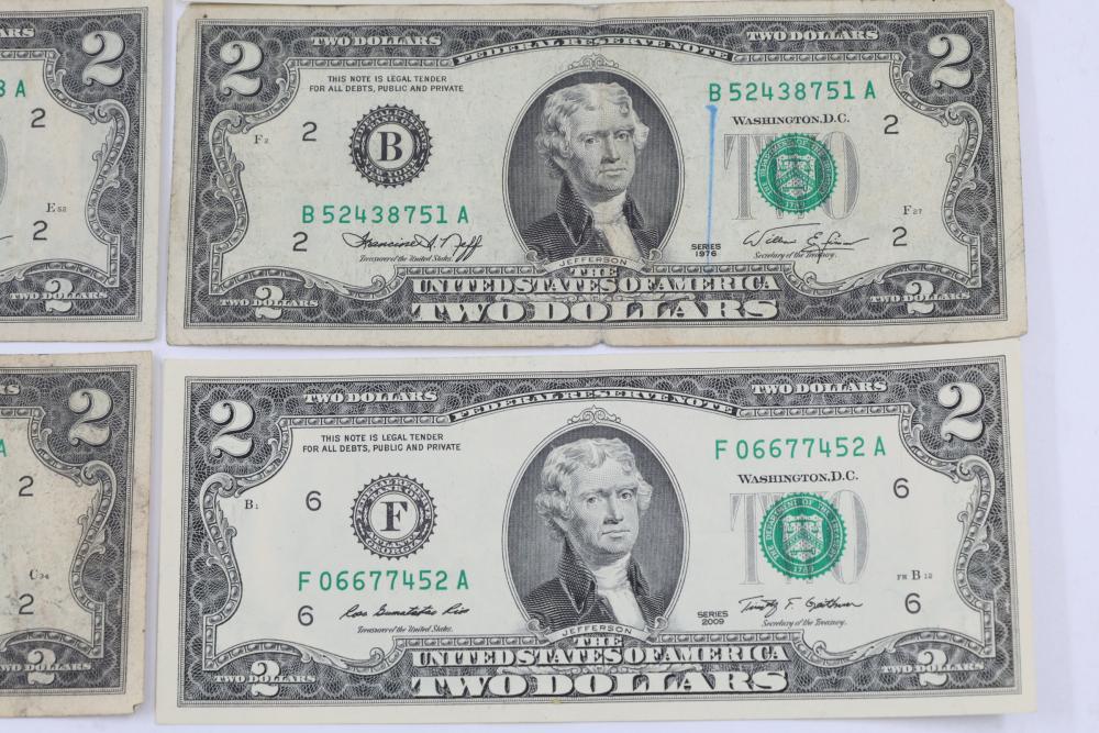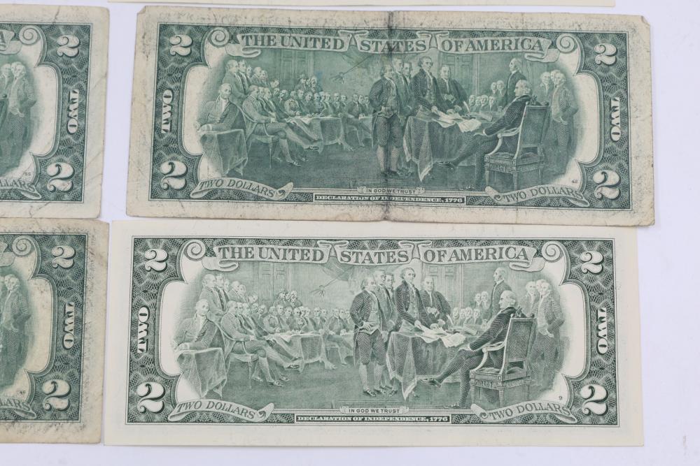 Ten United States $2 and One $5 bill includes multiple $2 notes and a single $5 note with varied series years and conditions. Reverse designs feature historical imagery such as the Signing of the Declaration of Independence.