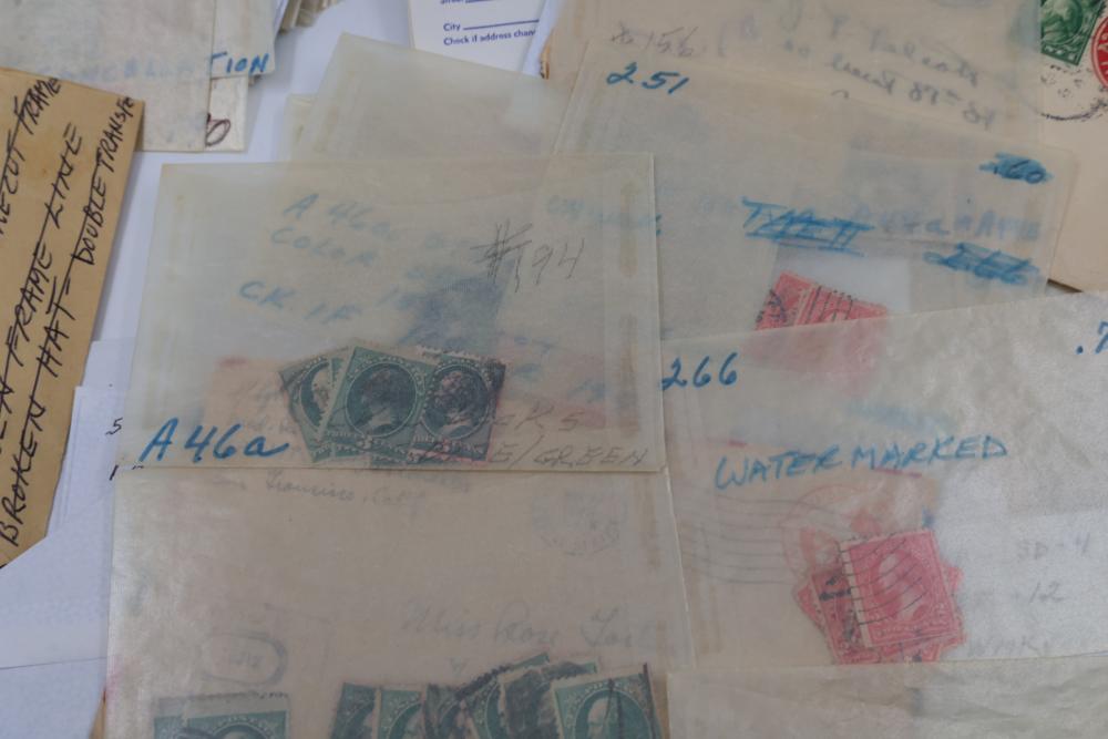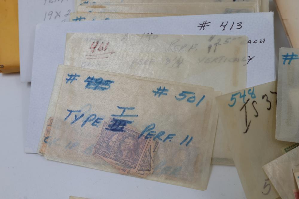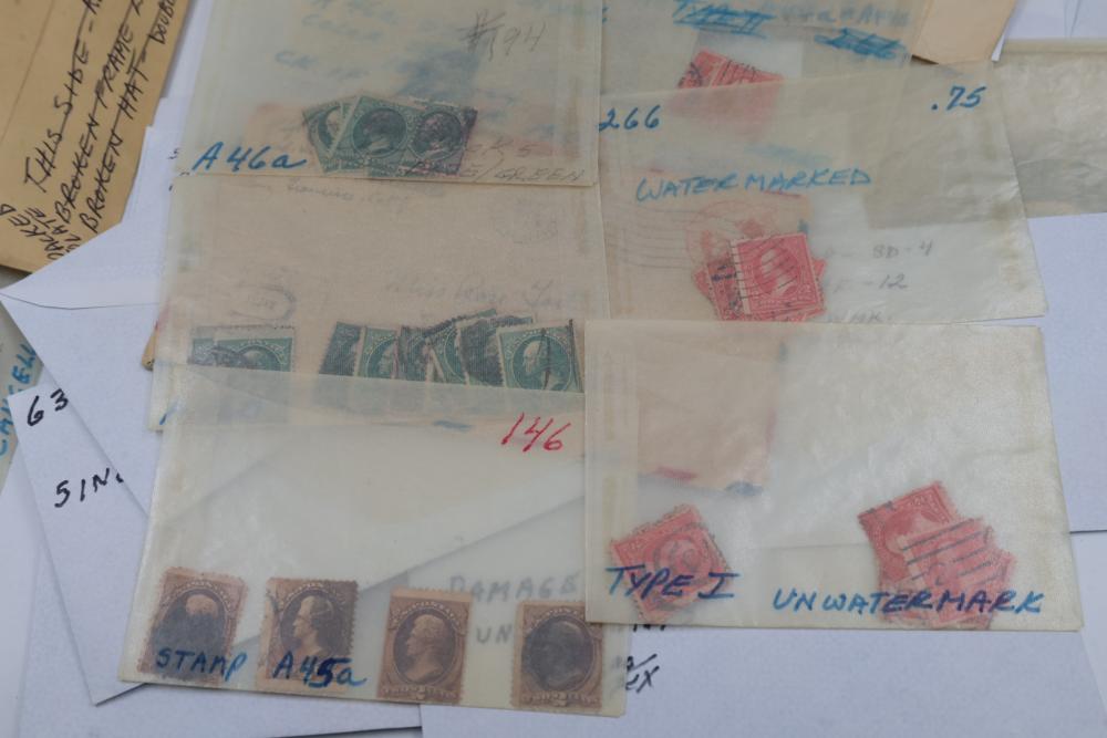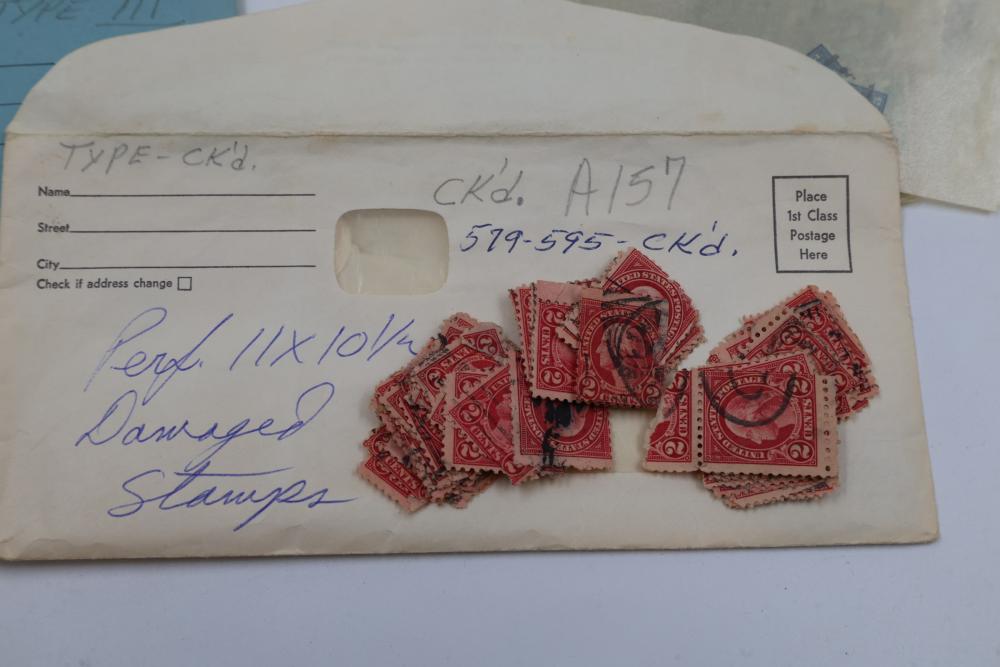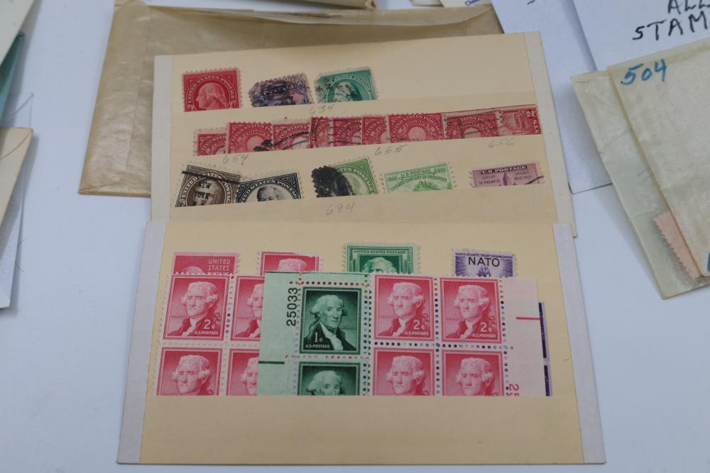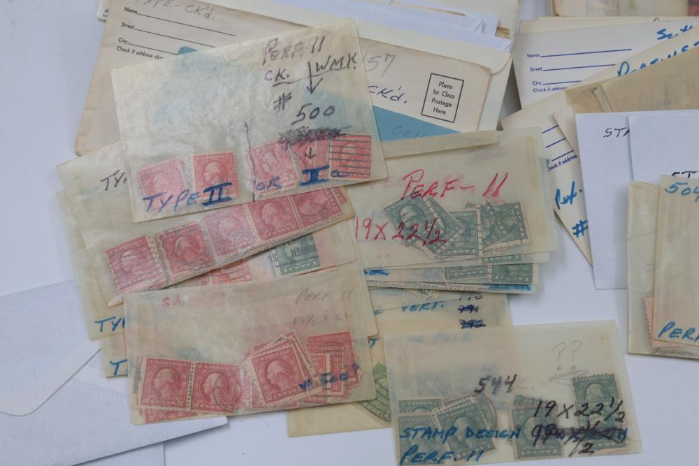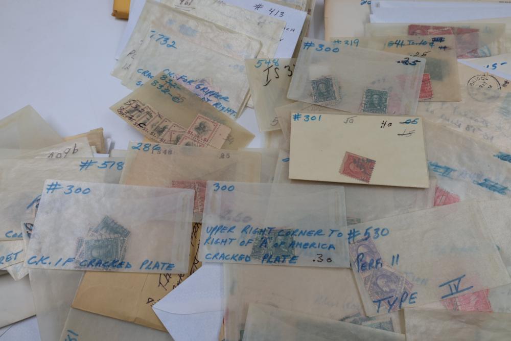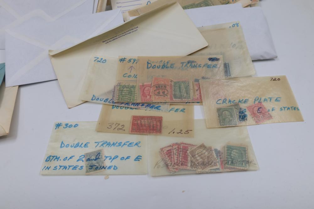 Postage stamps in various denominations and designs, organized in envelopes and protective sleeves. Includes a variety of canceled and uncanceled stamps, some with noted details such as watermarks, plate cracks, or double transfers. Includes U.S. and international stamps.