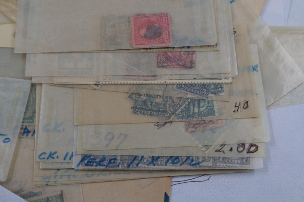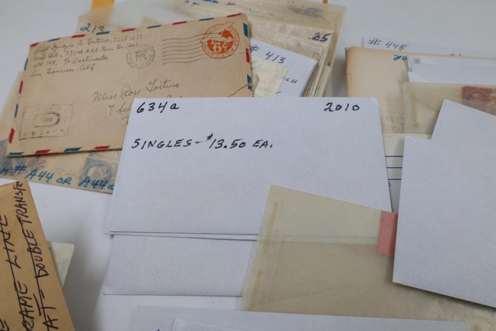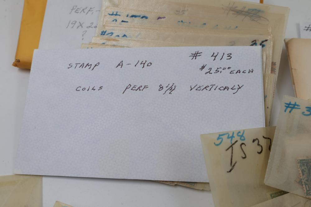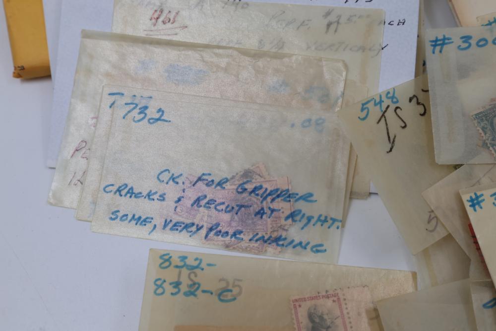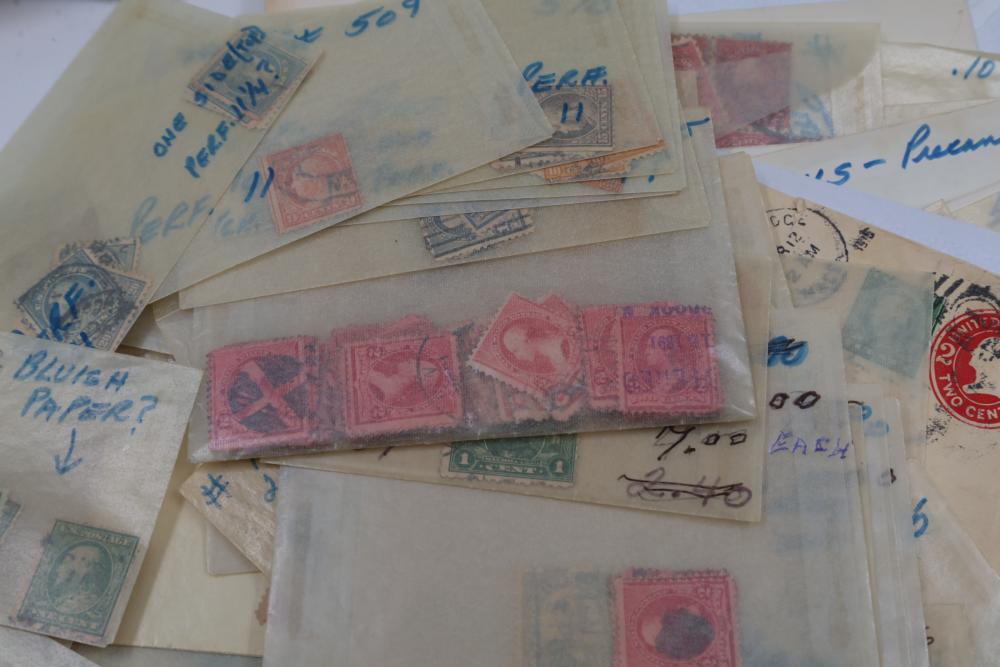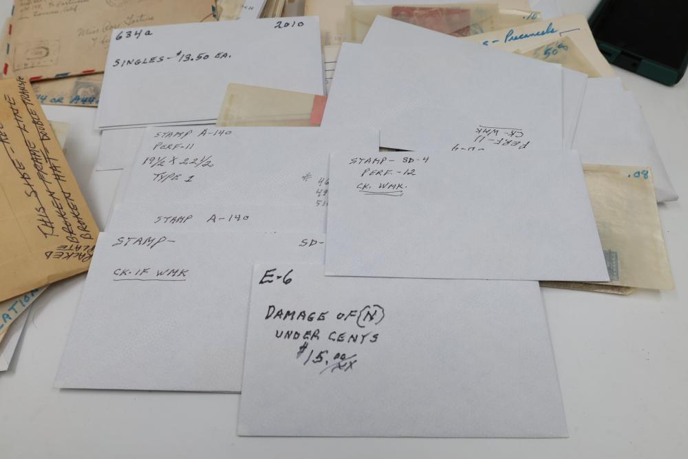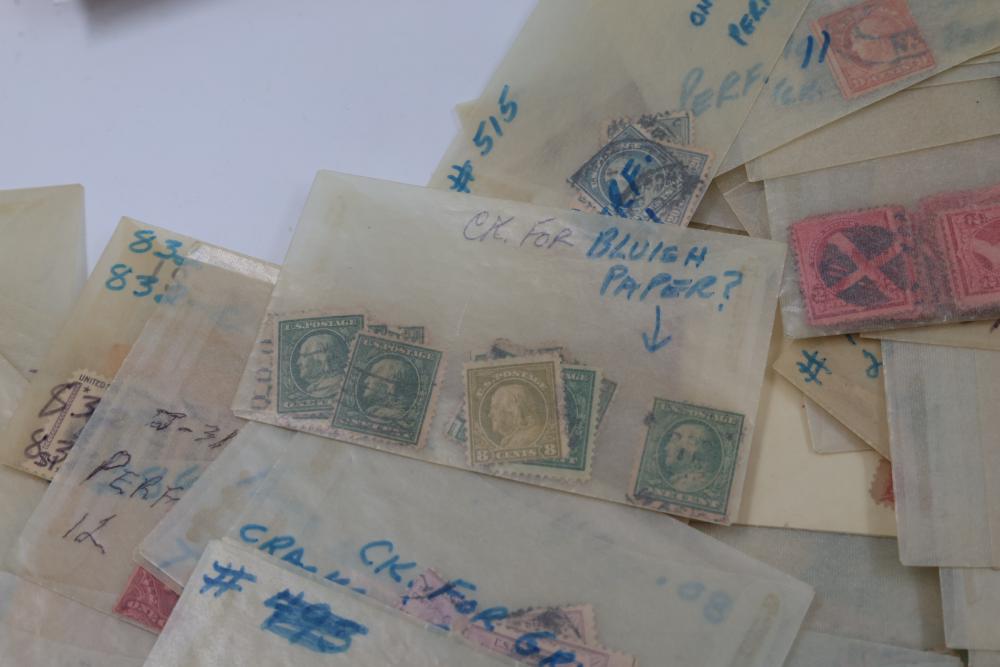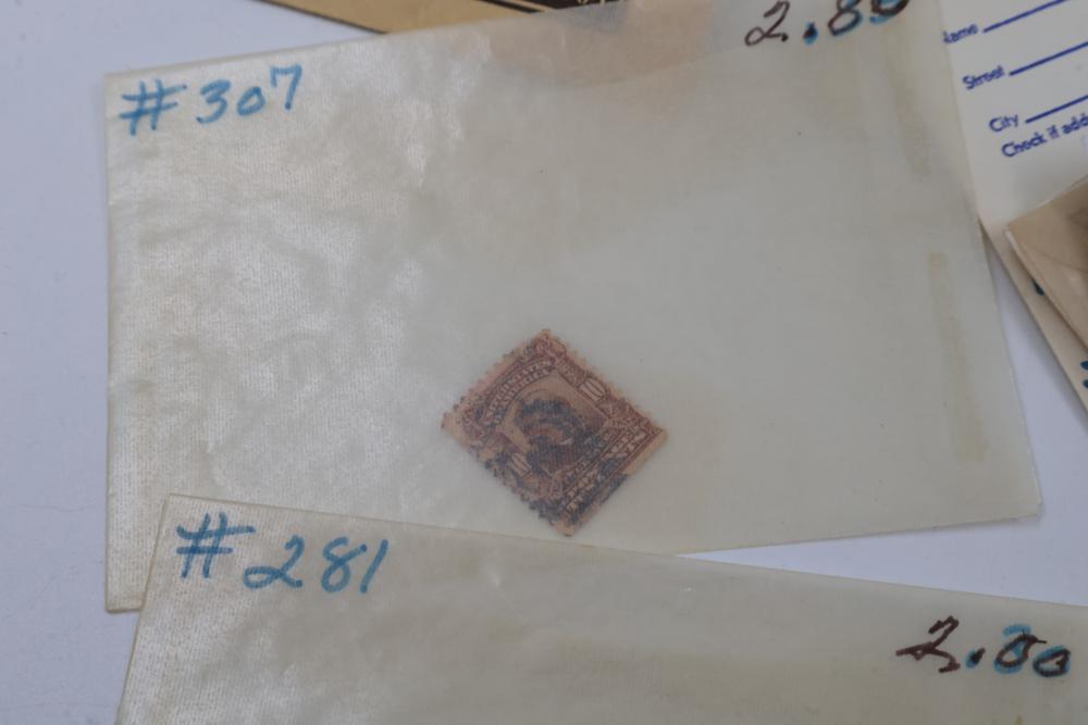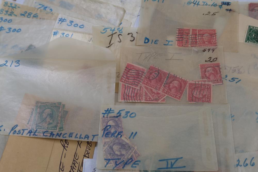 Postage stamps in various denominations and designs, organized in envelopes and protective sleeves. Includes a variety of canceled and uncanceled stamps, some with noted details such as watermarks, plate cracks, or double transfers. Includes U.S. and international stamps.