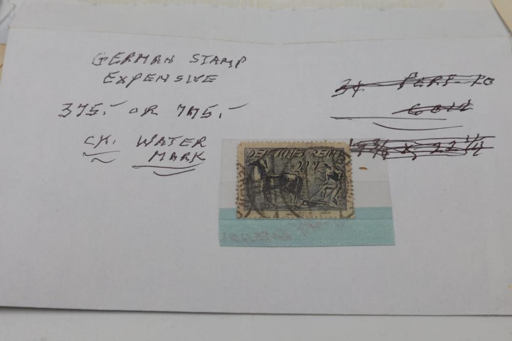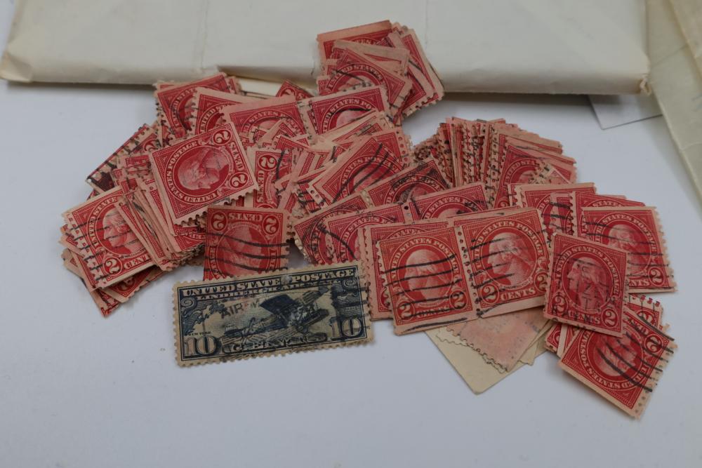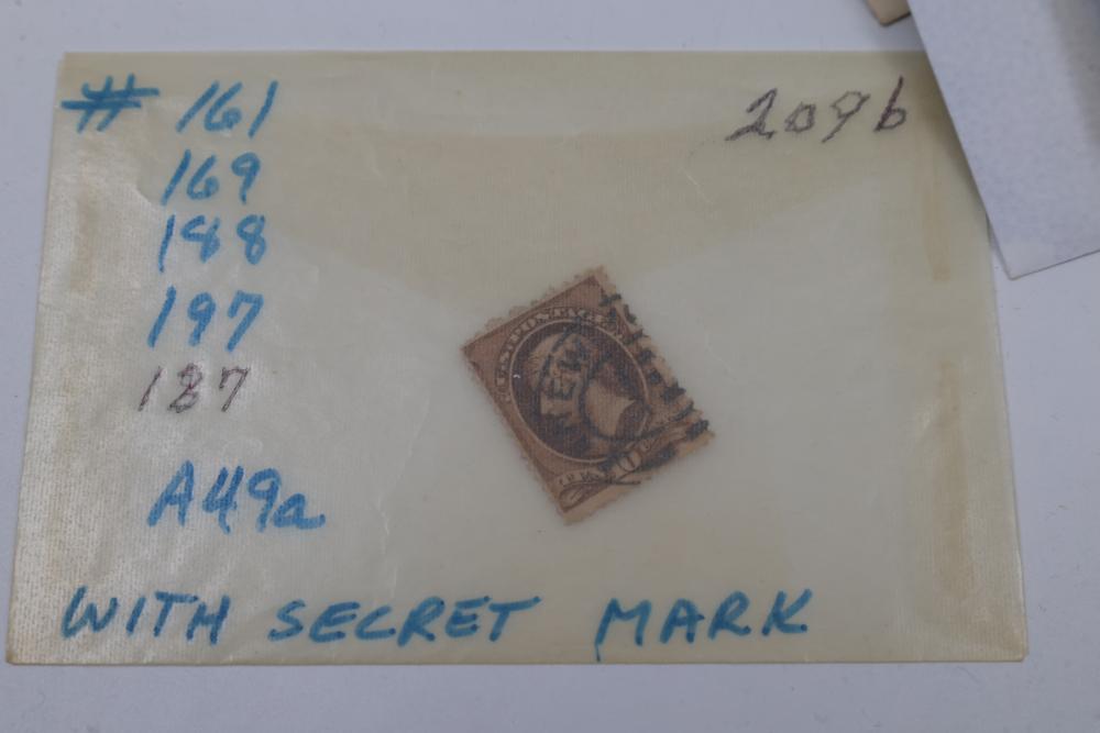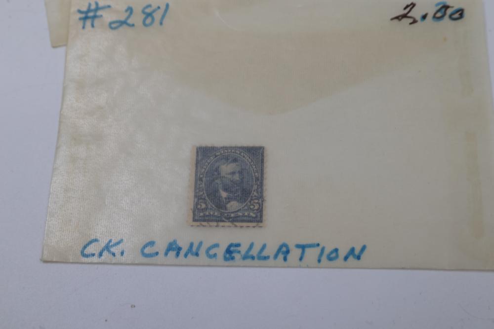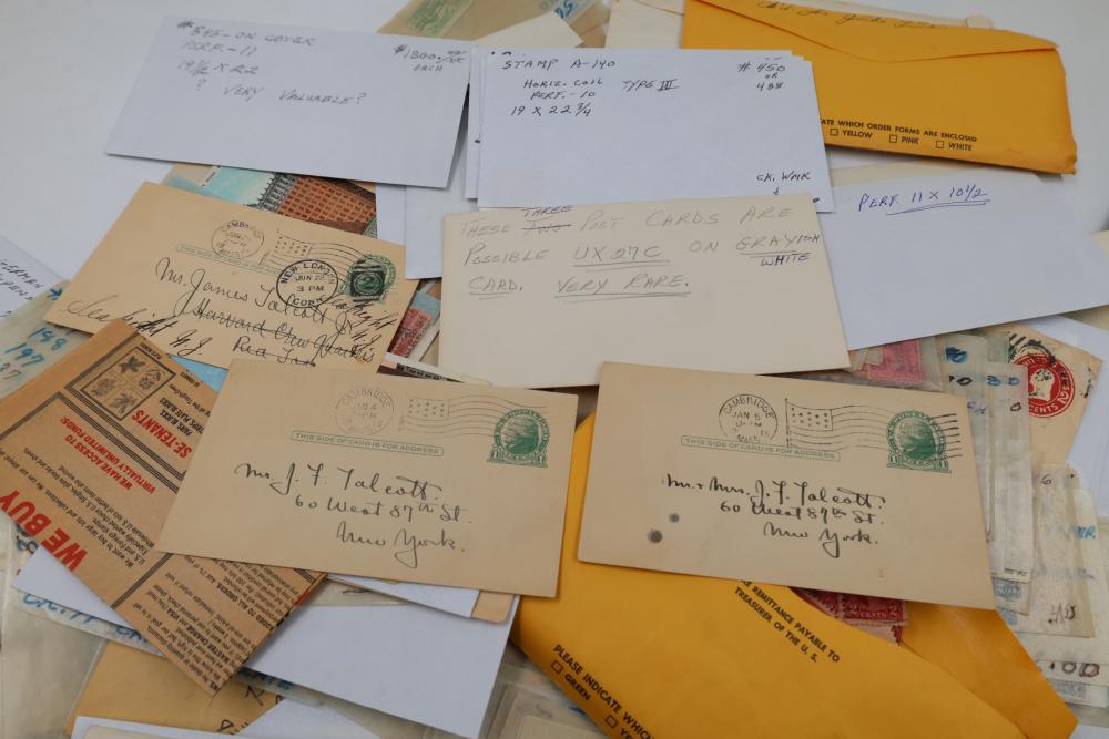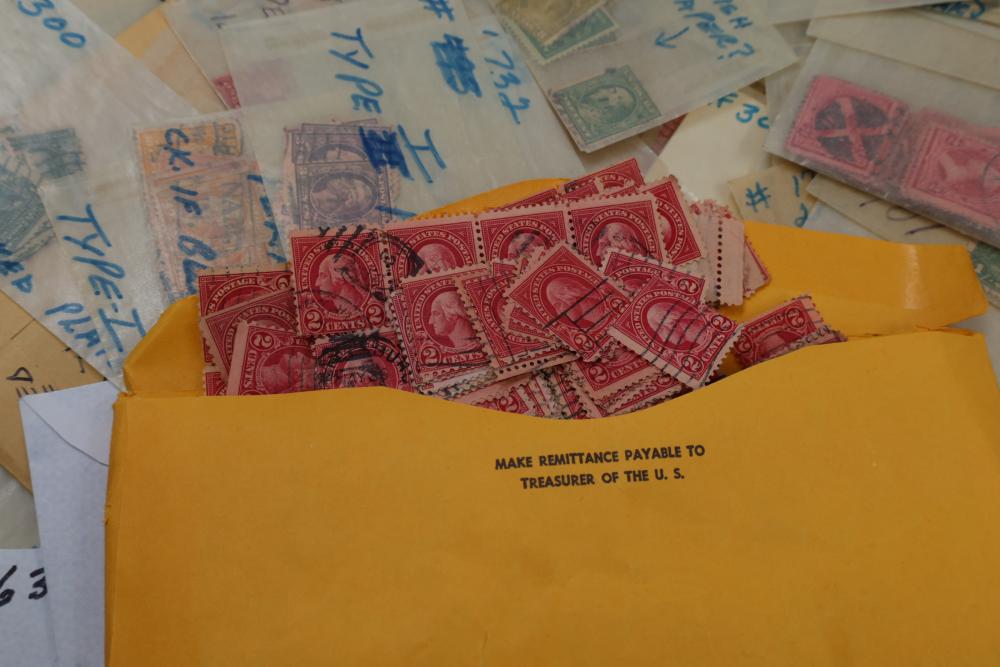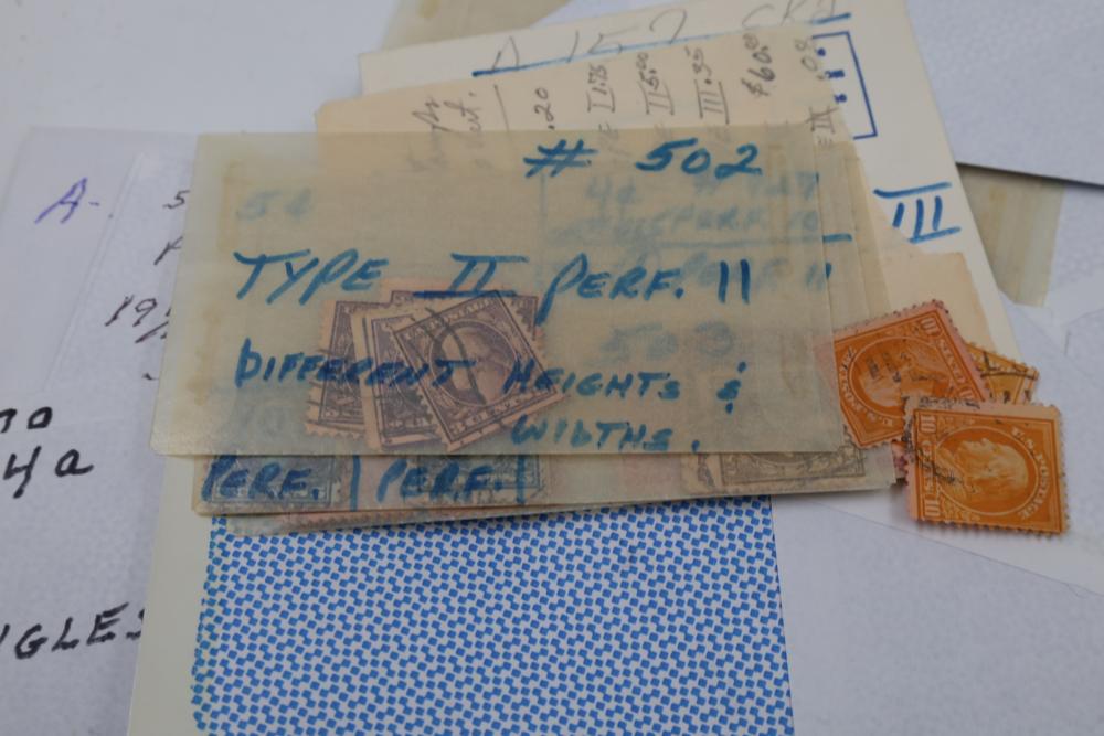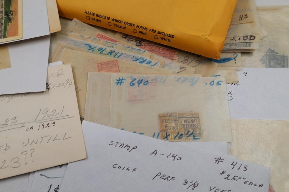Postage stamps in various denominations and designs, organized in envelopes and protective sleeves. Includes a variety of canceled and uncanceled stamps, some with noted details such as watermarks, plate cracks, or double transfers. Includes U.S. and international stamps.