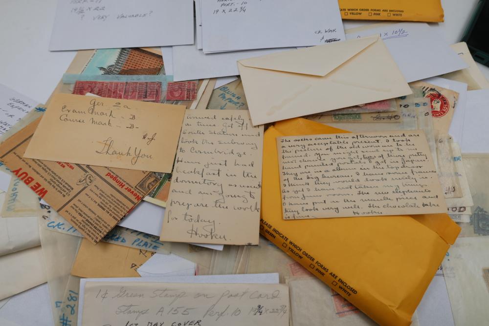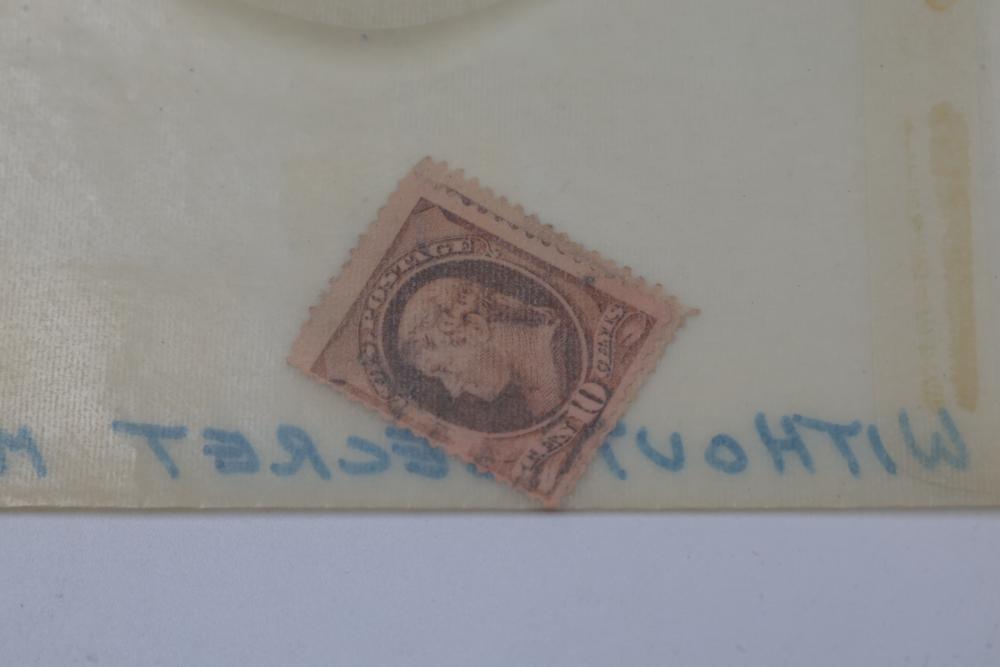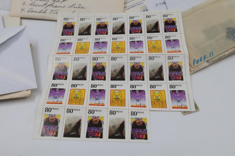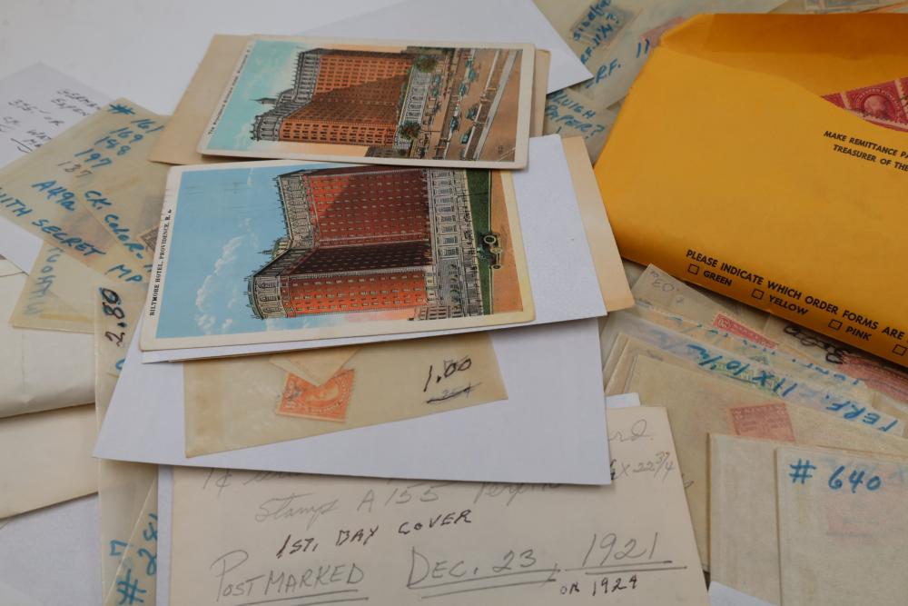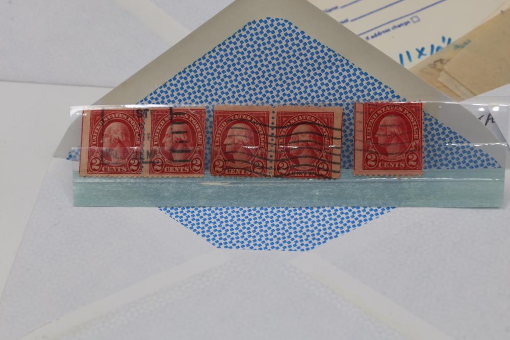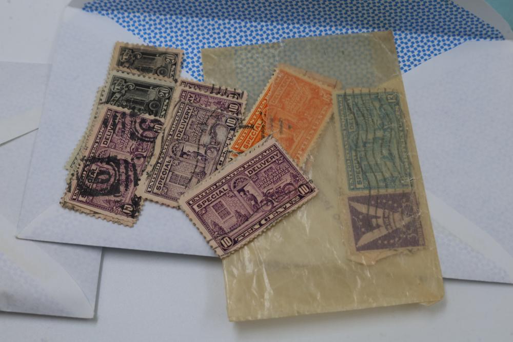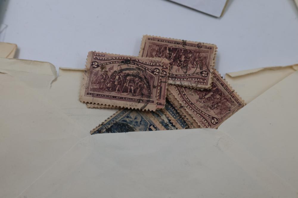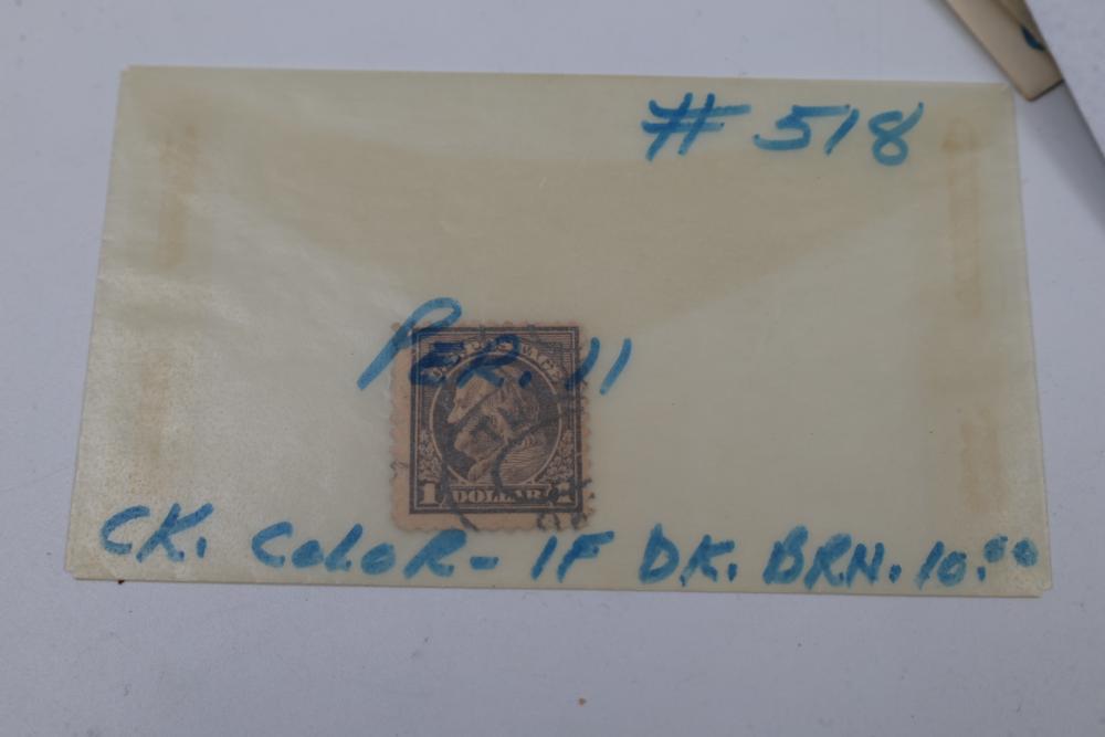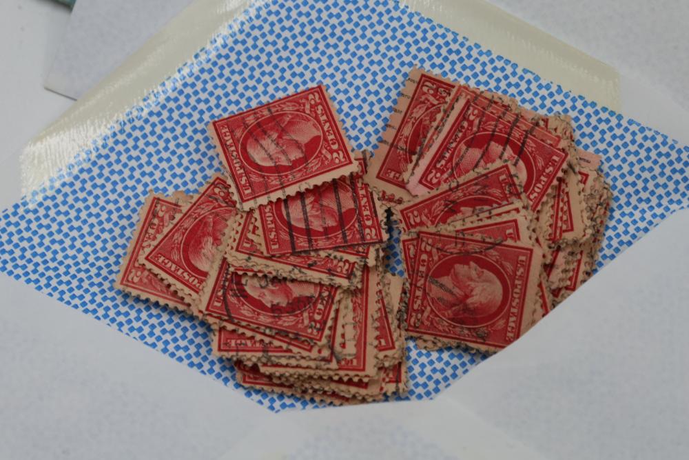 Postage stamps in various denominations and designs, organized in envelopes and protective sleeves. Includes a variety of canceled and uncanceled stamps, some with noted details such as watermarks, plate cracks, or double transfers. Includes U.S. and international stamps.