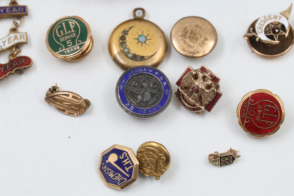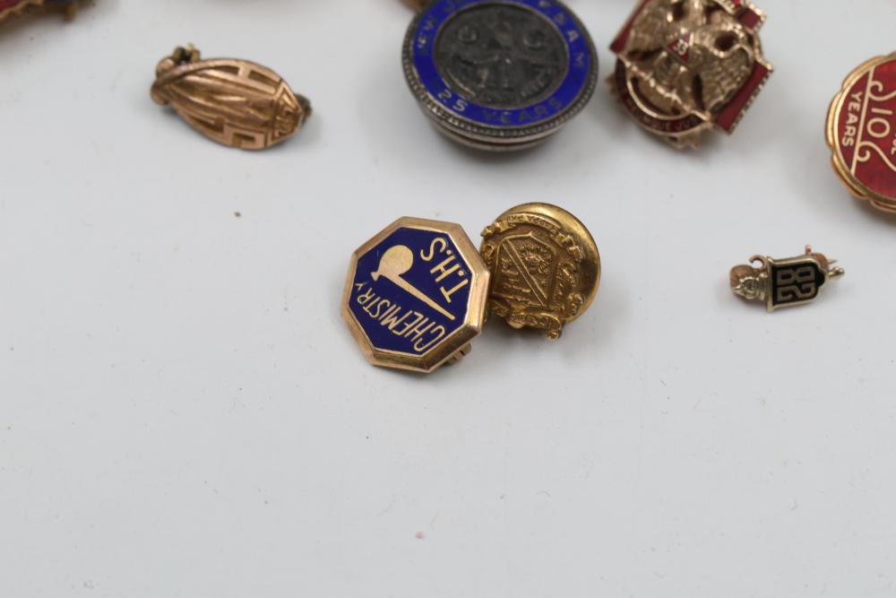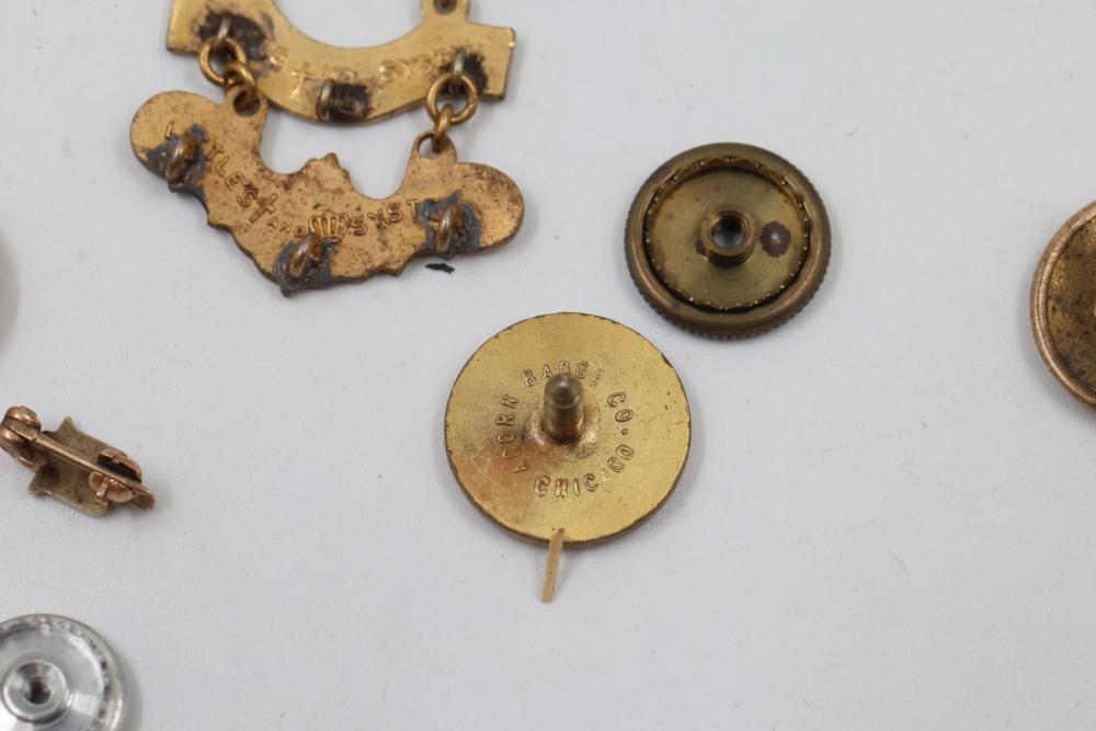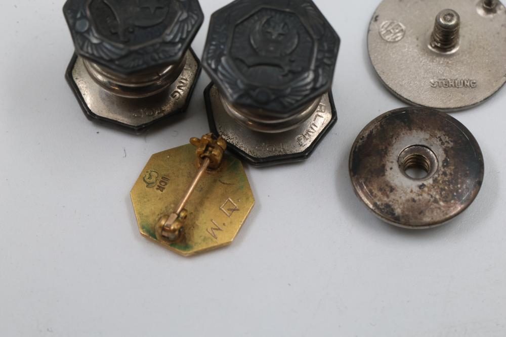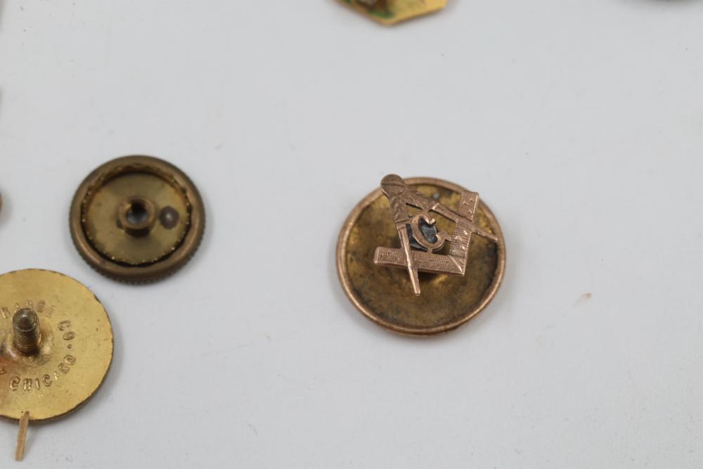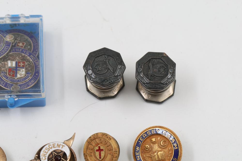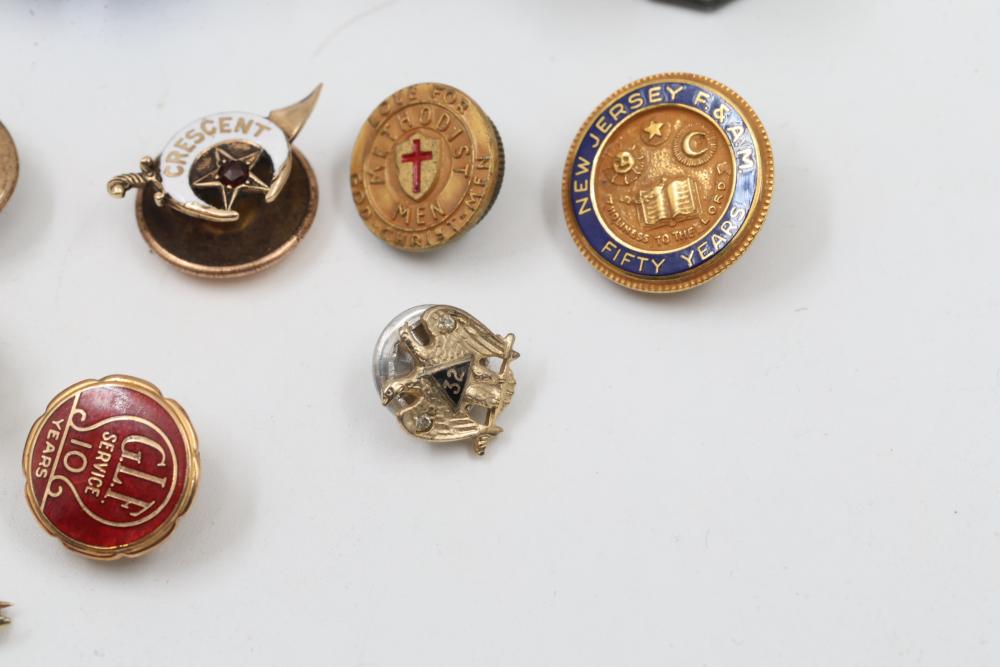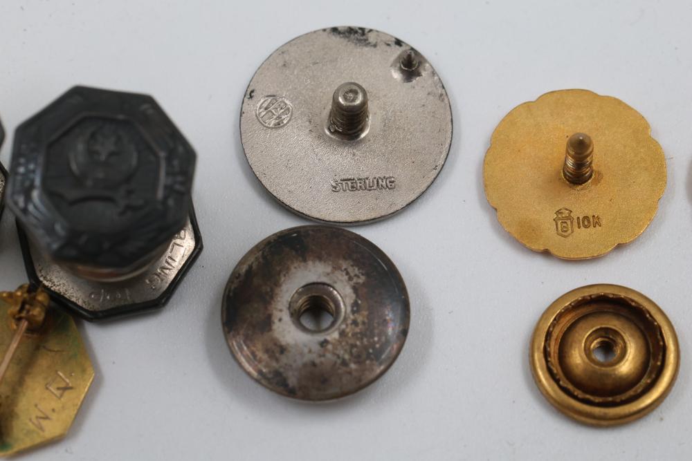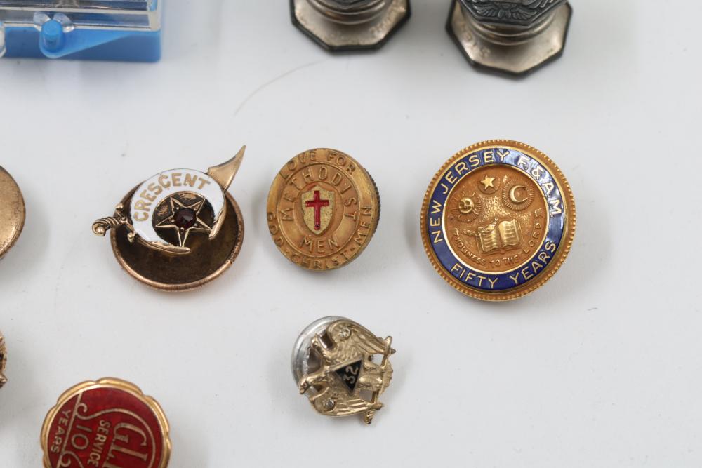 Pins and Badges in Gold, Sterling Silver, and Enamel. Includes a variety of designs featuring service medals, commemorative badges, organization insignias, and Masonic-themed pieces. Notable materials include gold-tone, sterling silver, and enamel finishes. Silver weight being 23 grams. Gold weight being 16 grams.