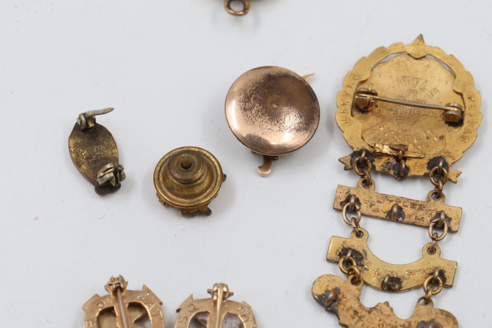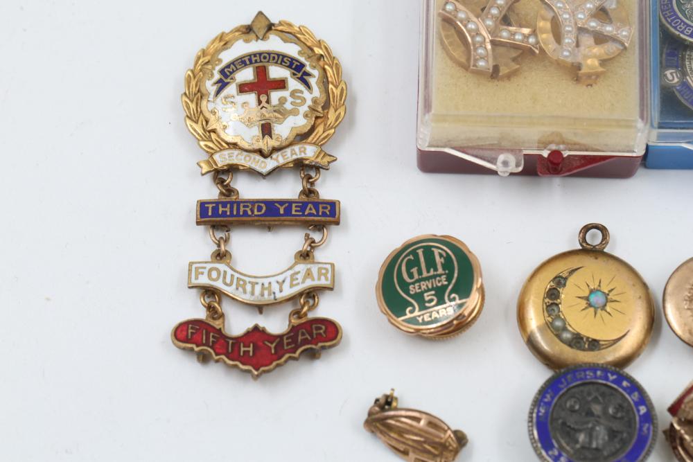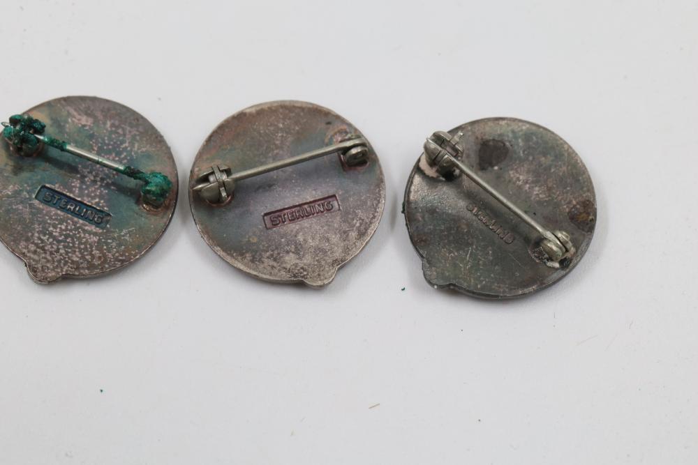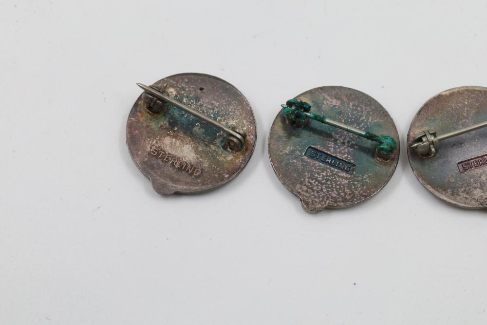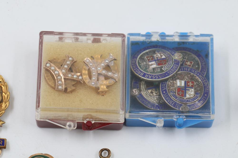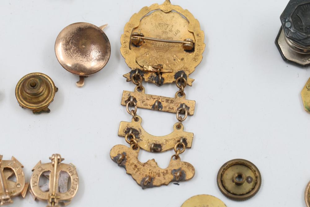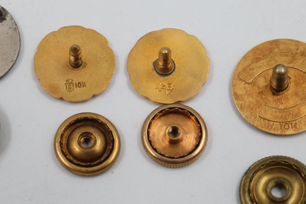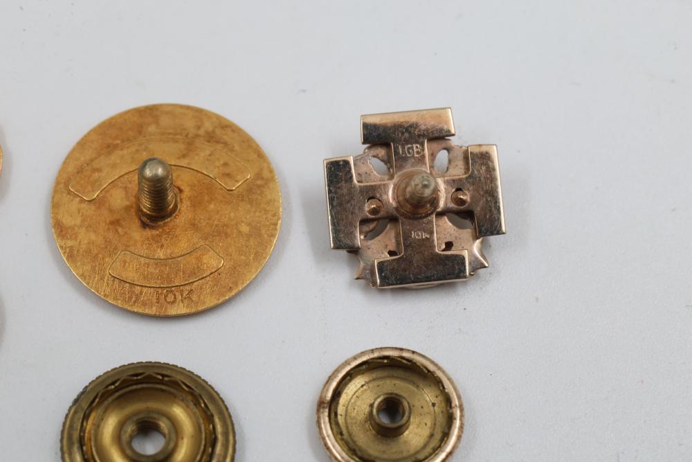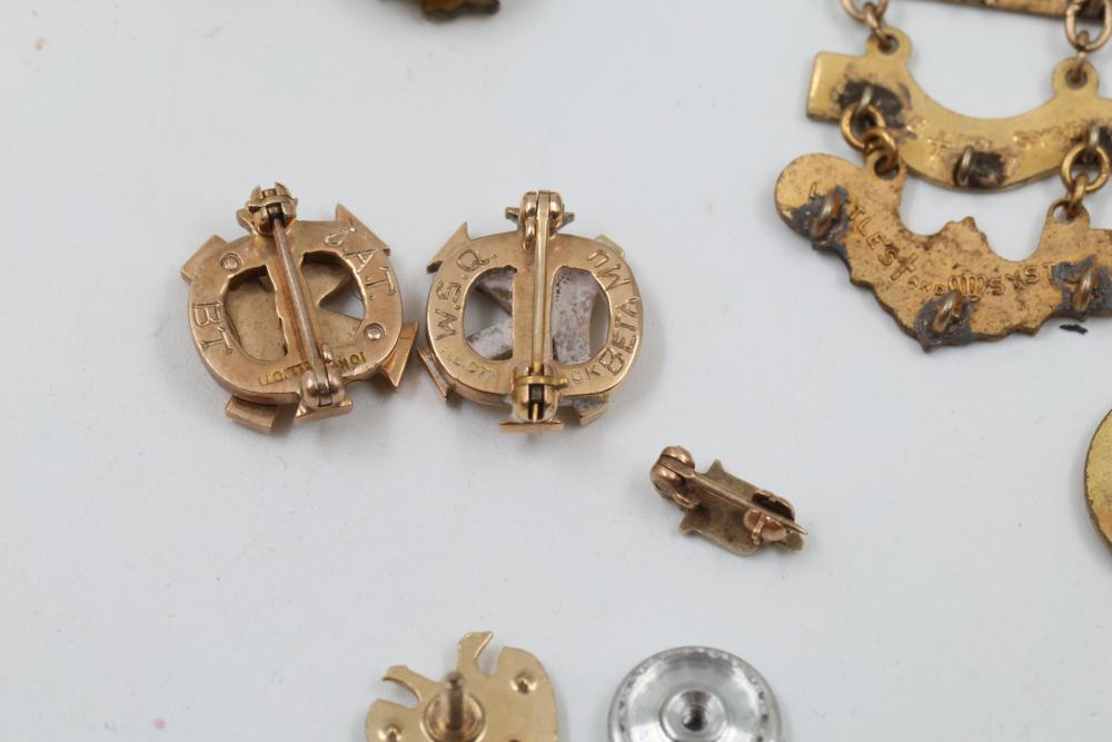 Pins and Badges in Gold, Sterling Silver, and Enamel. Includes a variety of designs featuring service medals, commemorative badges, organization insignias, and Masonic-themed pieces. Notable materials include gold-tone, sterling silver, and enamel finishes. Silver weight being 23 grams. Gold weight being 16 grams.