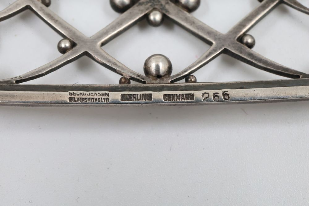 Georg Jensen Sterling Silver 266 Rectangular Brooch with Openwork Design. Features a rectangular form with intricate crisscross and bead details. Marked 'Georg Jensen,' 'Sterling,' 'Denmark,' and '266' on the reverse. Includes a secure pin clasp. Sterling weight being 14 grams.