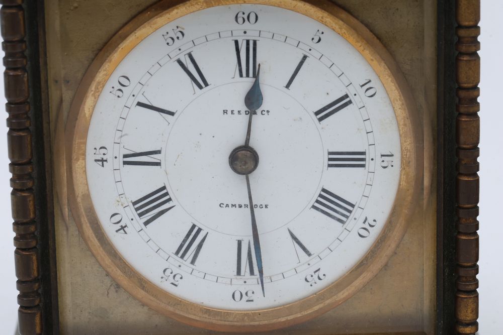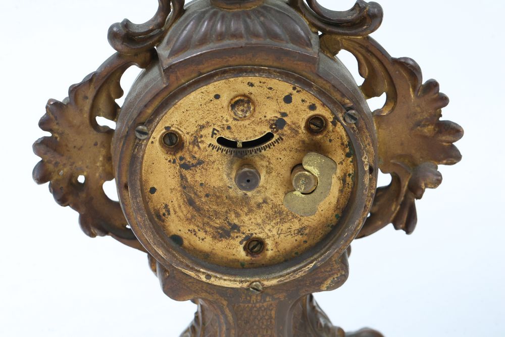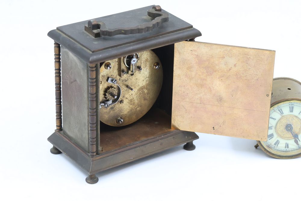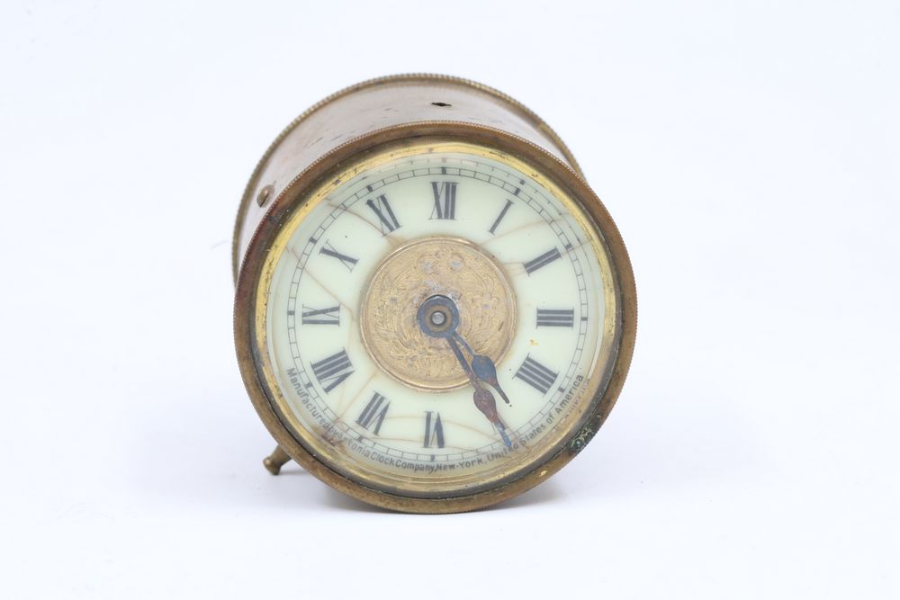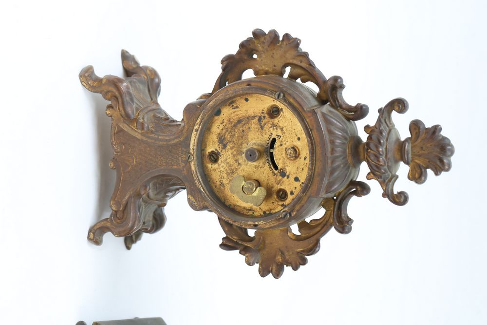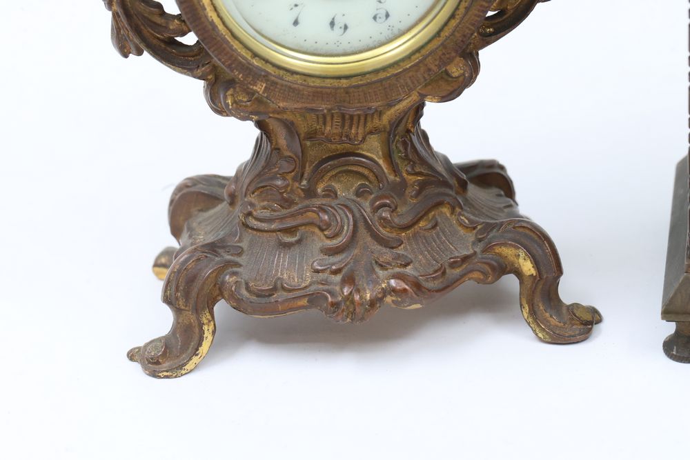 Three Decorative Clocks featuring Brass and Ornate Designs. Includes a brass cylindrical clock, an elaborately designed cast metal clock with scrollwork and floral details, and a rectangular brass and glass clock with columnar accents. Produced by notable makers including the New Haven Clock Company, as indicated on one clock. Origin and design styles reflect late-19th-century craftsmanship.