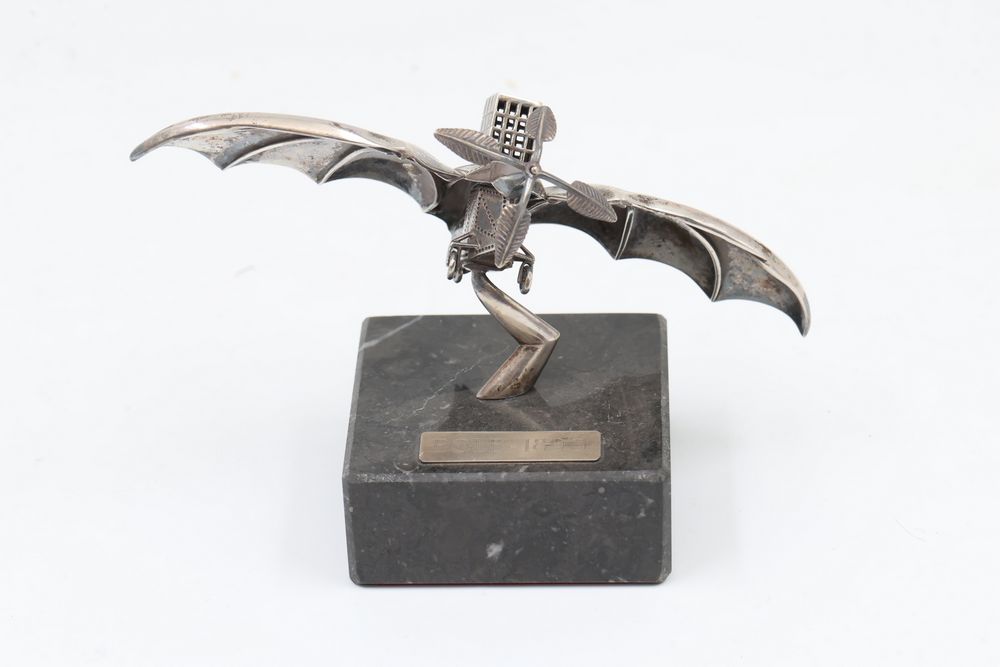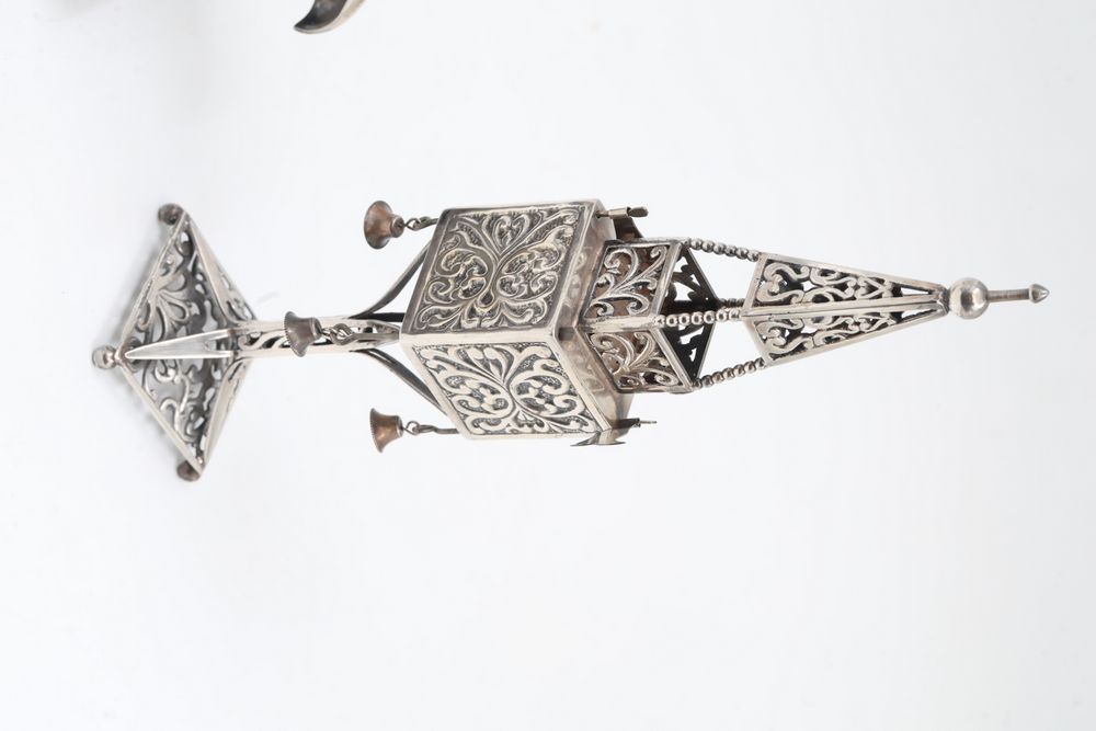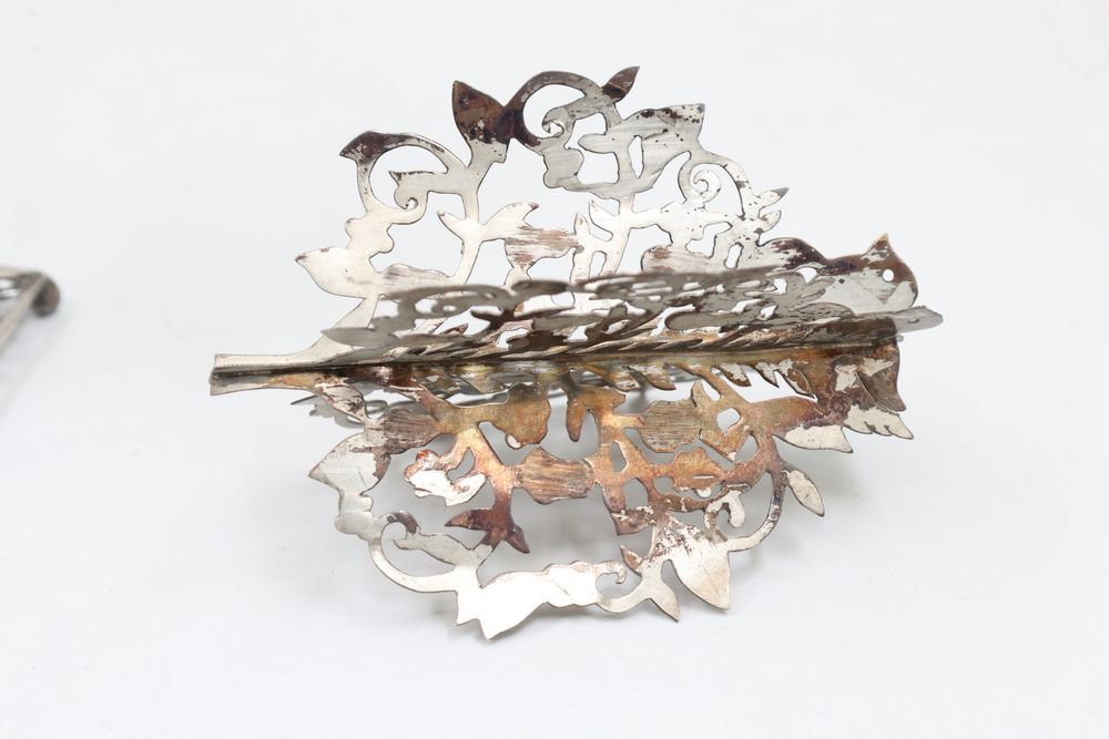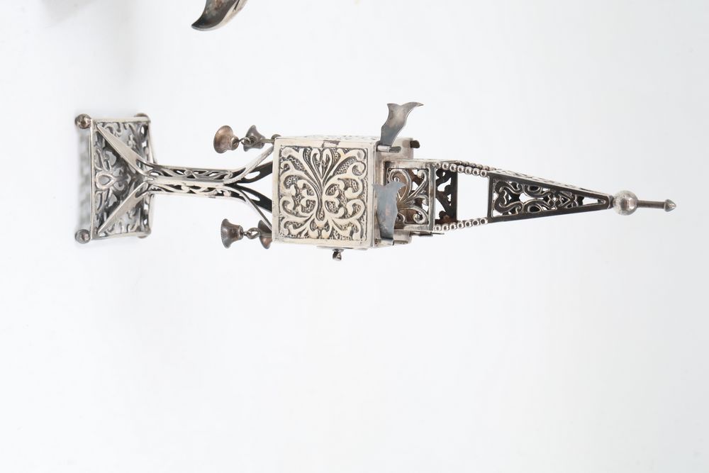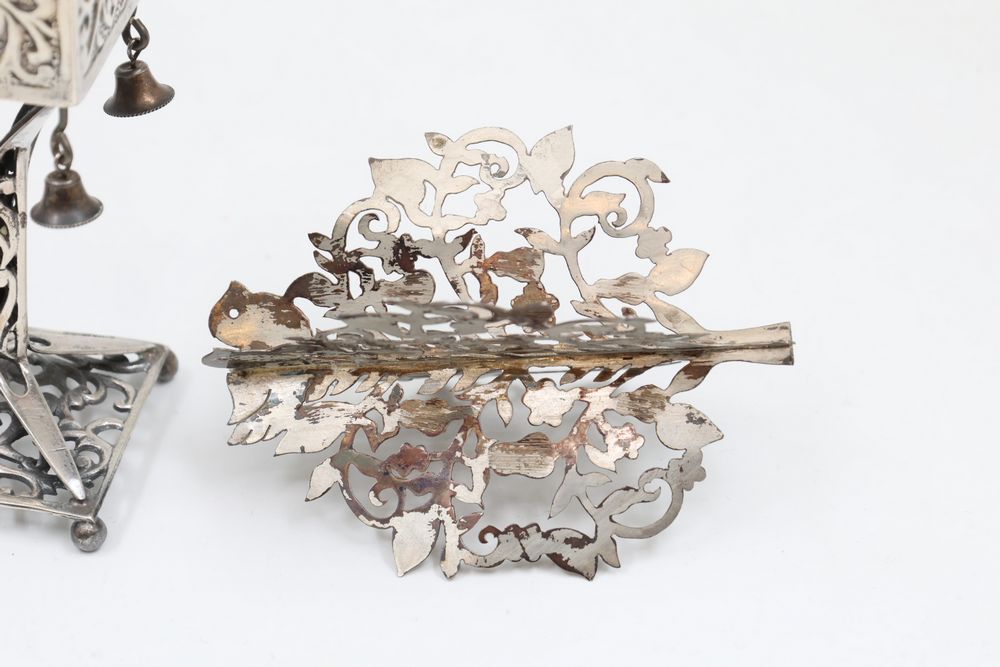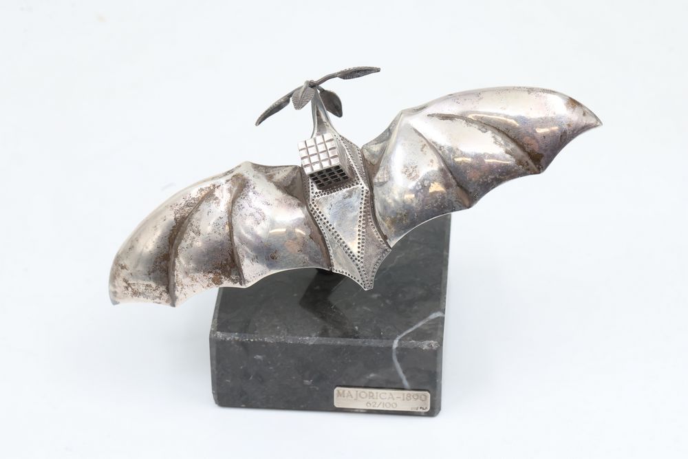 Silver Filigree Tower Spice Box, Decorative Leaf Element, and Metal Sculpture. The tower spice box features intricate filigree designs, a tall spire, small bells, and detailed cutwork patterns. The decorative leaf element is fashioned with delicate openwork in a naturalistic leaf motif. The metal sculpture depicts a bat-inspired winged figure mounted on a stone base marked "Eole - 1890" and "Majorica - 1890," numbered 62/100. Items are marked "925" and "Sterling". Sterling weight being 165 grams.