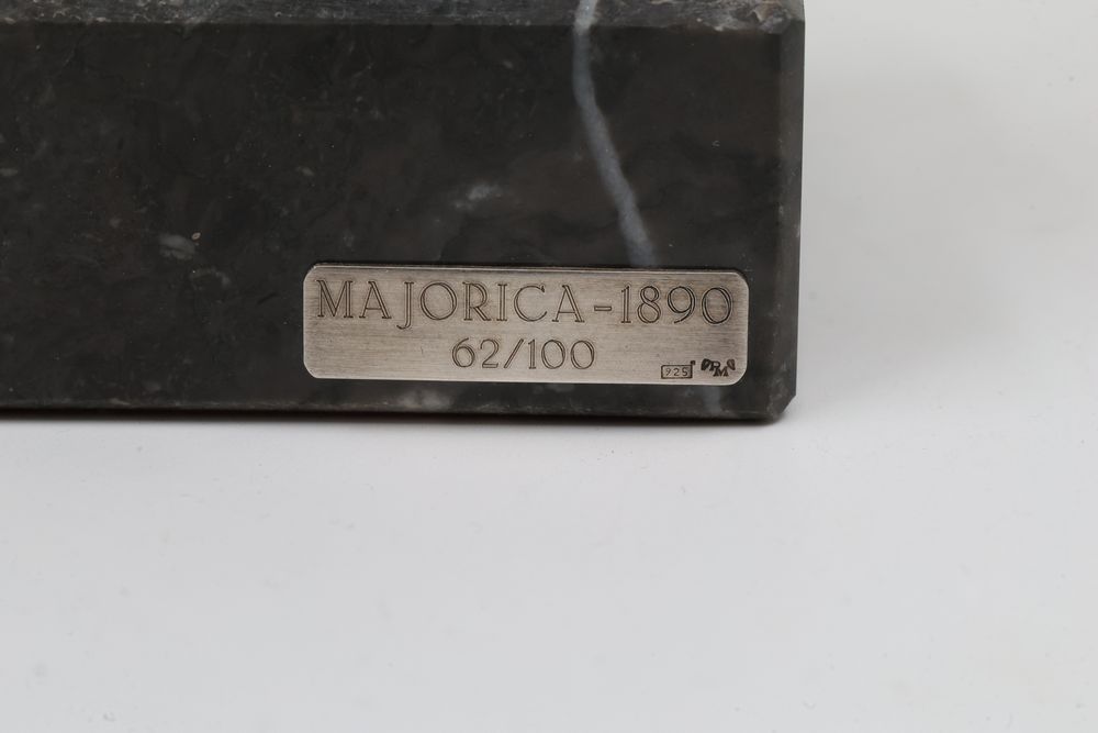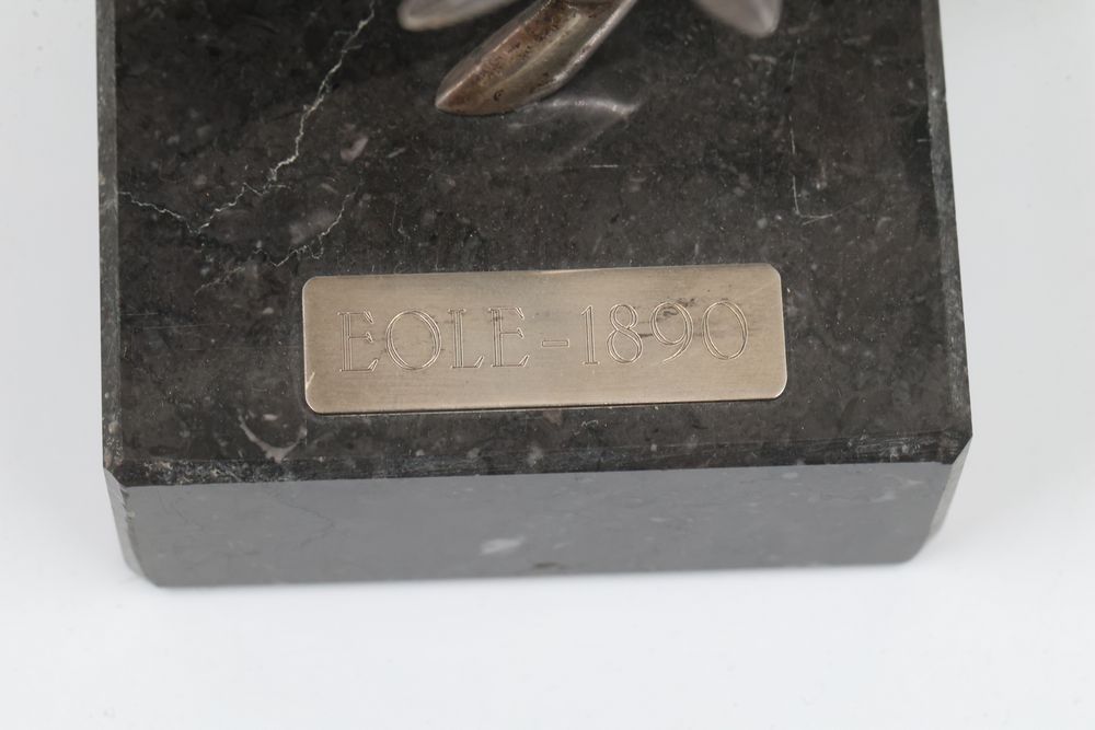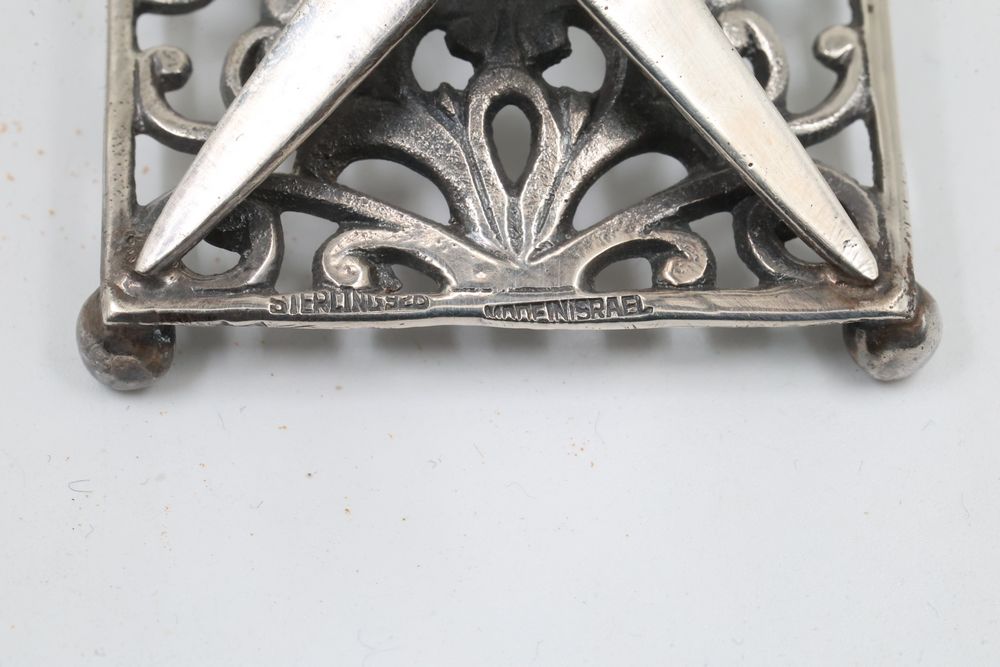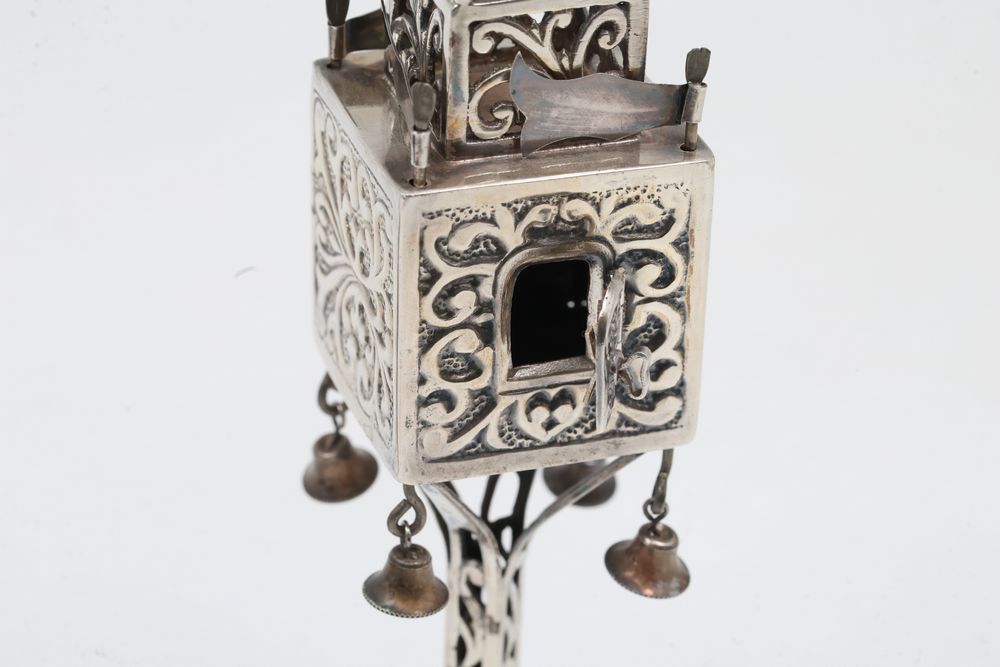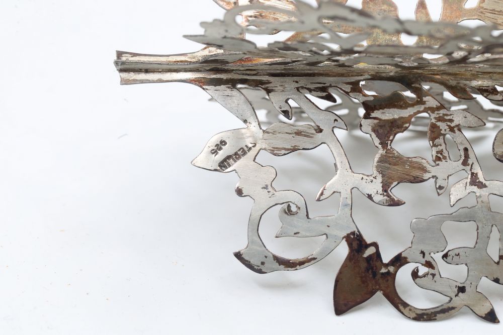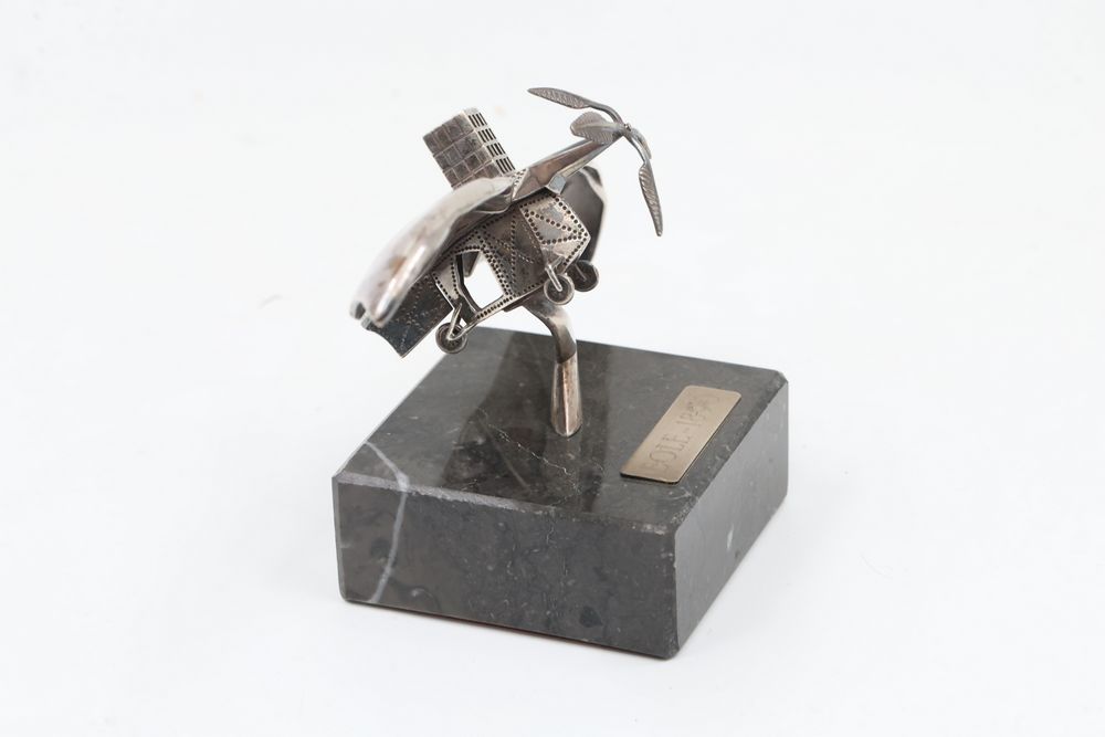Silver Filigree Tower Spice Box, Decorative Leaf Element, and Metal Sculpture. The tower spice box features intricate filigree designs, a tall spire, small bells, and detailed cutwork patterns. The decorative leaf element is fashioned with delicate openwork in a naturalistic leaf motif. The metal sculpture depicts a bat-inspired winged figure mounted on a stone base marked "Eole - 1890" and "Majorica - 1890," numbered 62/100. Items are marked "925" and "Sterling". Sterling weight being 165 grams.