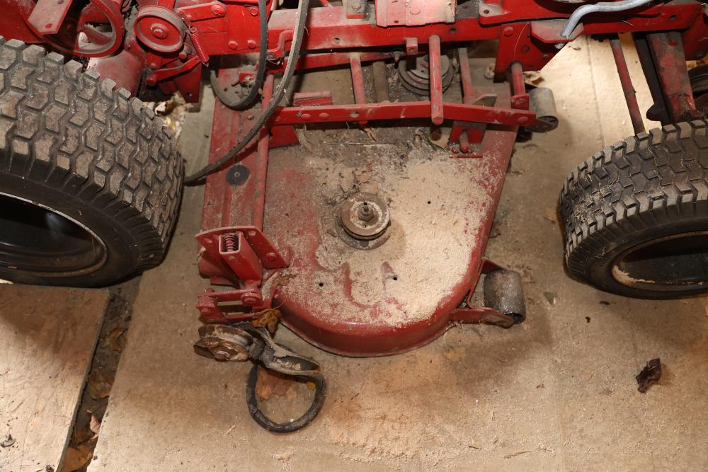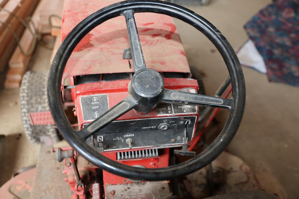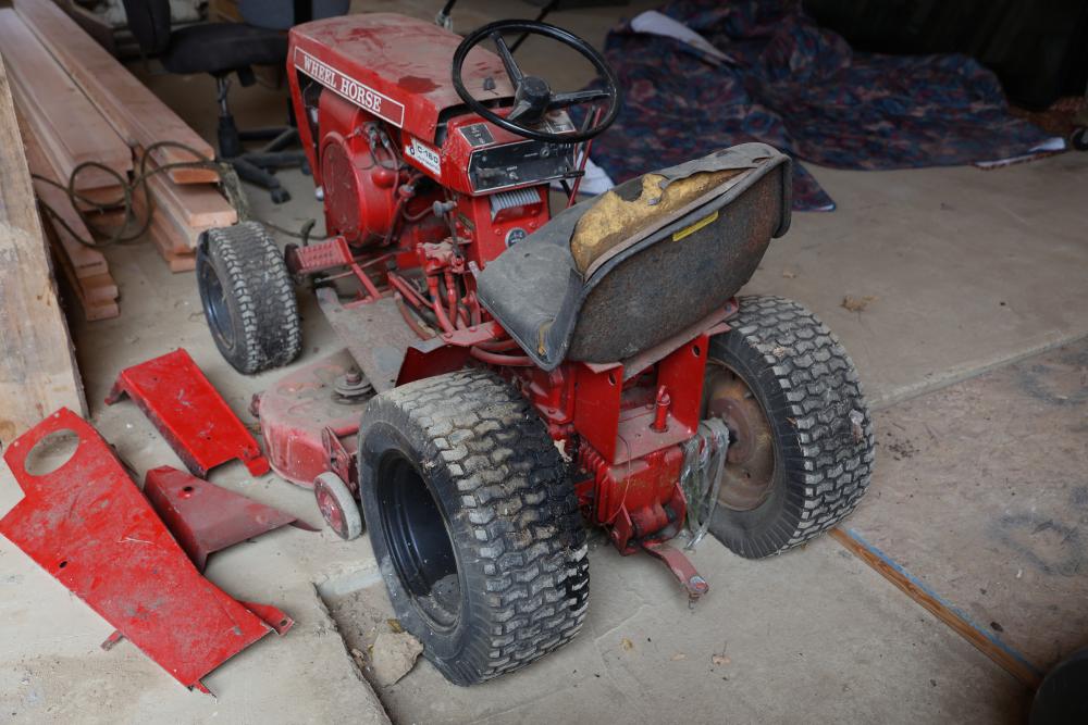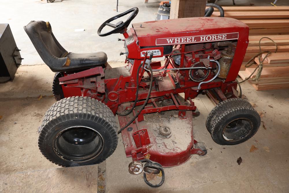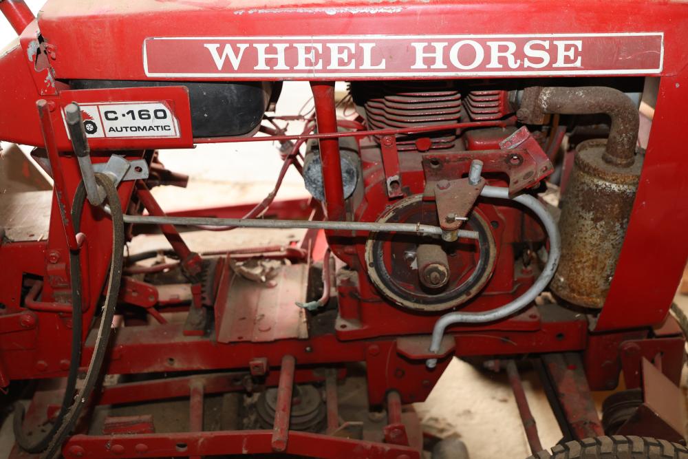 Wheel Horse C-160 Automatic Garden Tractor with Kohler Engine. Features a Kohler engine, mower deck, and manual steering wheel. Includes additional red body panels. Buyer is responsible for all help and materials necessary for removal. Operation unknown. Pickup only.