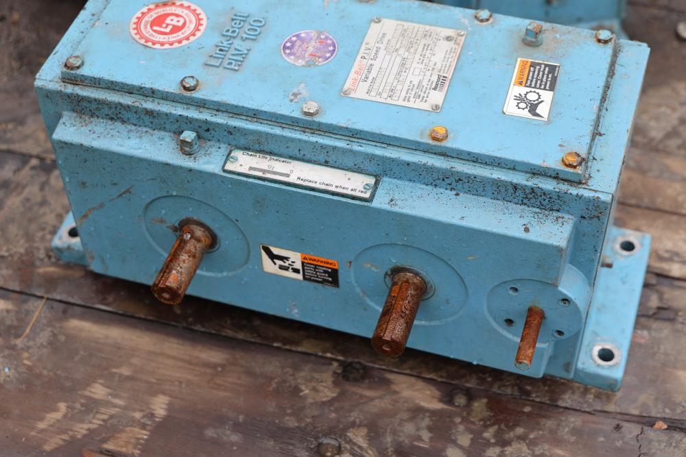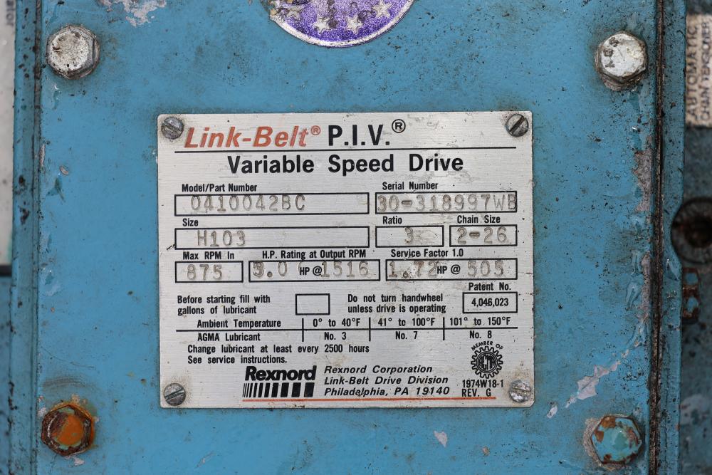 Link-Belt PIV 100 Variable Speed Drive Model 04100428C with 40:1 Ratio. Motor HP at input: 1.75 HP, SF: 1.0. Max RPM: 1750. Includes 3 output shafts. Output rating: 0.602 HP and a service rating of 1.0. Max input temperature: 40 degrees Celsius with lubrication requirements at ISO VG 220. Operation unknown. Pickup only.