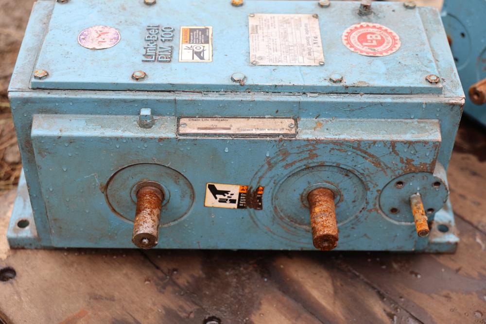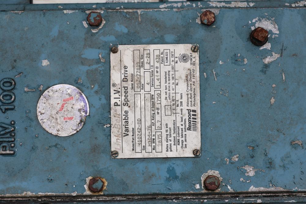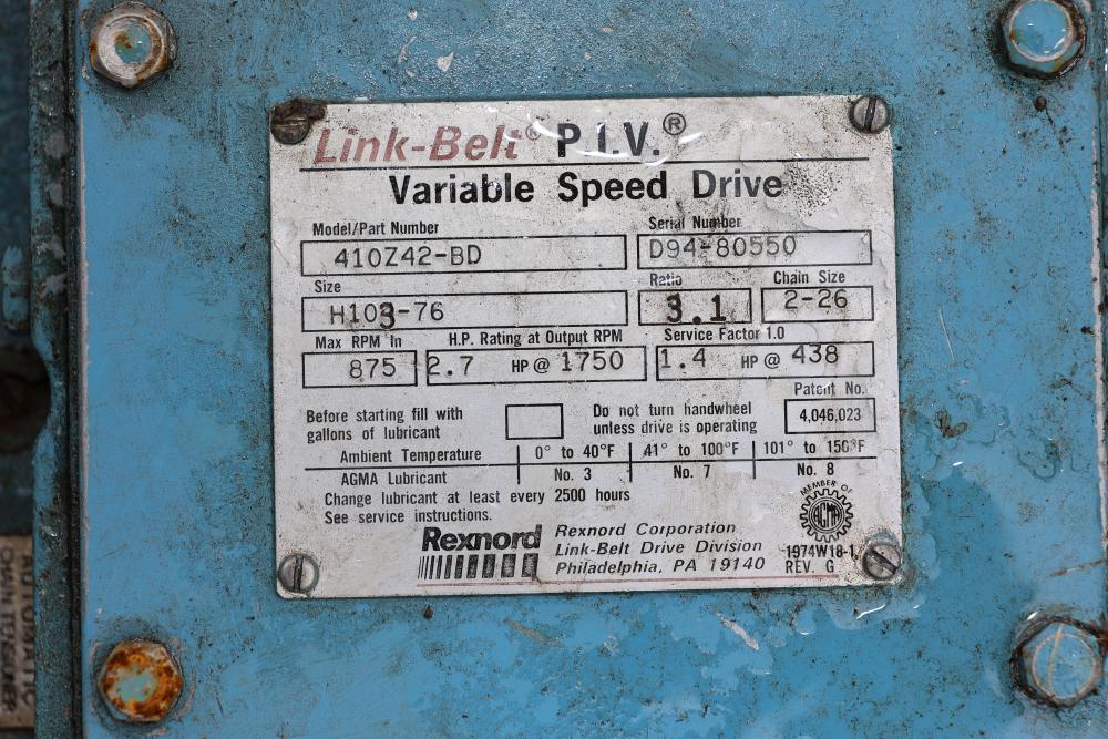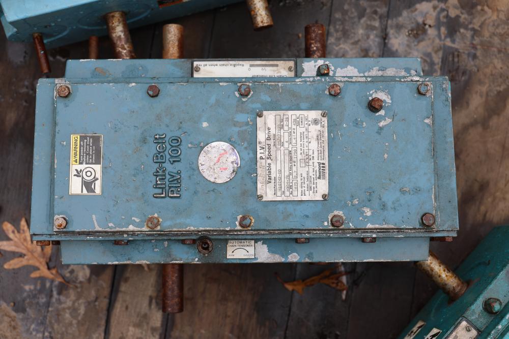 Two Link-Belt PIV 100 Variable Speed Drives with model/part number 410742-BD. Specifications include 875 input RPM, 7.2 HP rating at 1750 RPM, and a 1.44 HP multiplier. Drives feature adjustable speed functionality. Refer to attached plate details for specific technical information. One unit has a broken shaft. Operation unknown. Buyer must take both. Pickup only.