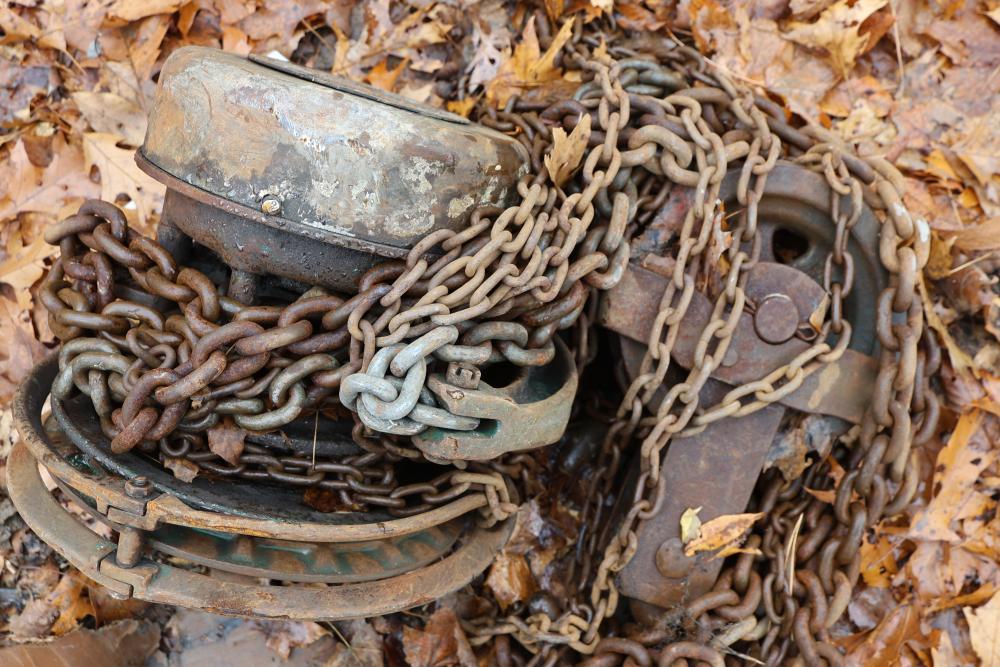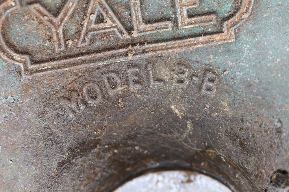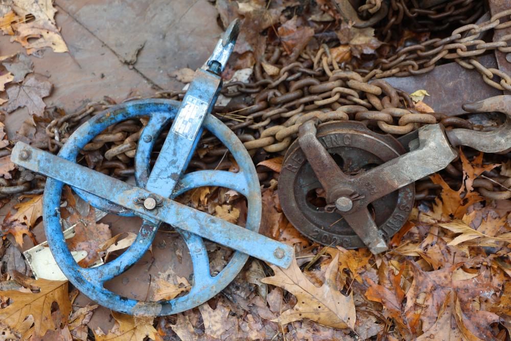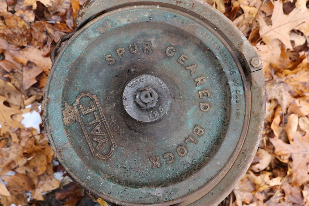 McGraw Edison Brewer-Titchener pulley system and Yale Spur Geared Block with chains. Identifiable details include Yale Model BB with a 2000-pound capacity and McGraw Edison Rope Size RB. Pickup only.
