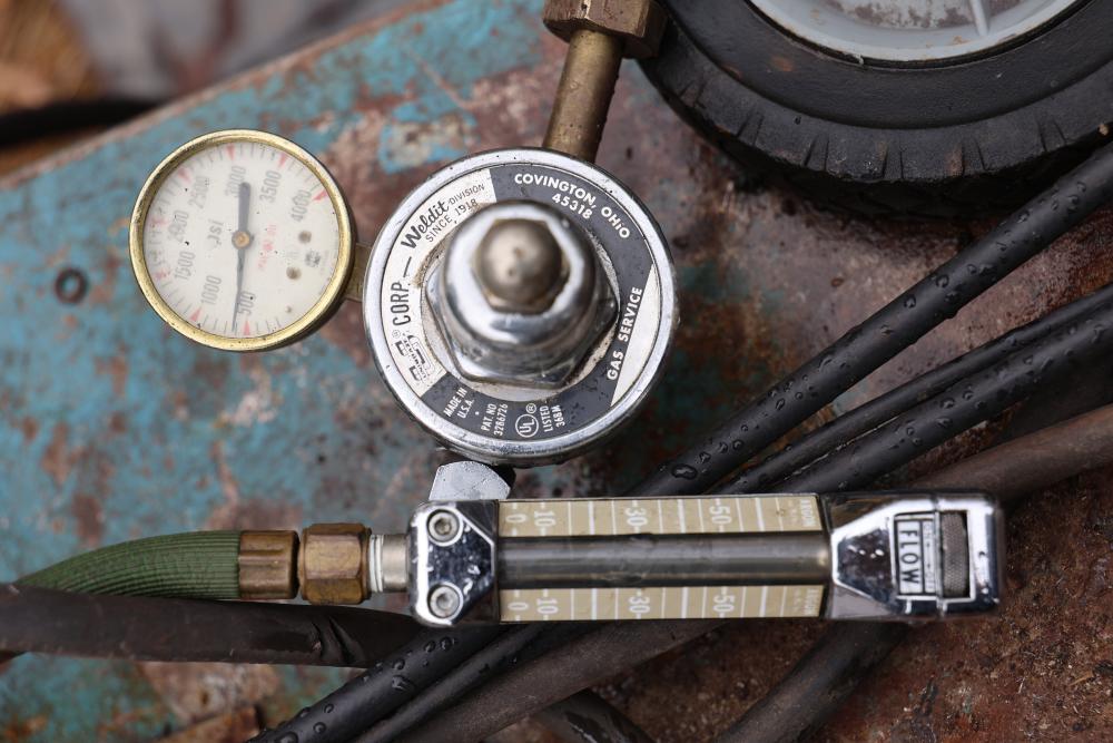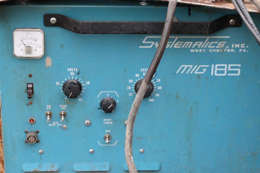 Systematics MIG 185 Welding Machine With Accessories. Includes MIG 185 welding unit, visible internal components, gauges, a plug attached to wires, and a gas cylinder with regulator and additional hoses. This machine and its components are no longer functional. Operation unknown. Buyer is responsible for all help and materials necessary for removal. Open trailer recommended. Pickup only.