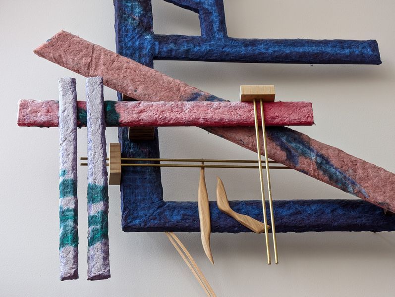 Custom Wall Décor. Wall art from Paradise City juried art show in North Hampton, custom made for seller, approx. 28"Wx28"H. Seller reports, "The artist is Sabra Richards from Honeoye NY. It is handmade with abaca fiber from the Philippines & Chinese cotton fiber. Pure color pigment has been used & the pulp is backed with two-sided birch plywood to prevent any warpage. Solid brass rods & box joints were used. Brazilian tulip wood, mahogany, chatacoke & rosewood were added for structure & texture interest." Will require a tall ladder to remove.
