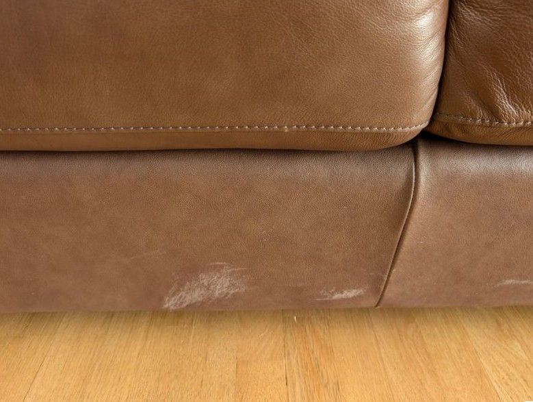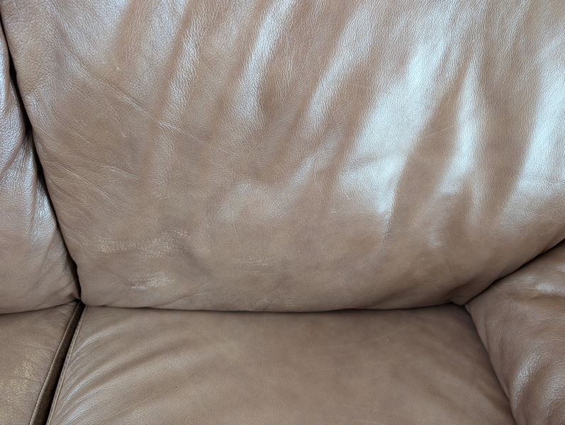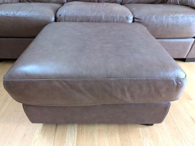 Italian Leather Sofa and Ottoman. Light brown three-seater sofa with matching ottoman by Italsofa, 90"Lx3'Dx34"H with matching rectangle ottoman. Overall good condition, no tears (see photos of surf marks).