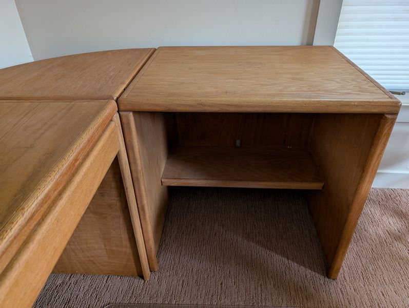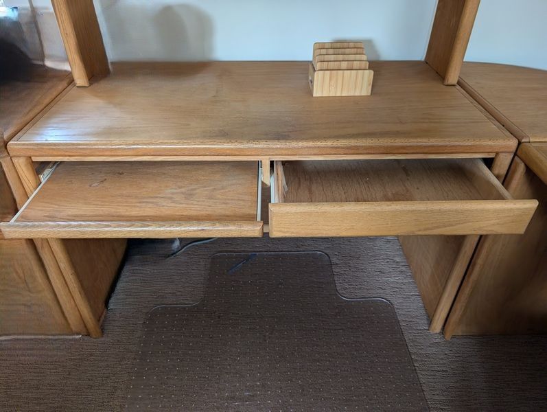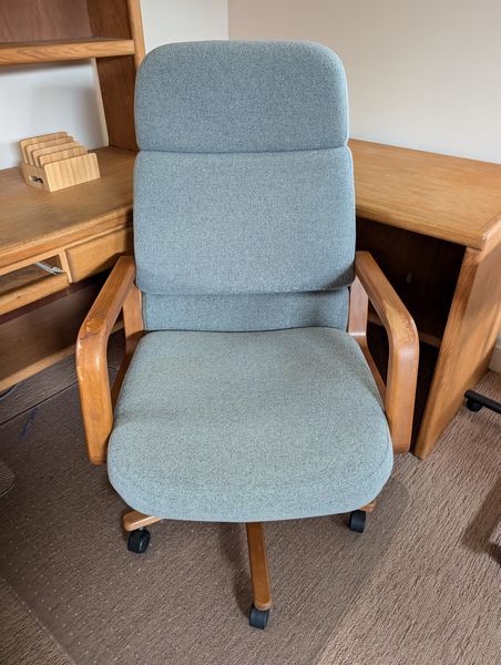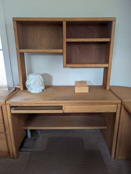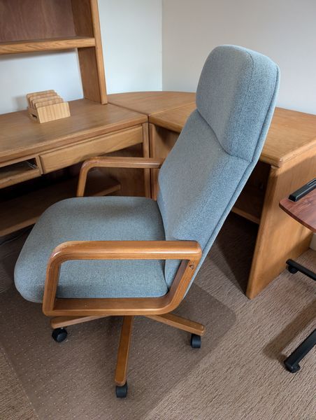 Four Piece Desk, Office Chairs. Four-piece desk set including 4'Wx2'Dx30"H desk with pencil drawer & pull-out tray; side table with shelf, 30"Wx2'Dx30"H, corner connector, 2'D; 34"H hutch; adjustable side table; blue office chair on casters with light wood arms, 25"Wx2'Dx44"H; CPTV director's chair; phone charging station; optional carpet protector.