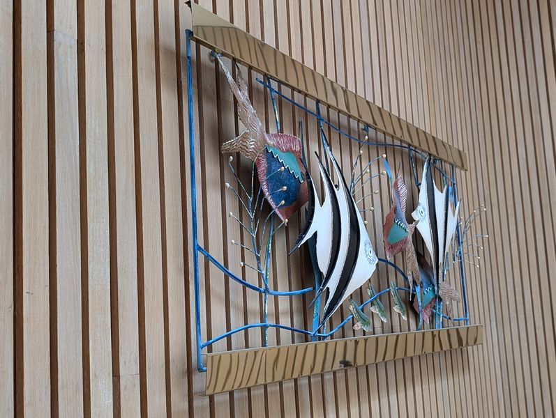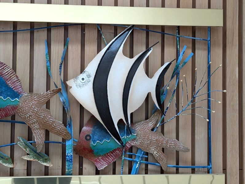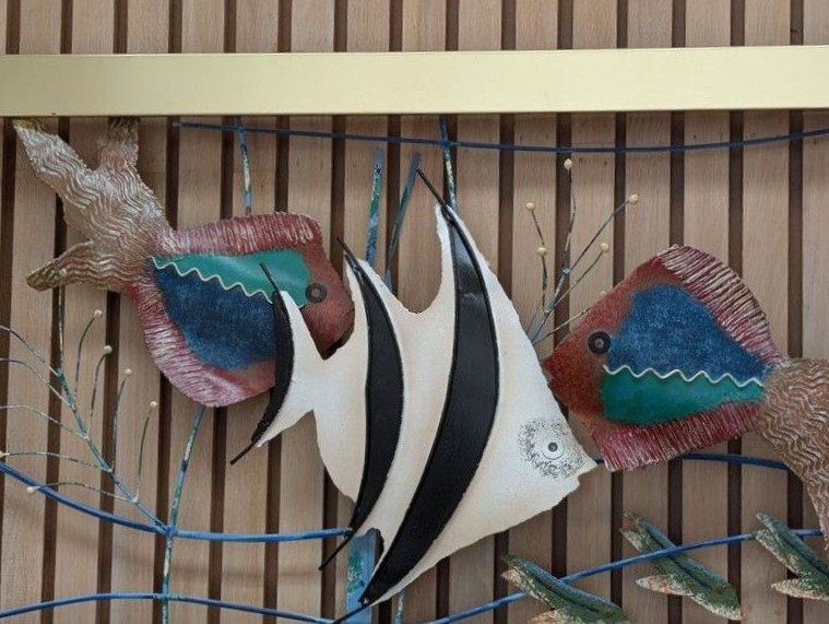 Three-Dimensional Wall Art. Fish-motif 3D wall art in polished brass frame, 51"Wx22"H in a 4" thick frame. Located in the stairwell between main floor & the lower level.