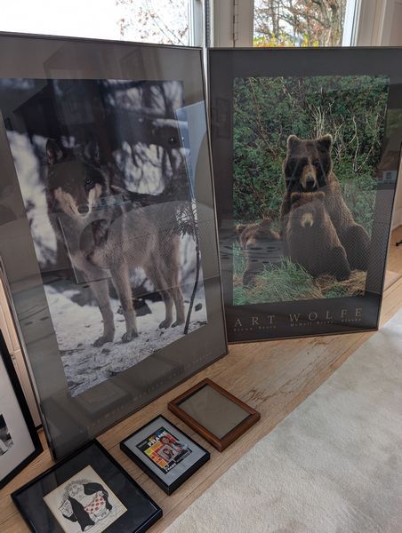 Framed Wall Art, featuring Baseball Photo, Frames. Two framed wildlife posters, ea. 2'Wx3'H; baseball photo for Babe Ruth & Lou Gehrig; small framed wall art, two picture frames.