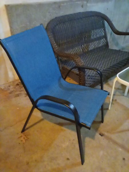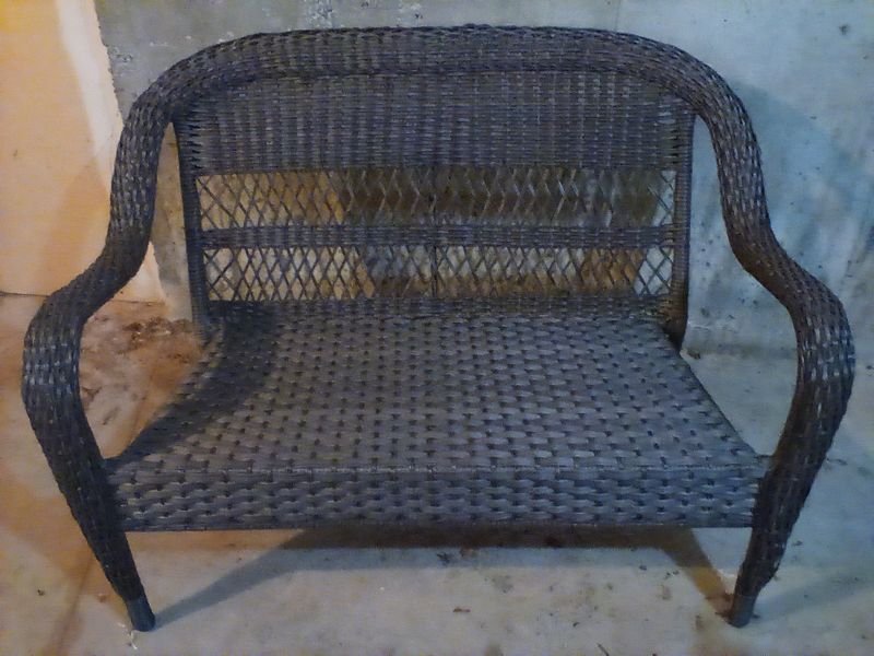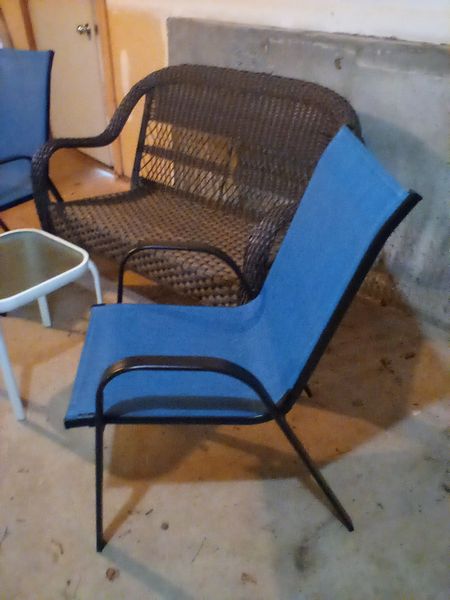 Outdoor Furniture. Incl: resin two-seater bench, 47"Wx18"Dx35"H; pair of blue nesting canvas & black metal armchairs; white glass top side table. Located under the house in basement storage, Access from outside, back of house.
