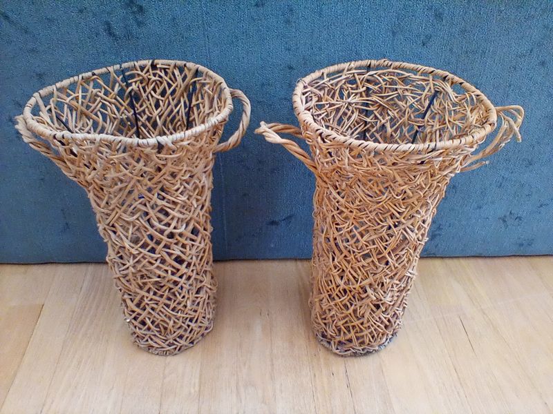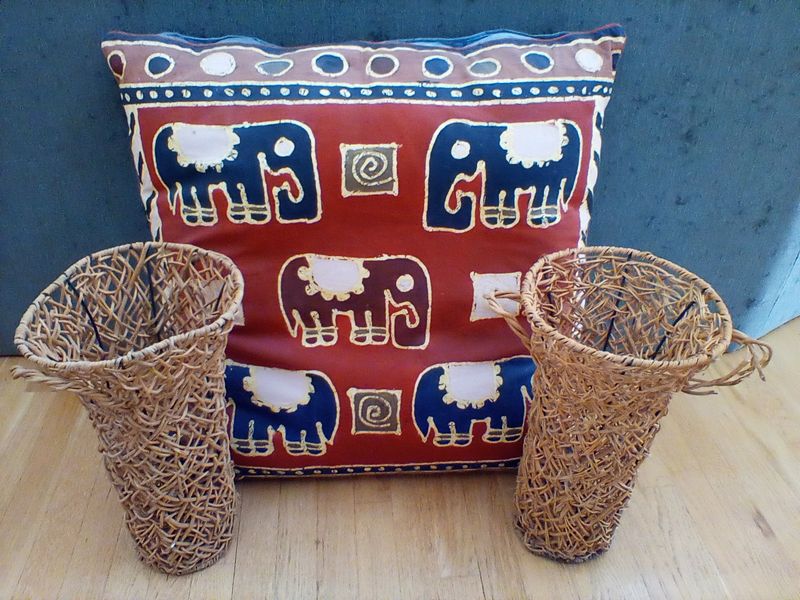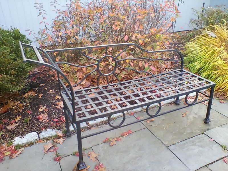 Iron Bench, Pillow, Décor. Iron outdoor bench, sleigh-style, 57"Lx19"Wx38"H with gr removable cushion (not photographed); oversized reversible pillow, 28"sq; pair of wicker handle vessels, ea. 17"H.