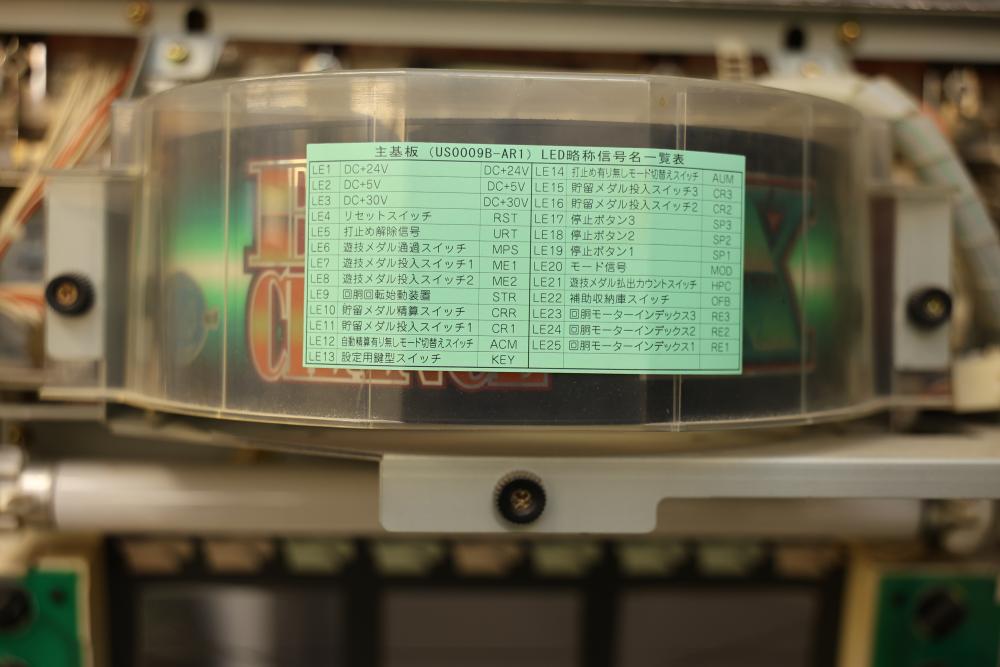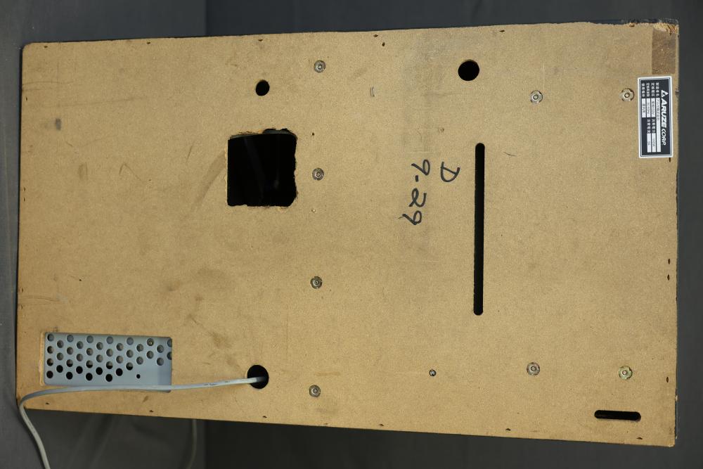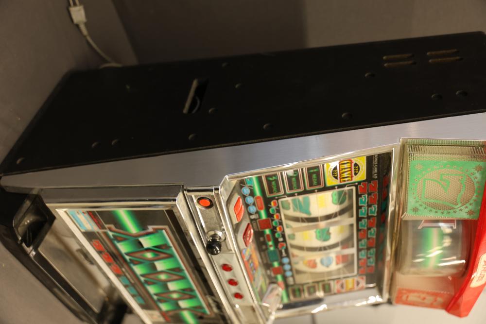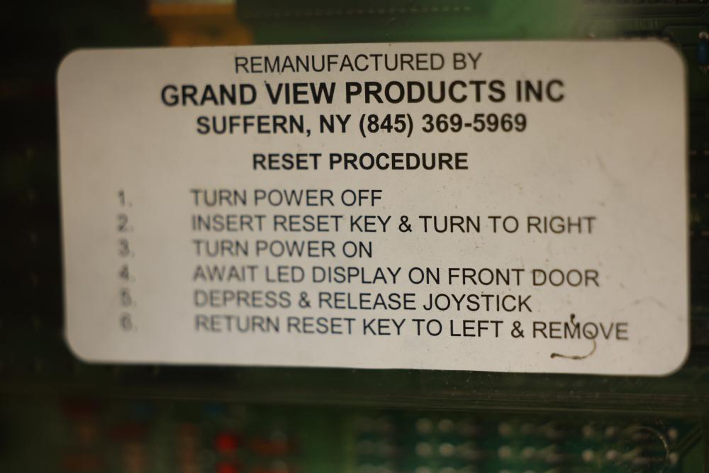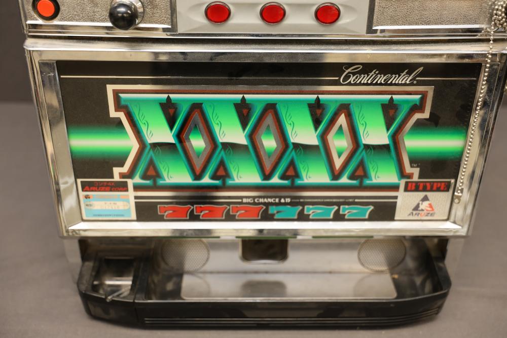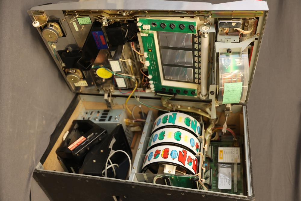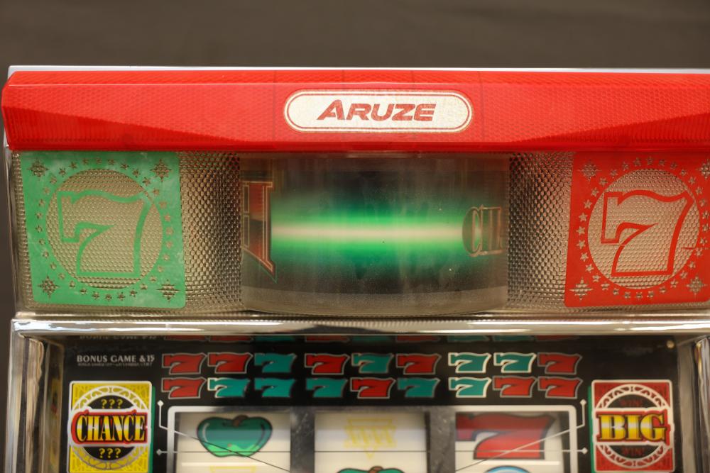 Aruze Corporation slot machine featuring internal components, visible circuitry, and mechanical parts. Includes a set of tokens for operation. The machine has a control panel with various buttons and visual indicators, as well as digital display screens. Remanufactured by Grand View Products Inc with operational instructions provided on the interior label. Pickup only.