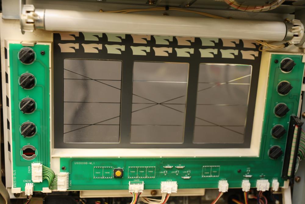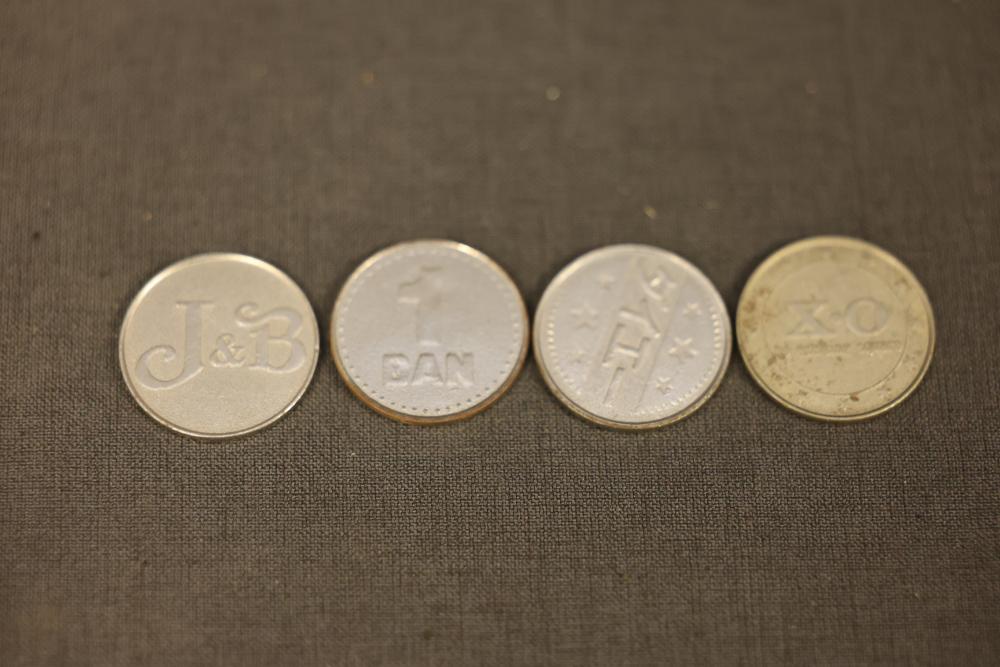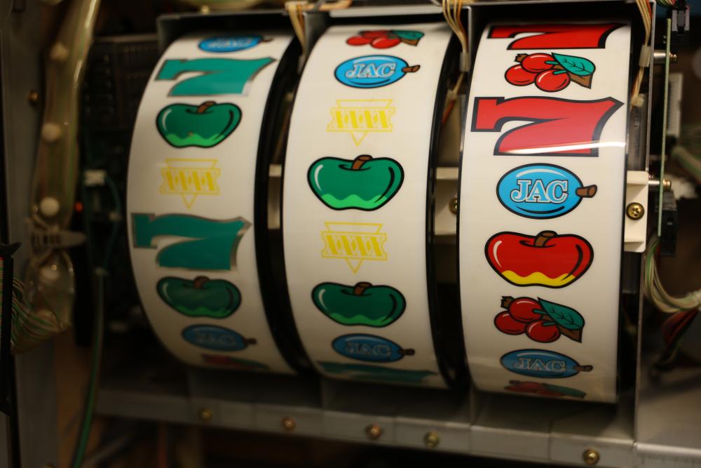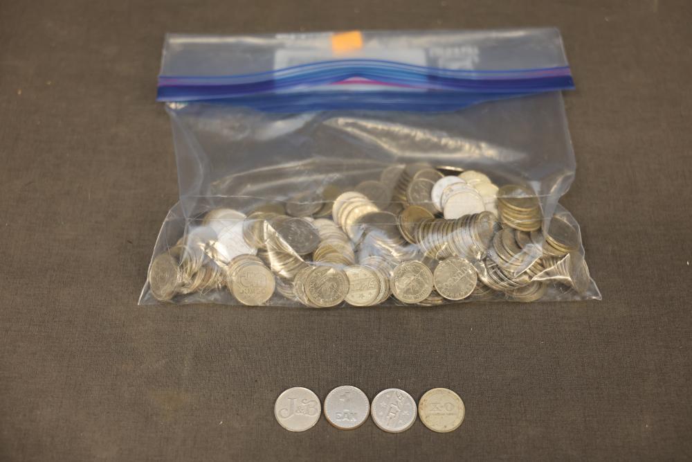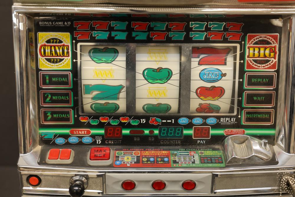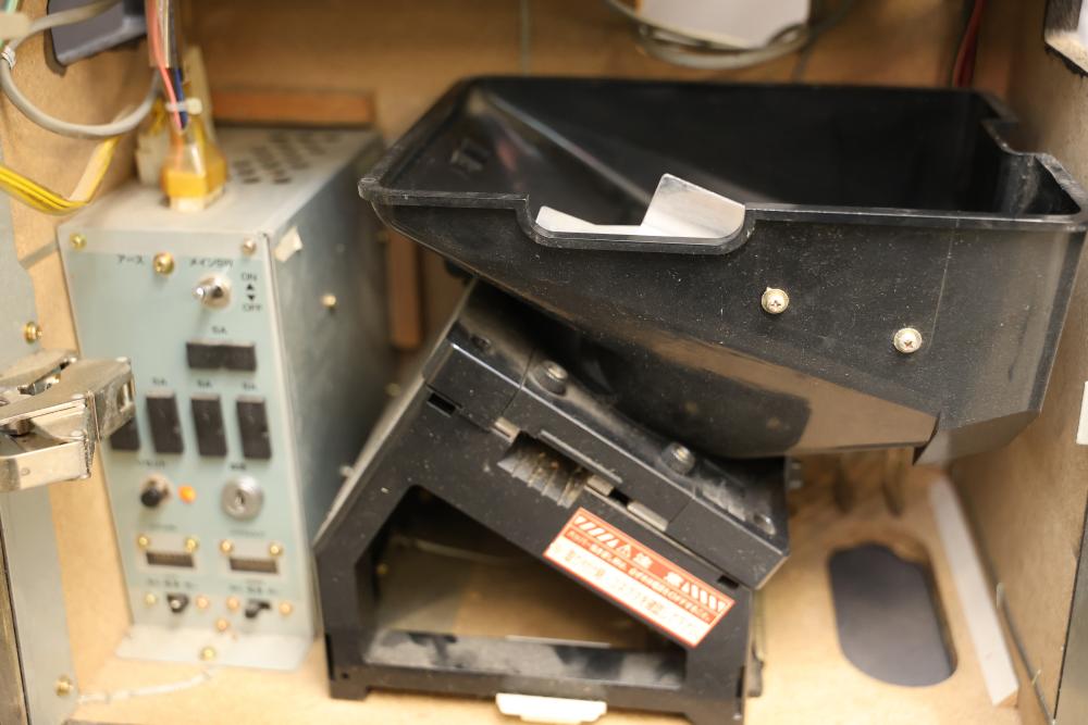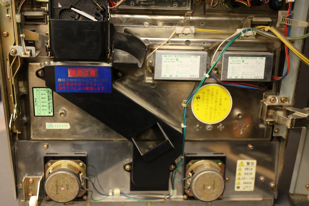 Aruze Corporation slot machine featuring internal components, visible circuitry, and mechanical parts. Includes a set of tokens for operation. The machine has a control panel with various buttons and visual indicators, as well as digital display screens. Remanufactured by Grand View Products Inc with operational instructions provided on the interior label. Pickup only.
