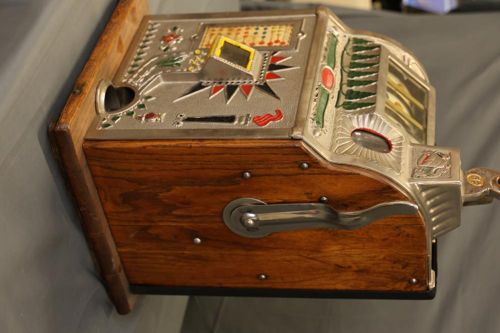 Mills Goose Neck Slot Machine with Chrome and Wood Case. Featuring a chrome front panel with ornate detailing and colorful graphics, including trees, a torch, and a payout chart. Inner mechanisms exposed in some images include three spinning reels with fruit graphics, payout slots, and coin collection bin. Wood side panels and sturdy base show wear consistent with age. Not tested for functionality. Pickup only.