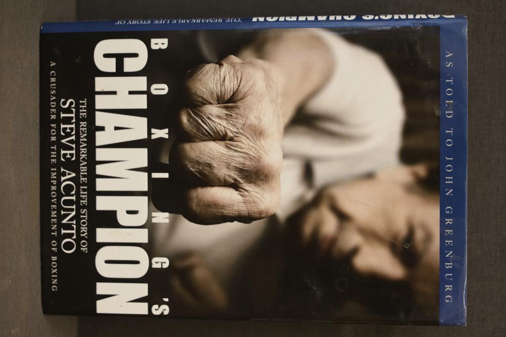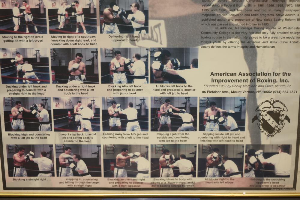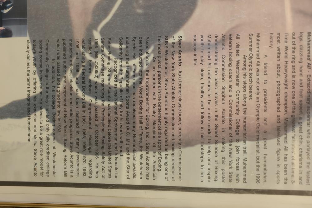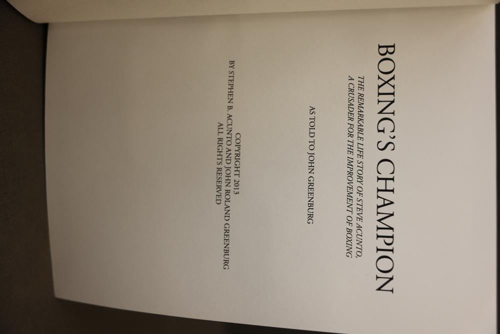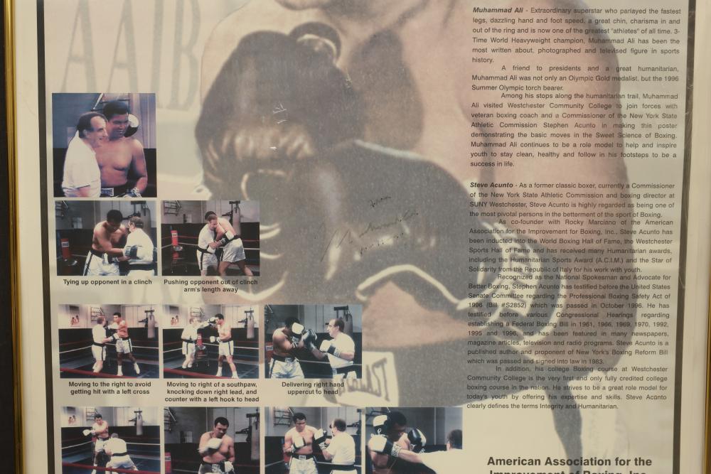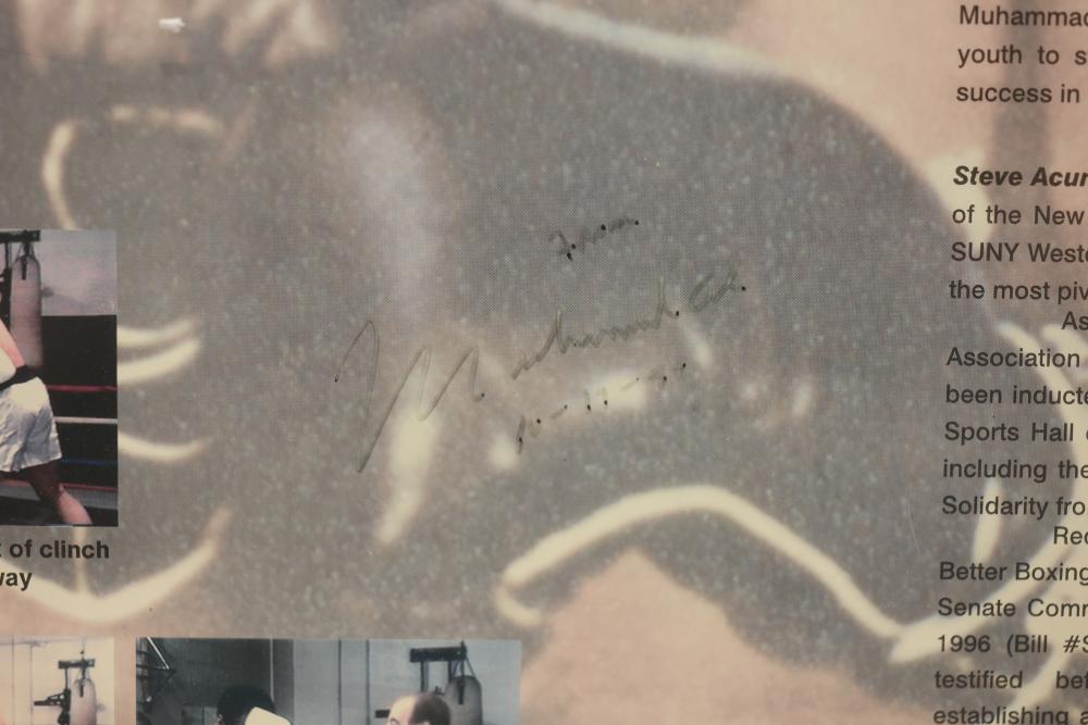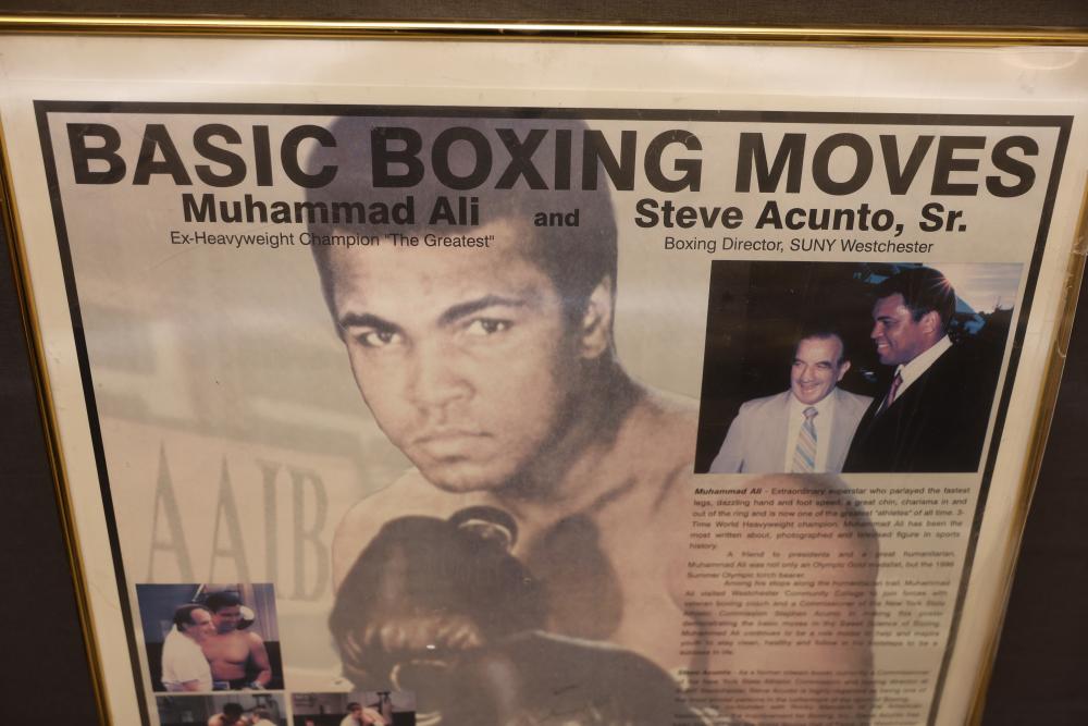 Framed boxing poster titled 'Basic Boxing Moves' featuring Muhammad Ali and Steve Acunto, Sr., including imagery and instructional details. The frame also contains a signature from Muhammad Ali. Accompanying the poster is a signed copy of the book 'Boxing's Champion: The Remarkable Life Story of Steve Acunto Sr.' by Stephen B. Acunto and John Greenburg. Pickup only.