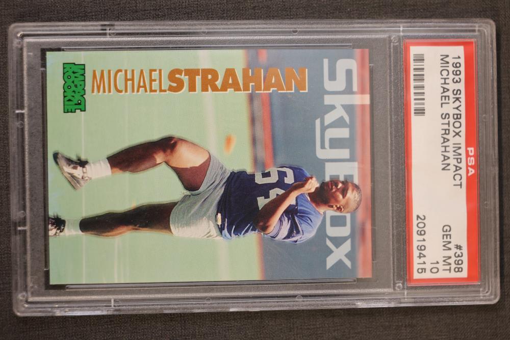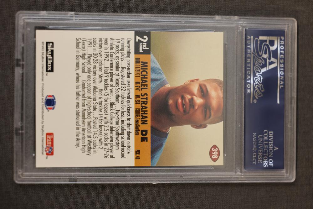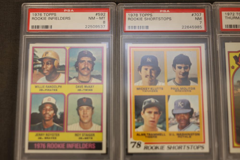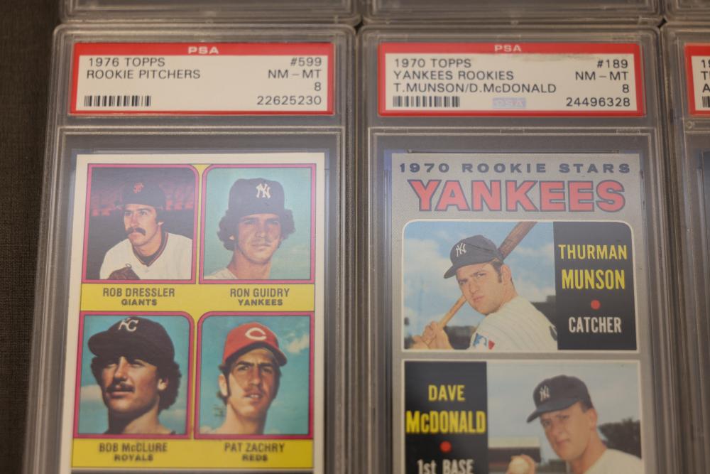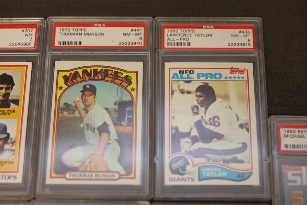 PSA-graded sports trading cards featuring multiple rookie and all-star players, including cards from 1976, 1978, 1982, and 1993. Highlights include Thurman Munson, Lawrence Taylor, Michael Strahan, and others. Cards are encapsulated for preservation with labels indicating grades. Pickup only.