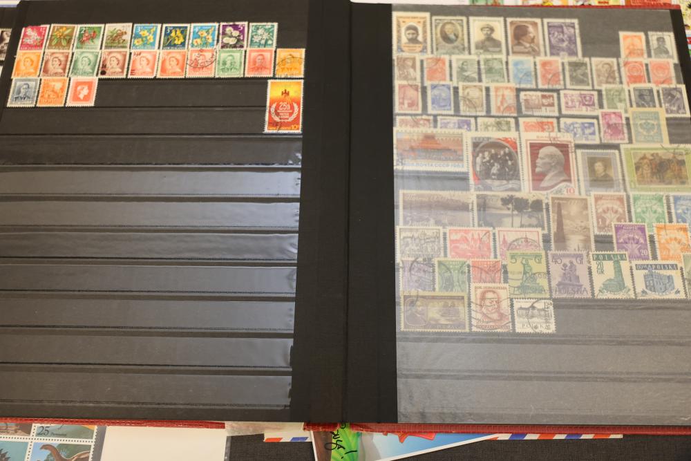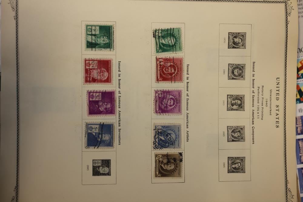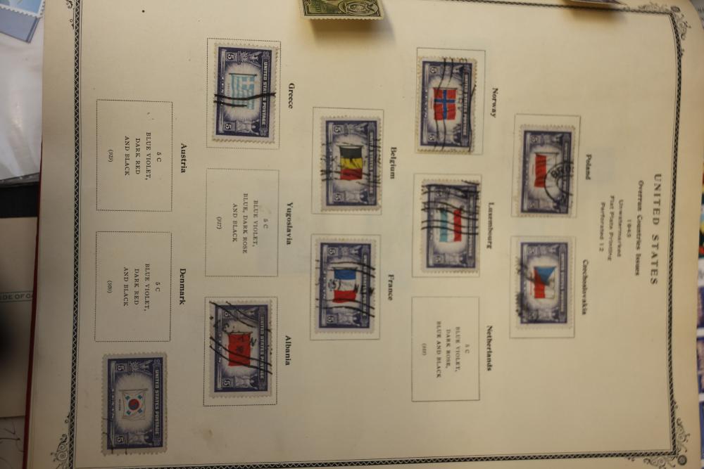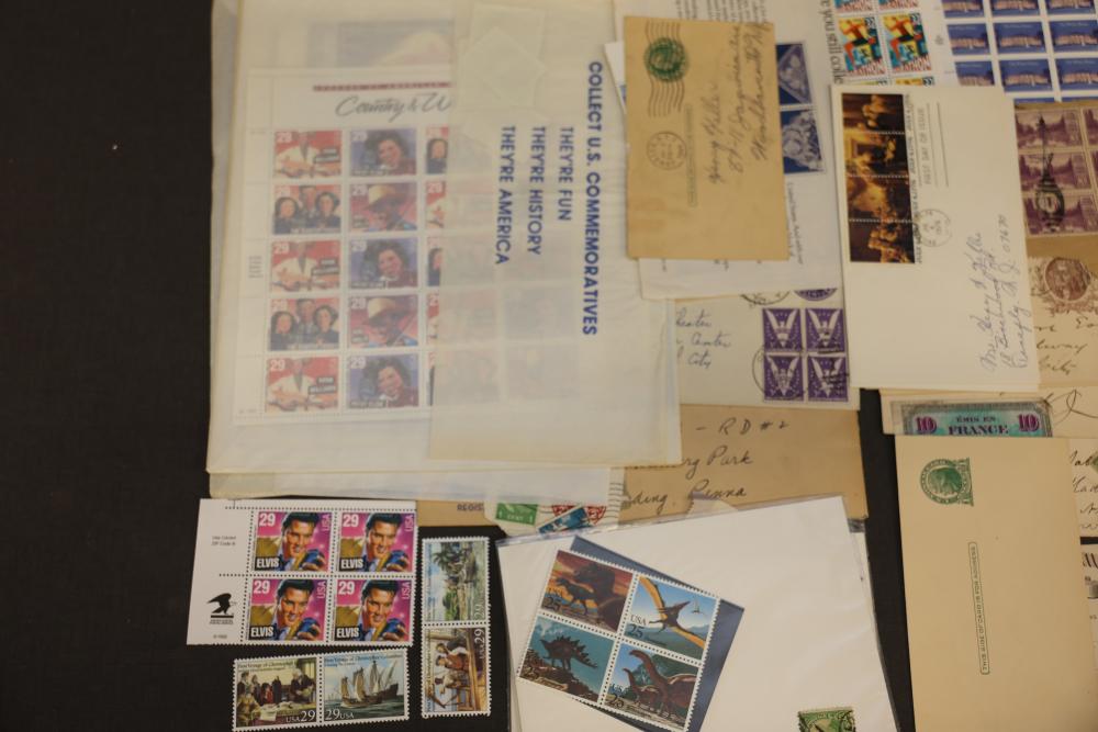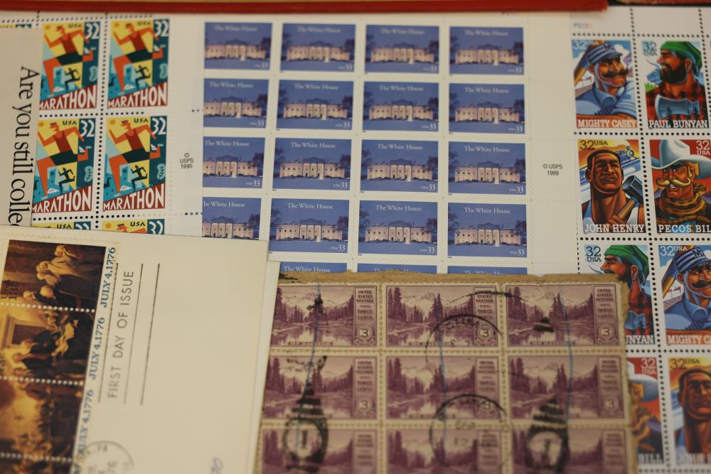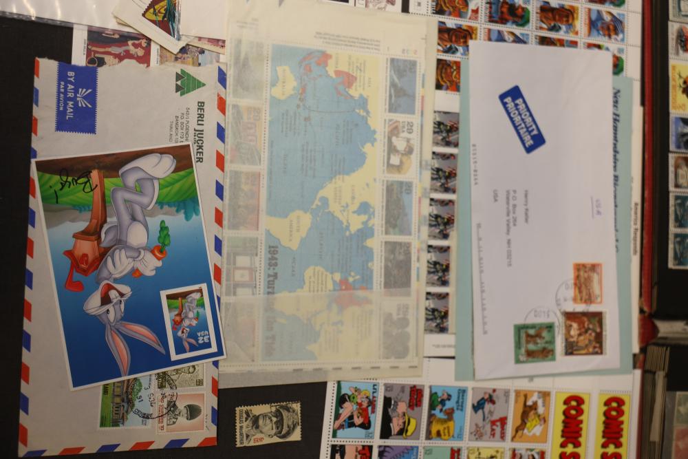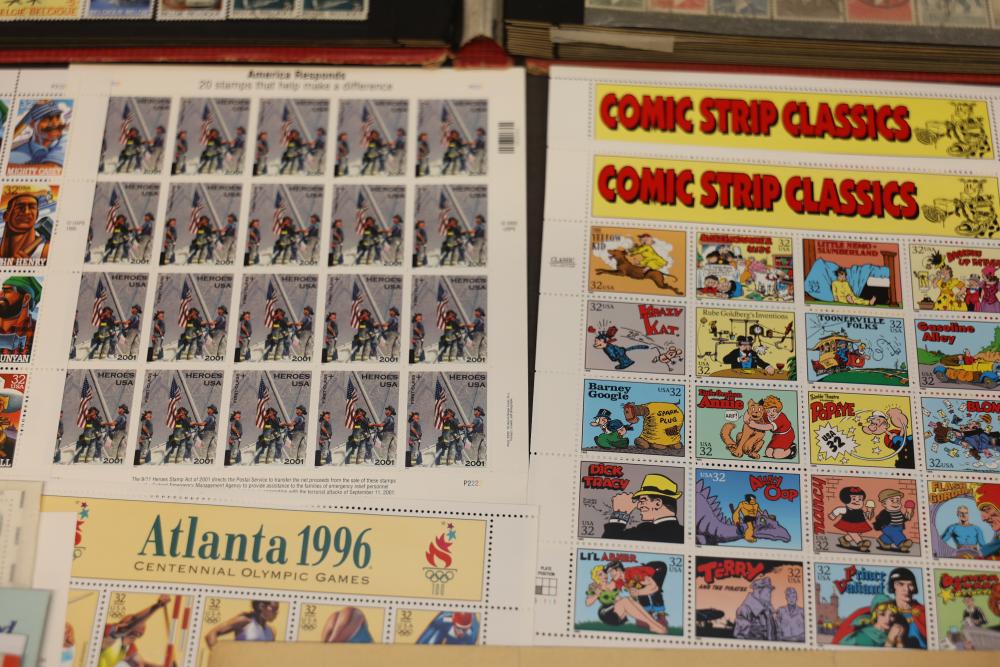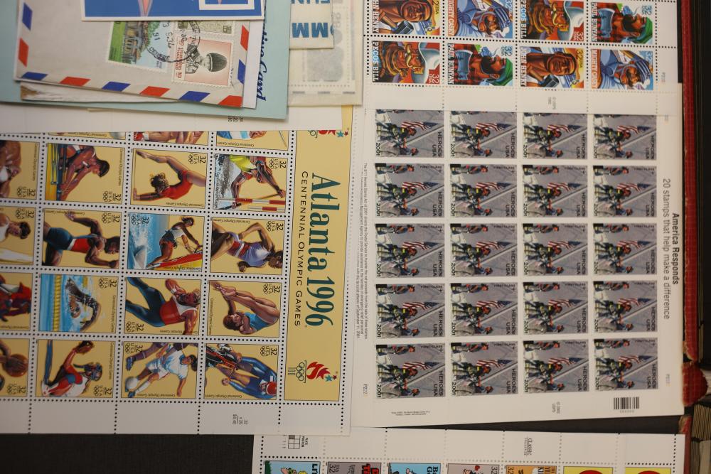 Stamps featuring Comic Strip Classics including characters like Blondie and Dick Tracy, Atlanta 1996 Olympic Games with sports scenes, U.S. historical themes, international stamps, and commemorative first-day covers. Collection includes full sheets, partially used stamp books, and envelopes with commemorative postmarks. Pickup only.
