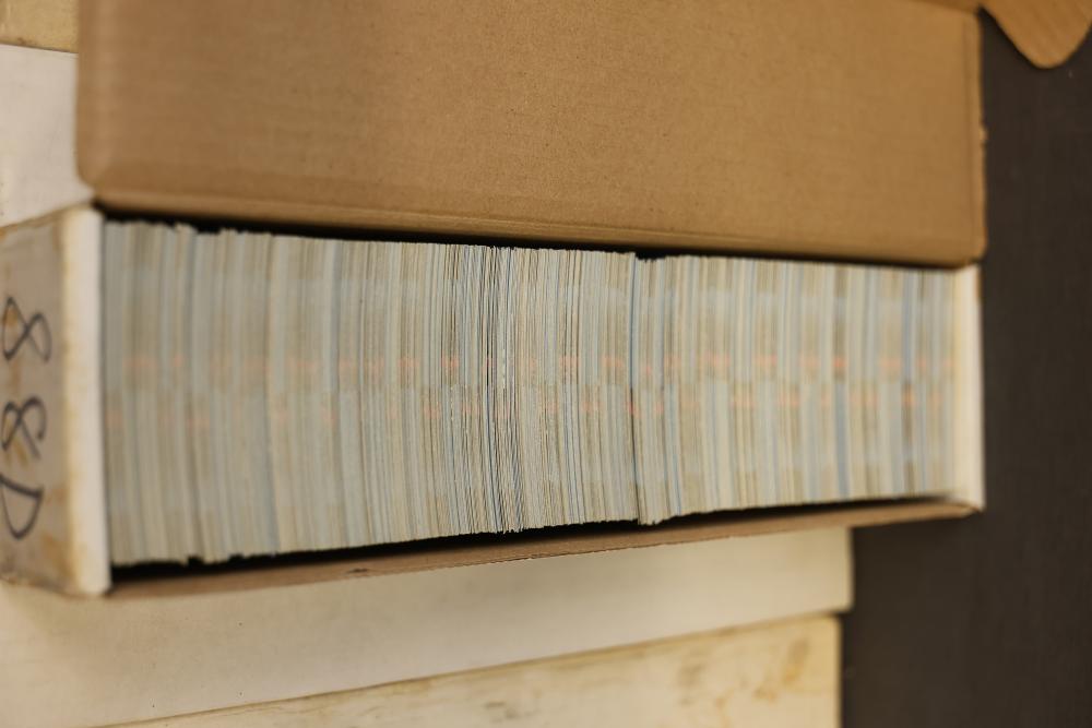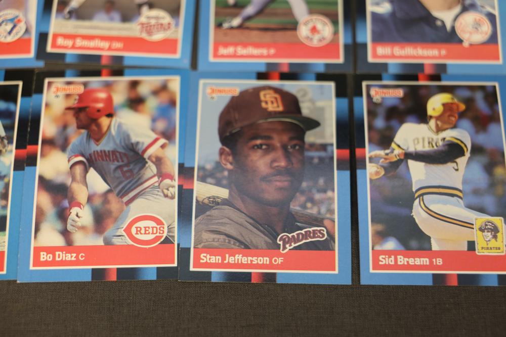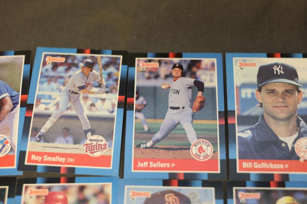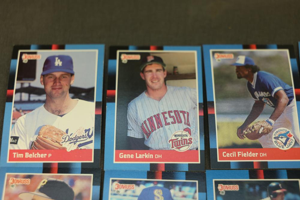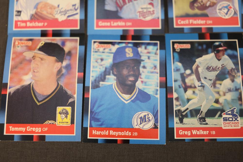Baseball Cards From the 1988 Donruss Series Set. Includes multiple cards organized in labeled boxes with visible individual cards featuring players such as Tim Belcher and Harold Reynolds. Cards are shown stored in boxes marked '88D,' indicating the 1988 Donruss series. Pickup only.