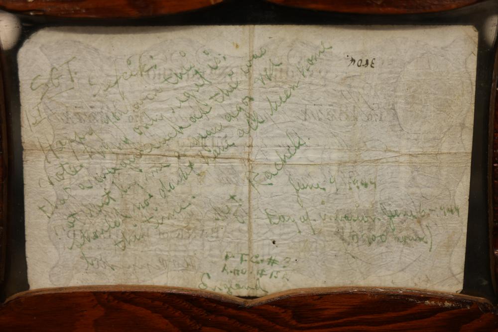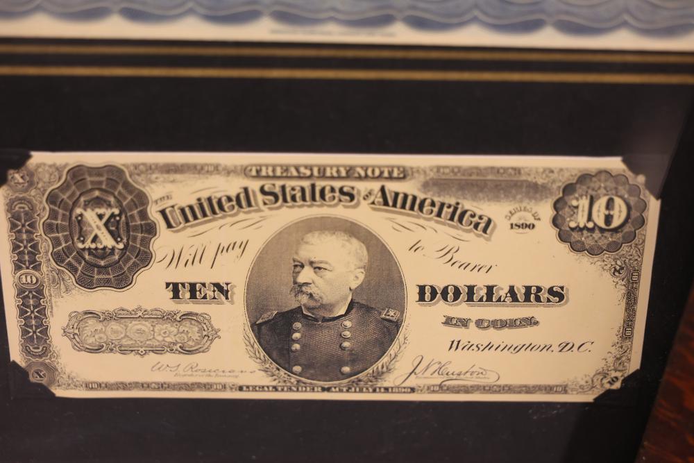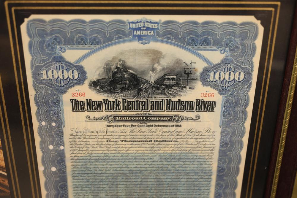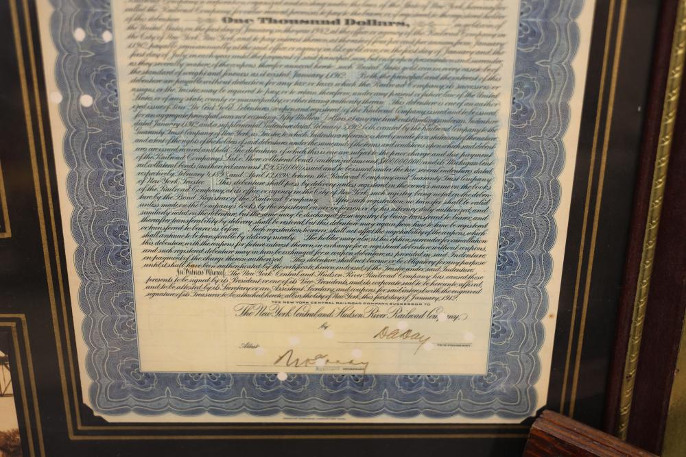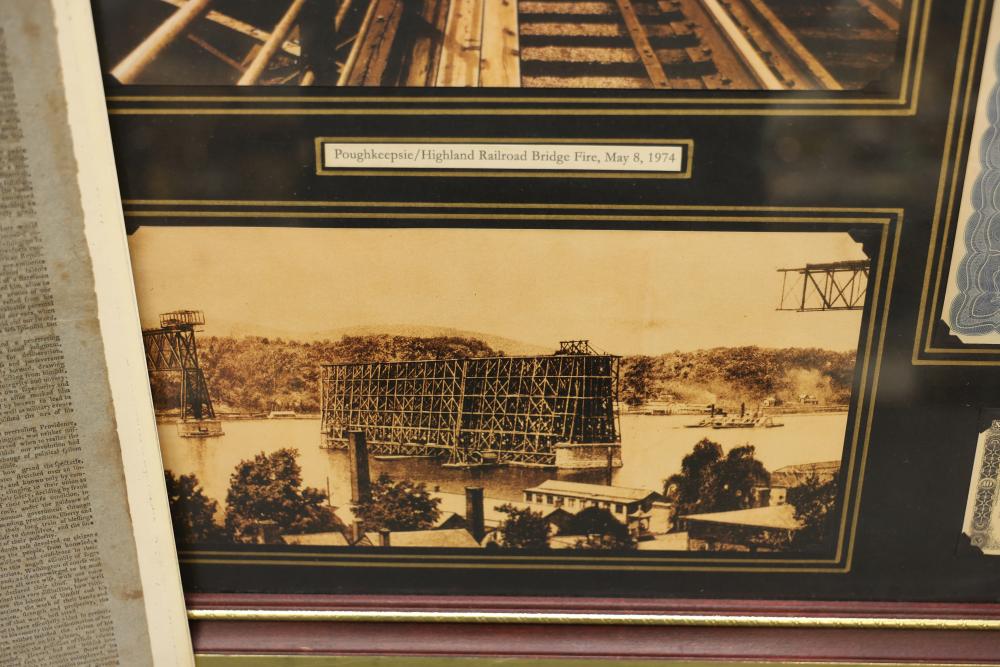 Framed New York Central & Hudson River Stock Certificate With Additional Items. Includes a framed $1,000 stock certificate accompanied by a $10 U.S. Treasury note and a £5 Bank of England note contained in wooden frames. Also contains imagery featuring the Poughkeepsie Highland Railroad Bridge Fire and a Windham Herald newspaper publication. Pickup only.