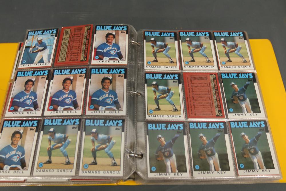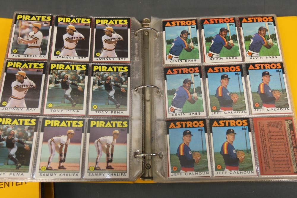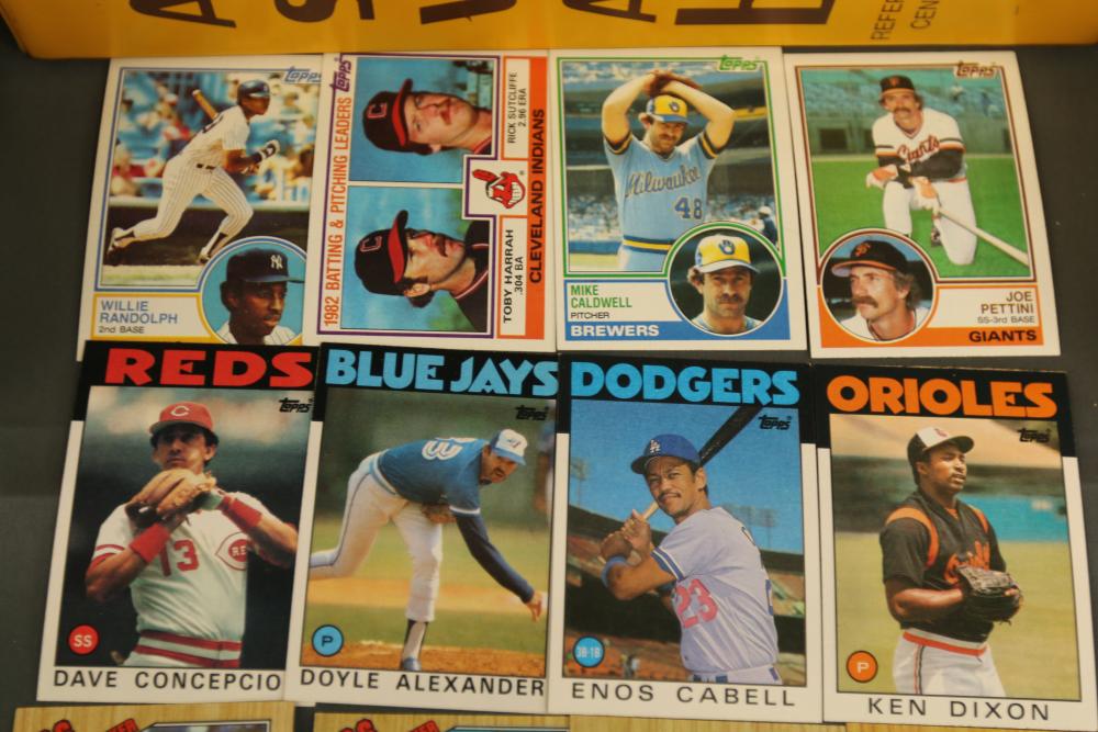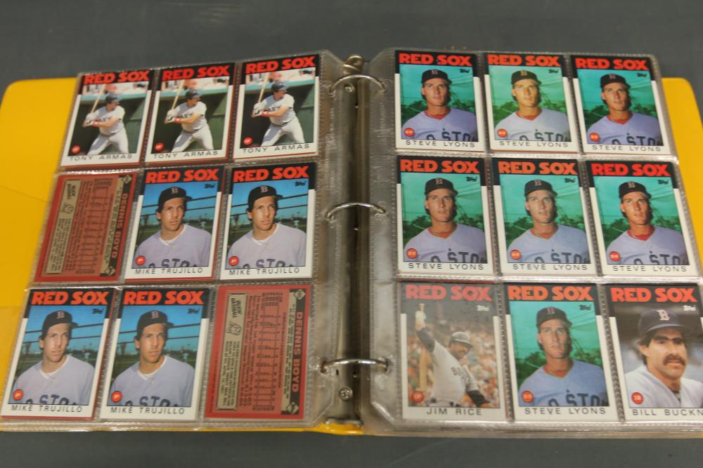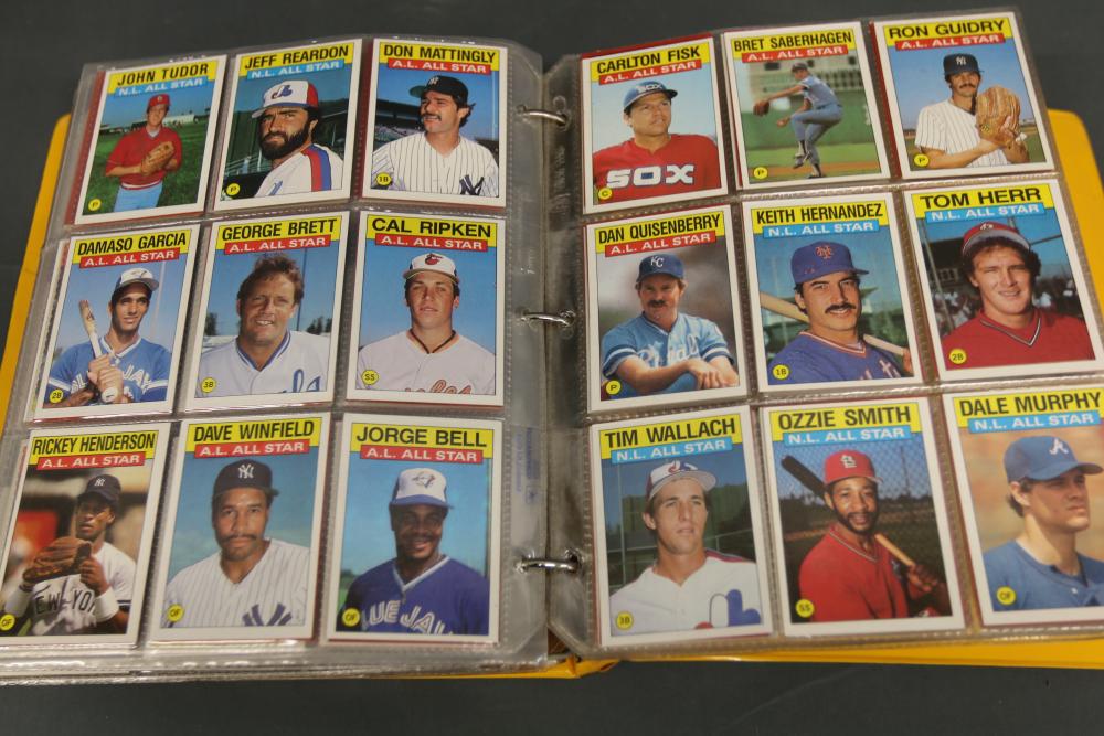 Baseball cards from Topps 1983 series, Topps 1986 series, Topps 1987 series, and Topps 1991 series. Cards are stored in binders and boxes, featuring various teams and players. Includes All-Star cards and key players of those years. Cards appear to be organized by team and series. Pickup only.