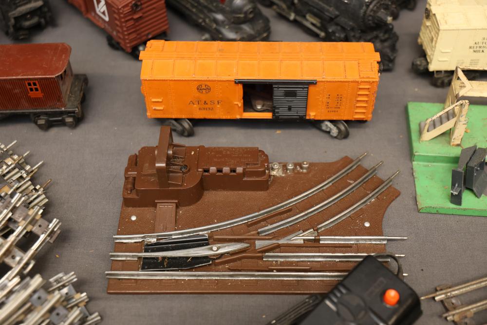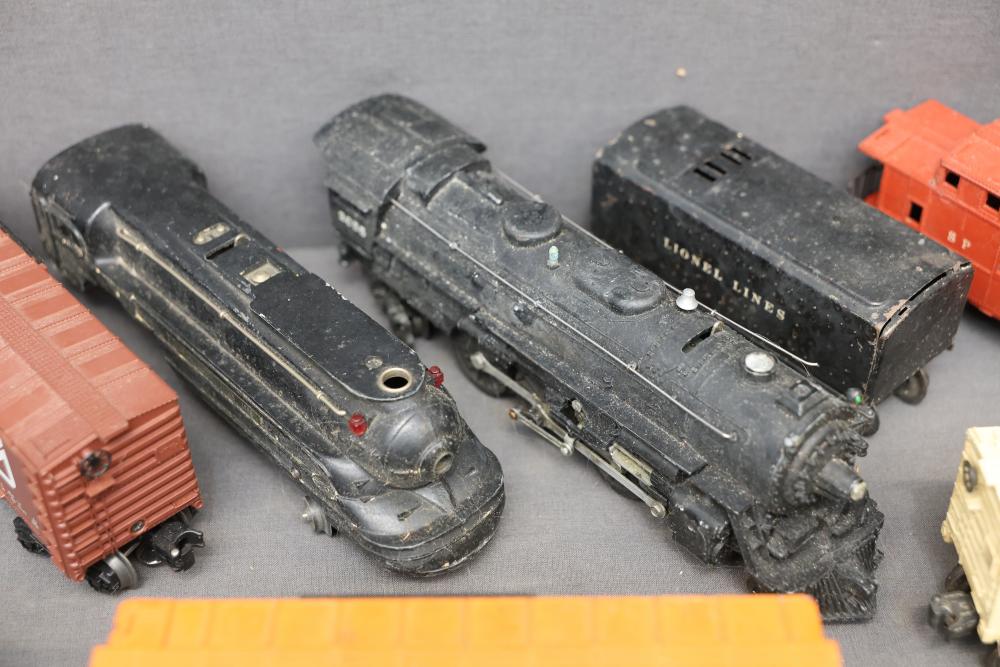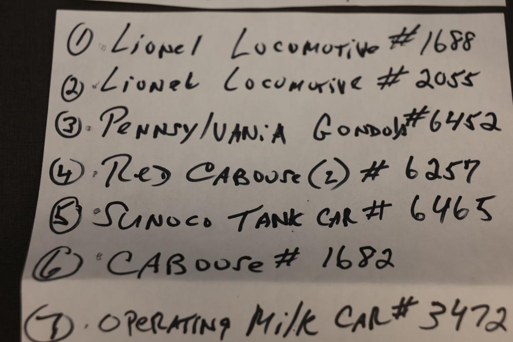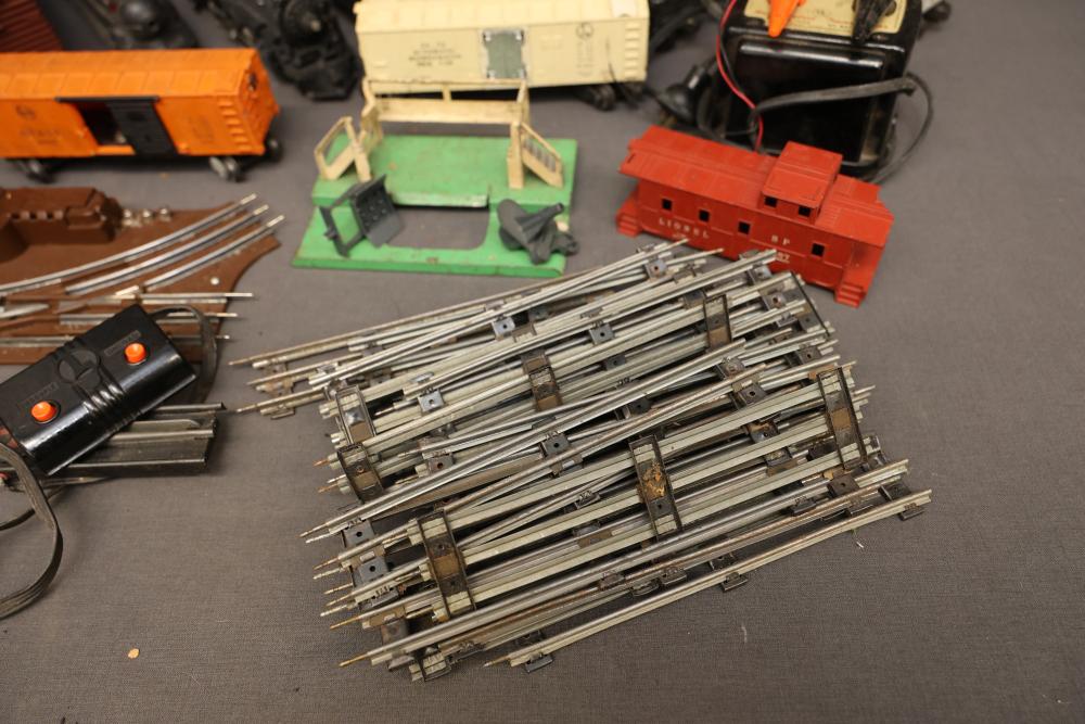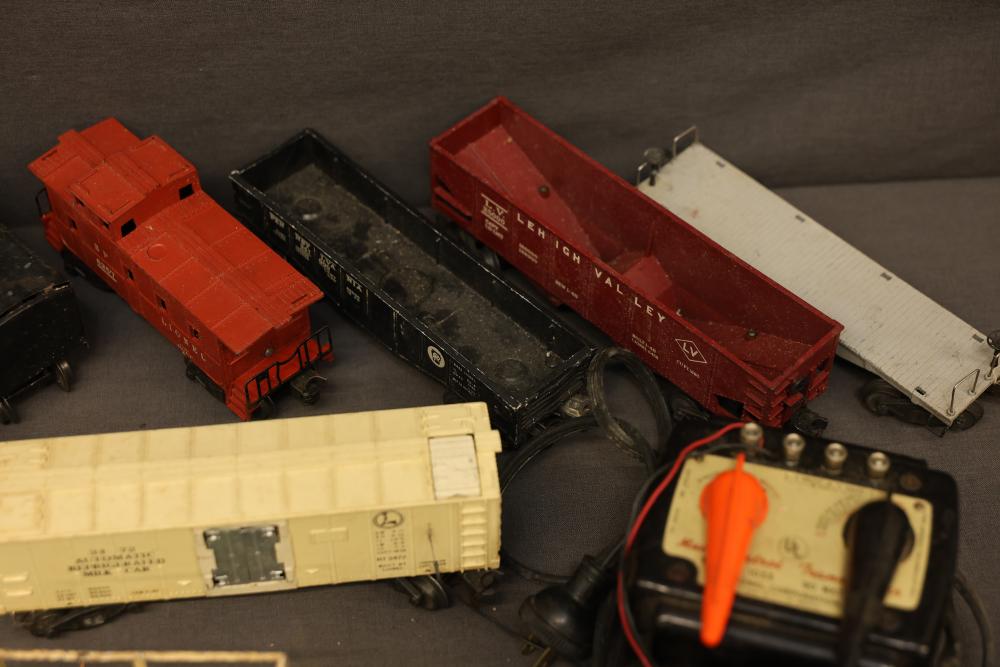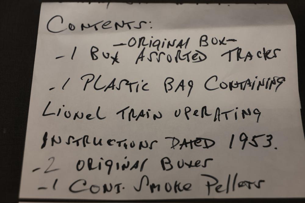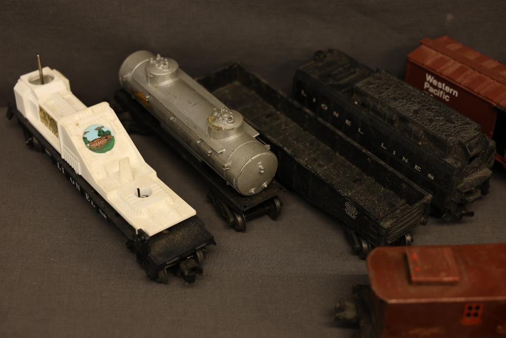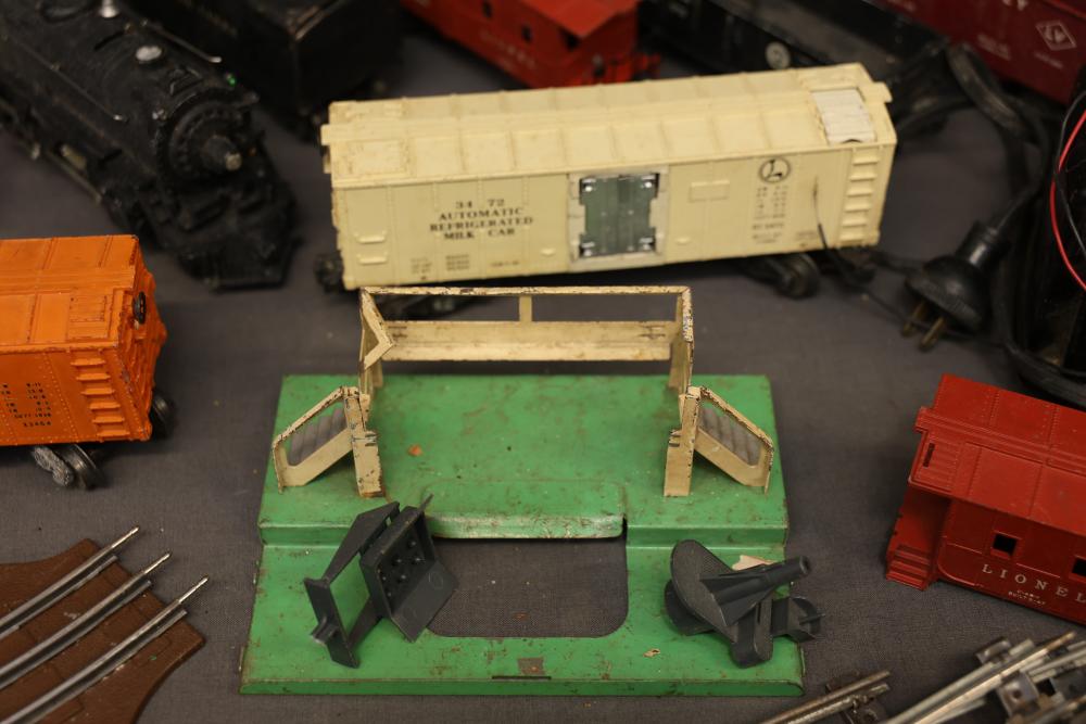 Lionel Train Set with Locomotives, Cars, Transformer, and Accessories. Includes Lionel Locomotive #2331, Lionel Locomotive #2055, Pennsylvania Gondola #6452, Red Caboose #6257, Sunoco Tank Car #6465, Caboose #1682, Operating Milk Car #3472, Operating T.V. Car #16670, Central Operating Box Car #3464, Black Tender #1689T, Western Pacific Box Car #9452, Hopper Car #6456, Transformer #1033, Milk Car with Platform #3472, Gondola Car #6462, Turnout Switch #5121, Remote Control Track #6019, and Whistle/Blower Box Car #2046W. Includes additional tracks, accessories, and documents. Pickup only.