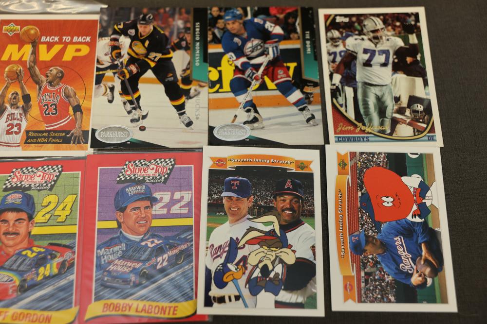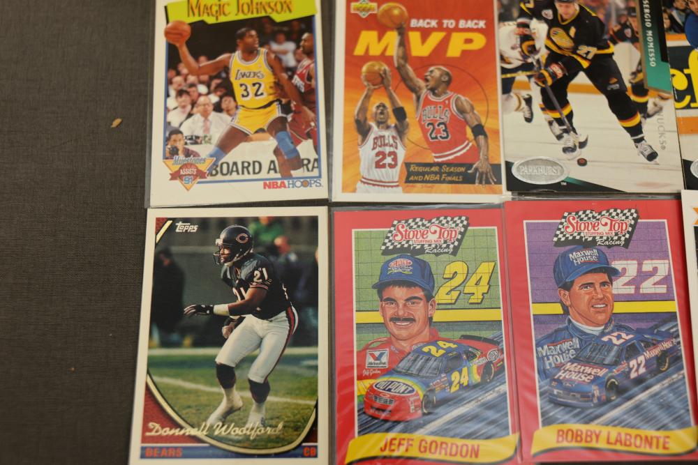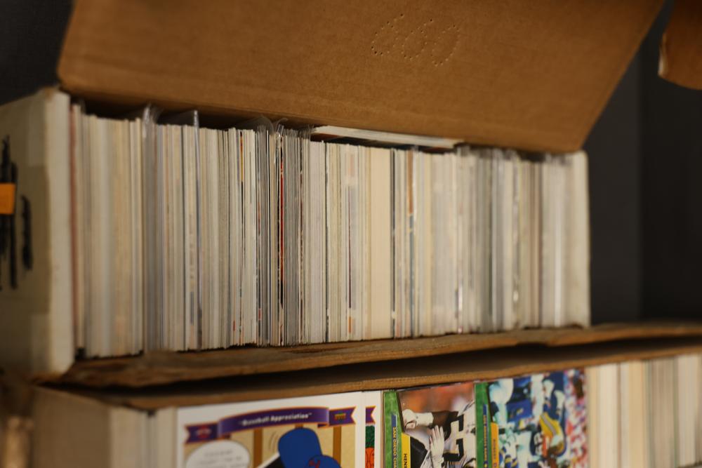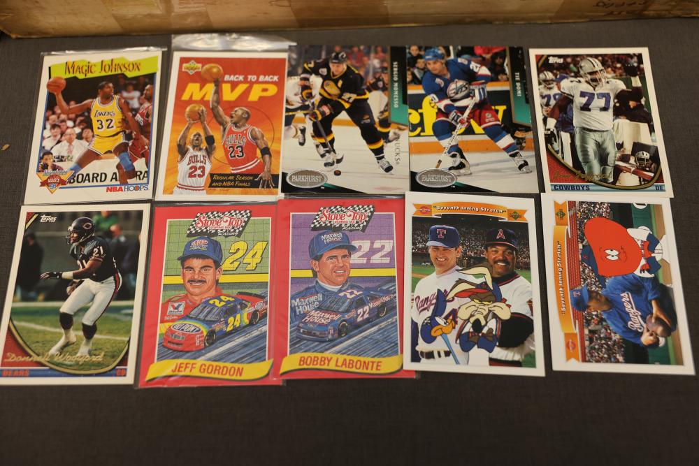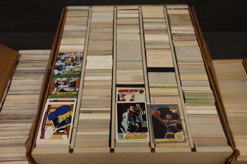 Sports Cards Featuring Baseball, Football, Basketball, and Hockey. Includes a large quantity of cards organized in boxes, spanning various teams and players. Cards are from multiple eras and cover different aspects of these sports genres. Pickup only.
