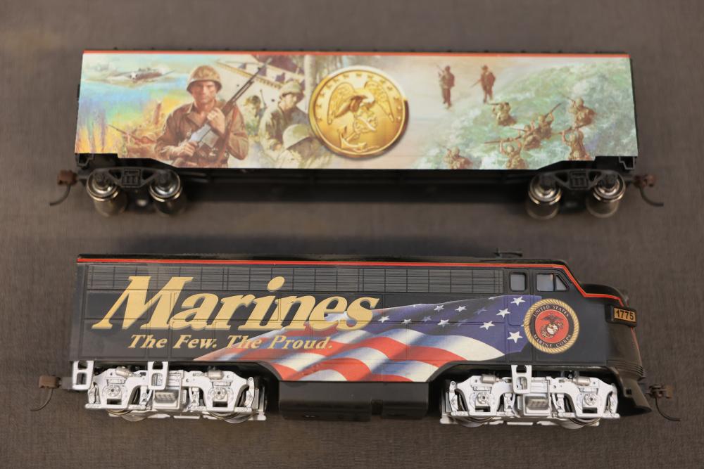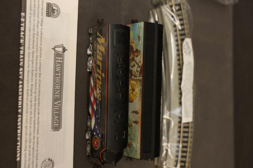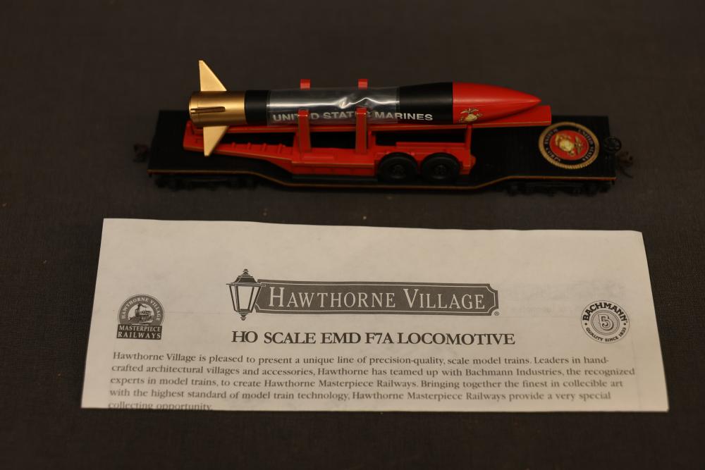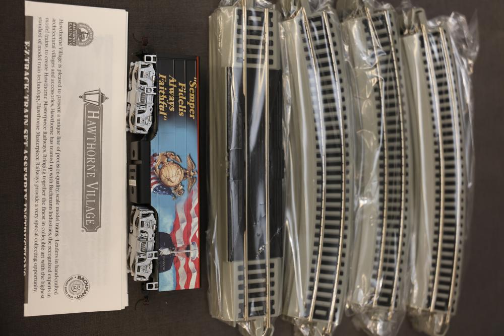 Hawthorne Village HO Scale Train Collectibles Featuring U.S. Marines Theme. Includes a locomotive, cars with detailed military artwork, track sections, and a power controller. Pieces come with documentation and appear to be in unused, packaged condition. Pickup only.