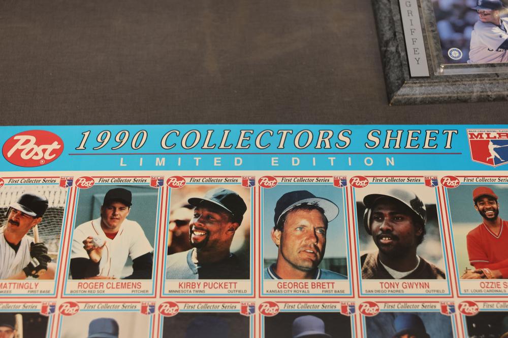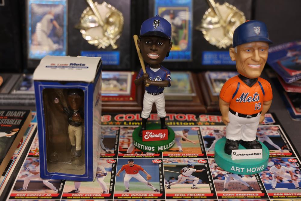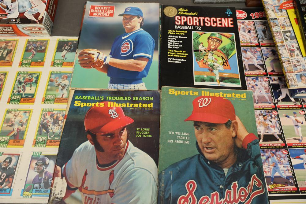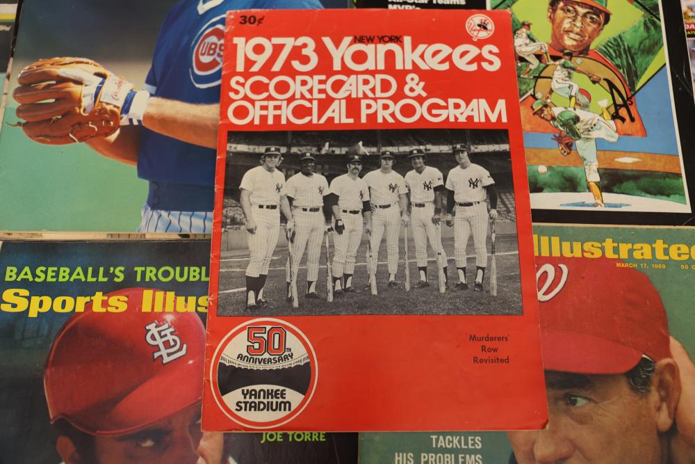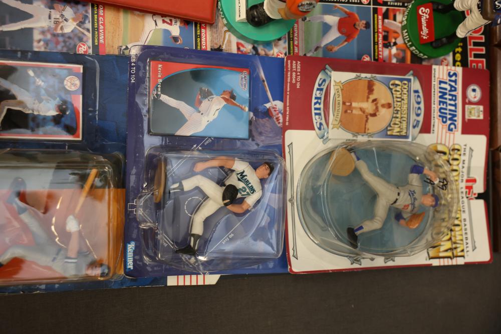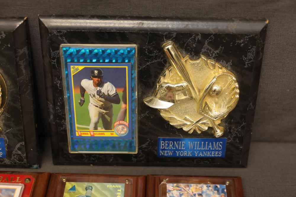 Sports Memorabilia Featuring Plaques, Figures, and Cards. Includes commemorative plaques of baseball players such as Andy Pettitte and Bernie Williams, bobblehead figures, action figures, collector cards, and magazines. Highlights cover various players and events. Pickup only.
