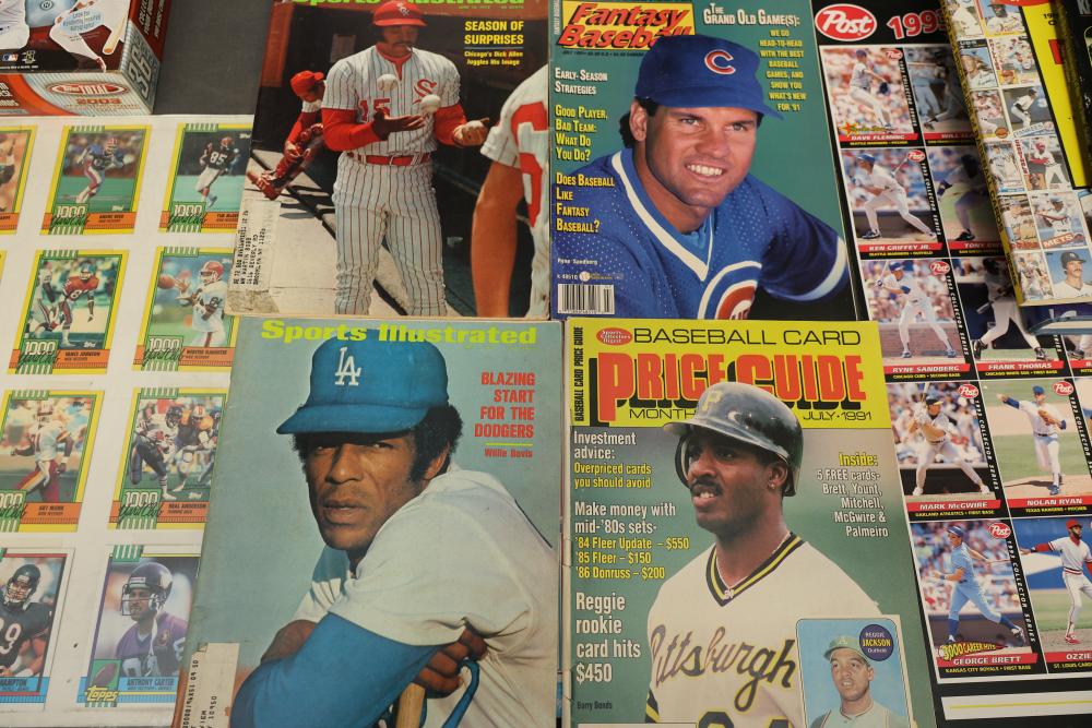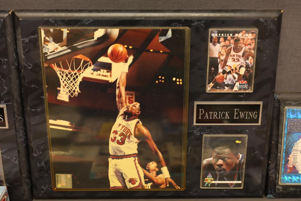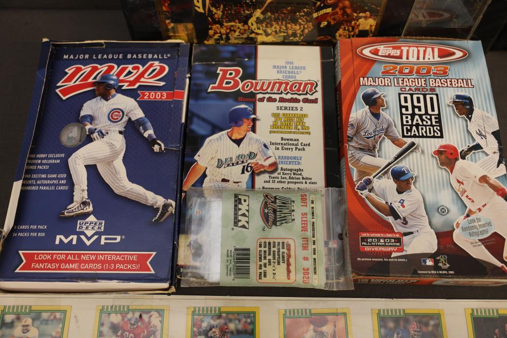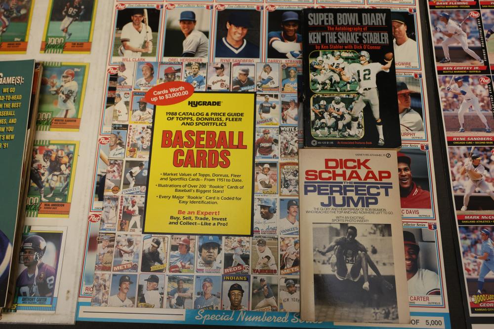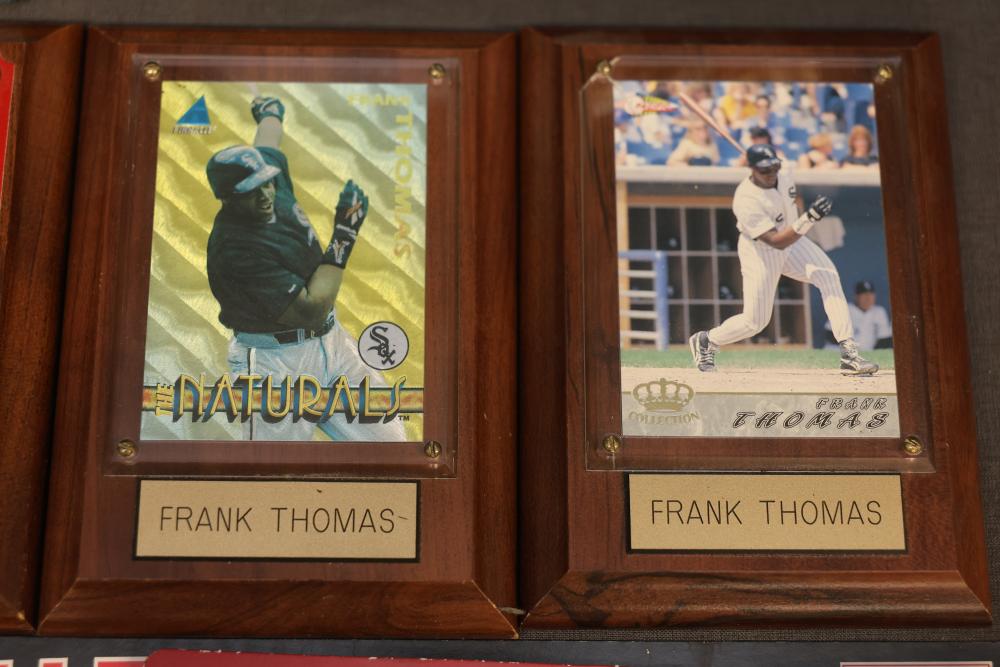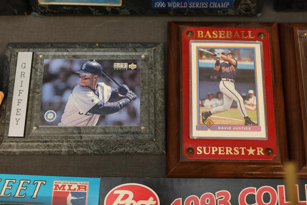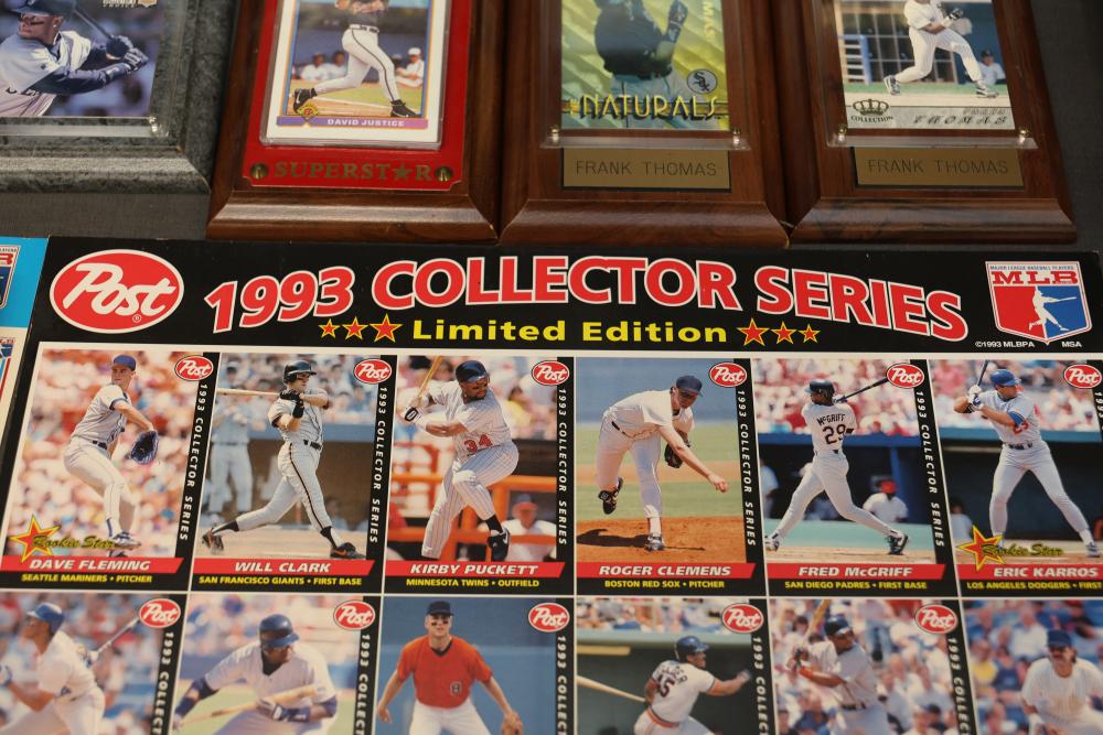 Sports Memorabilia Featuring Plaques, Figures, and Cards. Includes commemorative plaques of baseball players such as Andy Pettitte and Bernie Williams, bobblehead figures, action figures, collector cards, and magazines. Highlights cover various players and events. Pickup only.