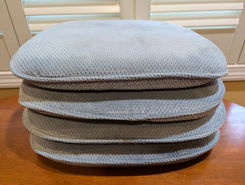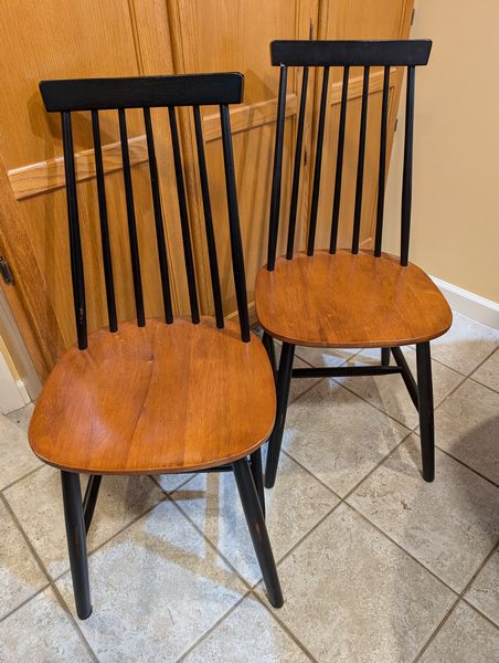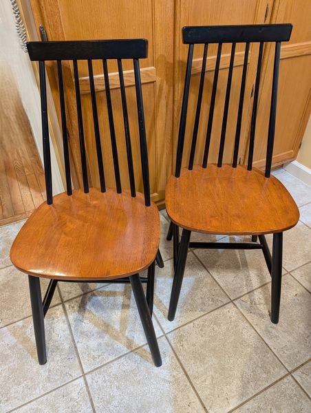 Five-Piece Dinette Set. Cherry & black painted dinette set by Amesbury furniture: table, 41"diam x 30"H; set of four side chairs, ea. 17"Wx17"Dx36.5"H; set of four blue seat cushions.