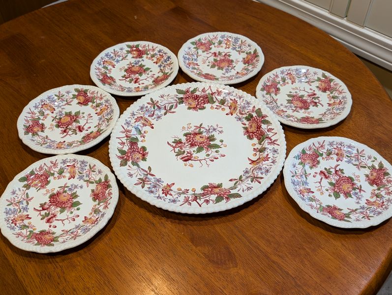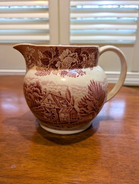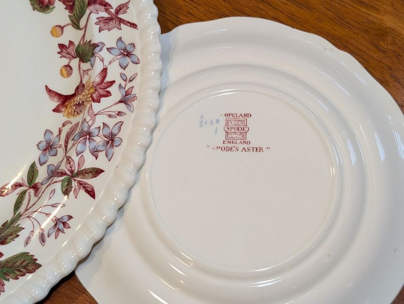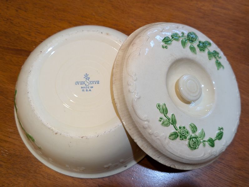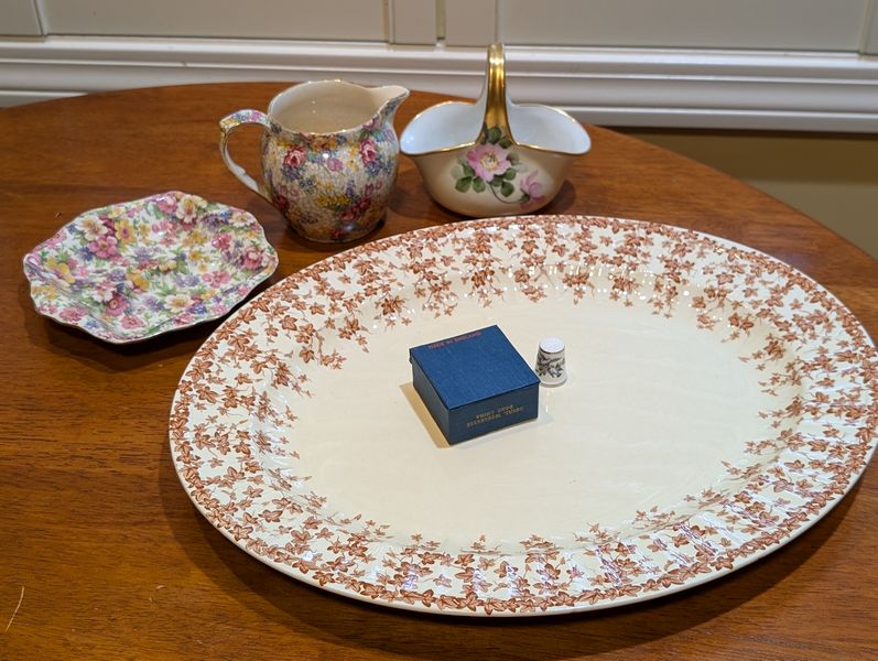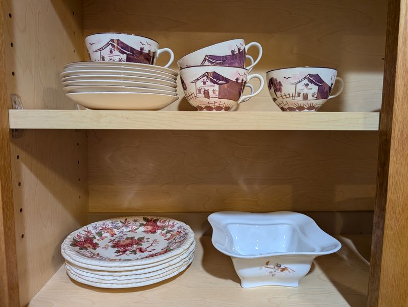 Corning Cookware and Entertaining. Eight pieces Corning cookware; oval English platter, 16"L; Spode seven-piece dish set with 13" platter & set of six matching dessert plates; vintage covered casserole (US Pottery maker), 9"diam; antique pitcher by Wood & Sons, England "Enoch Woods"; other pieces (English, German, Great Britain - see maker's marks); other related items as seen in cabinet & on counter below.