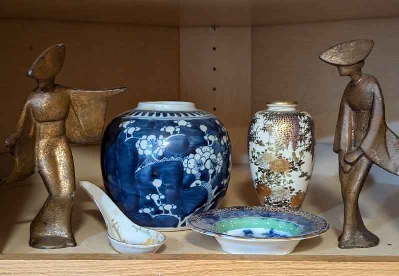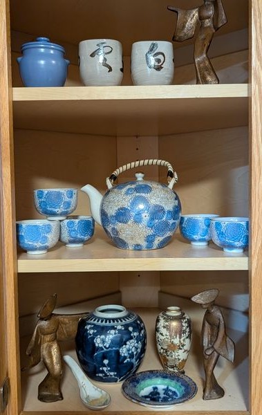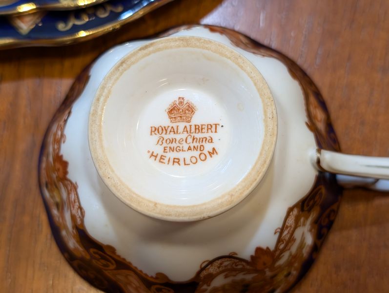 Asian Entertaining featuring Royal Albert. Two-dozen Royal Albert items, incl: plates, cups, saucer, serv dish, incl several "heirloom" collections (see photos in cab); seven-piece Asian tea put & cup set; two vases; three figurines; cup; covered bowl. See photos for more details.