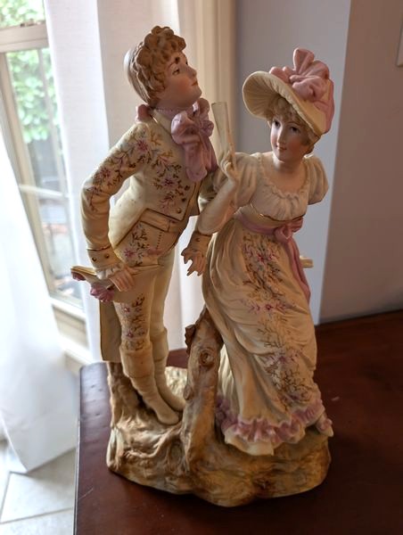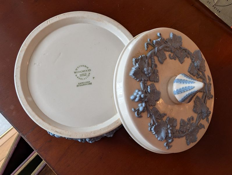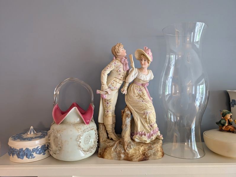 Quality Vintage Décor, featuring Wedgwood. Fourteen items: Victorian statue, 14"H (see photo missing tip of finger); Wedgewood vase, 8"H; Wedgwood covered dish; pair of extra tall clear glass hurricane globes; Hummel covered bowl; Hummel wall plate; antique silver topped bottle; set of three cobalt blue Victorian vessels (two with lids). See photos for more details.