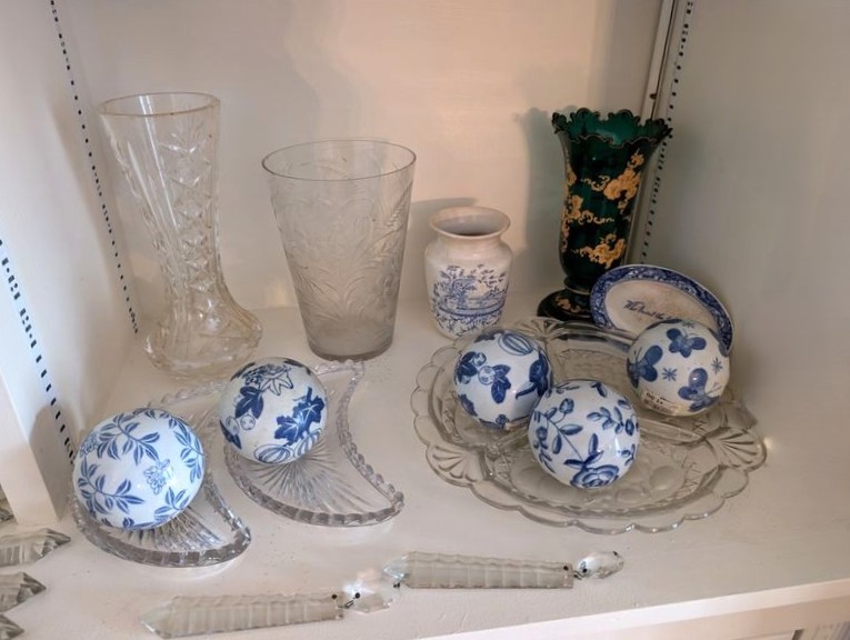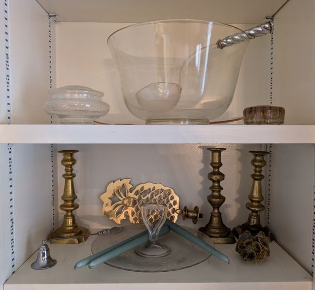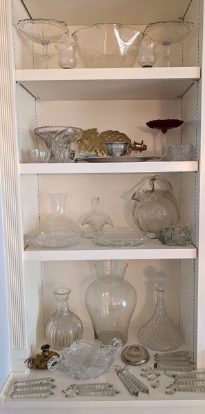 Crystal and Brass Entertaining. Over seventy pieces: three brass candlestick holders, ea. approx. 8"H ; vintage punchbowl, approx. 11"diam with glass & silver plated handle; pair of brass "pineapple" wall mount candle holders; multiple vintage glass entertaining pieces, including bowls, platters, pitcher, vases, decanter; chandelier crystals (approx. 16); other related items as seen in photos.