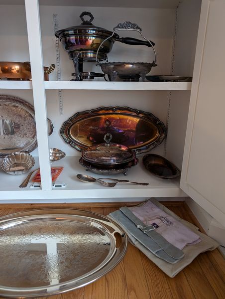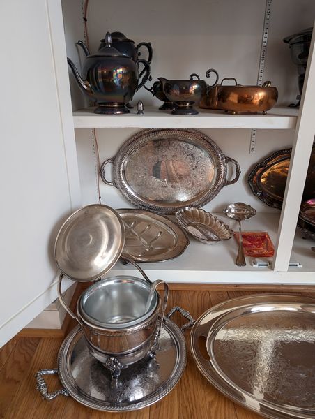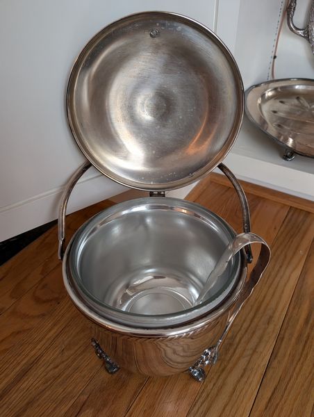 Vintage Silverplate and Copper Entertaining. Silverplate including coffee/tea service (note coffee finial detached); covered buffet warming dish; assorted platters, largest 13"L; covered ice bucket by Bristol Silverplate with tong;, punch bowl label; meat serv dish; serv utensils; trivets. See photos for more details.