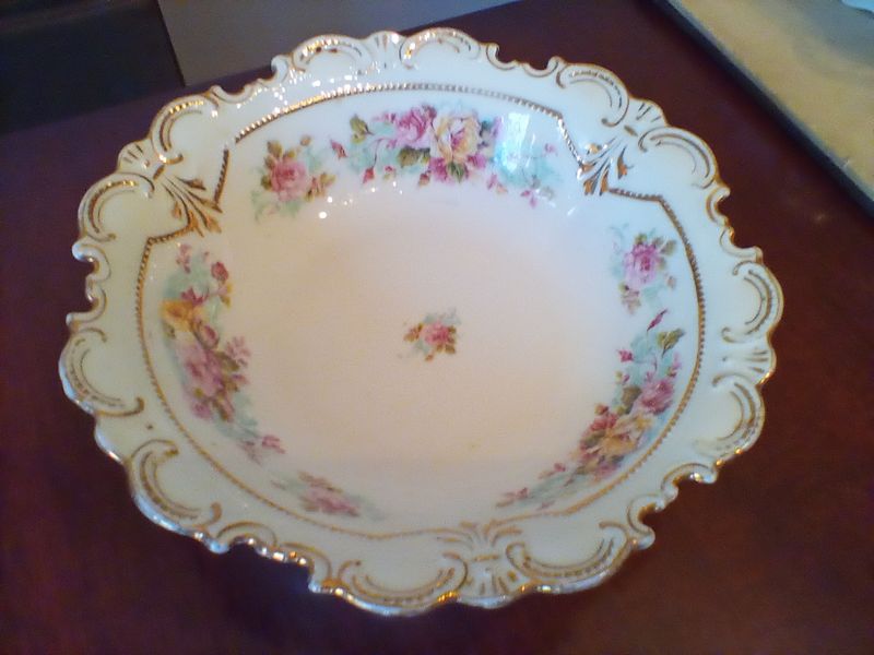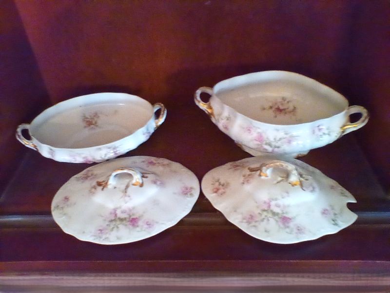 Haviland Limoges Serving Pieces and Bowl. Six pieces Limoges serving pieces, incl: oval double-handle large platter, 14"L; smaller double-handle platter; covered tureen (no ladle), 13"L; covered vegetable dish, 10"L; coordinating scalloped bowl. Matches items in lot #17.