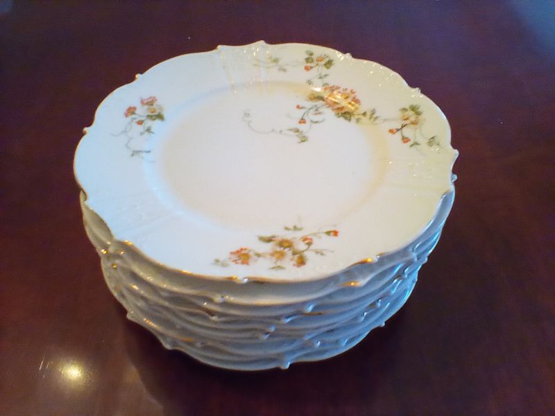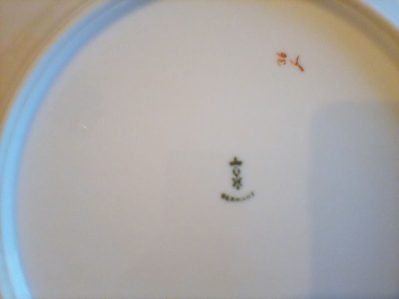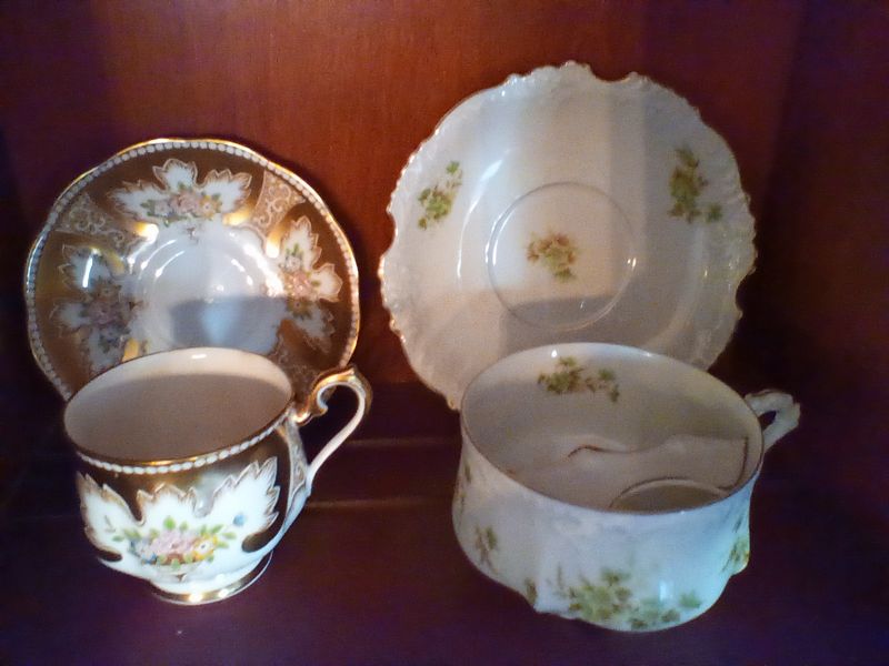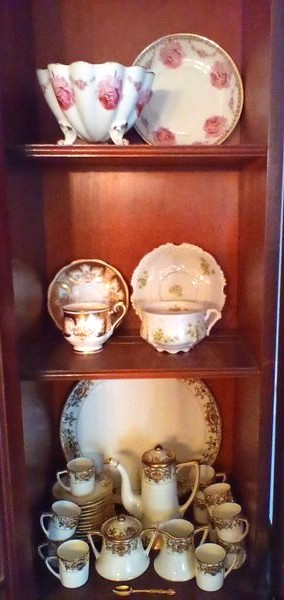 Vintage Porcelain Entertaining, featuring Two Hot Chocolate Sets. Ten-piece Nippon hot chocolate serv set, hand painted with gold: choc pot, 9"H; second hot choc set (over two dozen pieces) with smaller choc pot, cup & saucer, large serving dish; two tea cups/saucer sets; three-piece rose-motif footed bowls (large & small) w plate; set of nine German plates. See maker's marks.