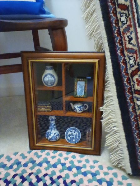 Small Furniture and Rugs. Two vintage wood side chairs; shadow box with blue & white collectibles; entry rug, 34"diam; large Oriental Rug Gallery fringed area rug (see label), approx. 5.5'x 8'; wood framed wall mirror, 16"x13"; two throw pillows; fringed throw blanket; artificial floral decor. Loc on 2nd fl.
