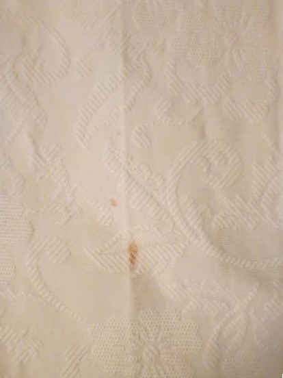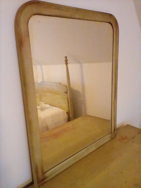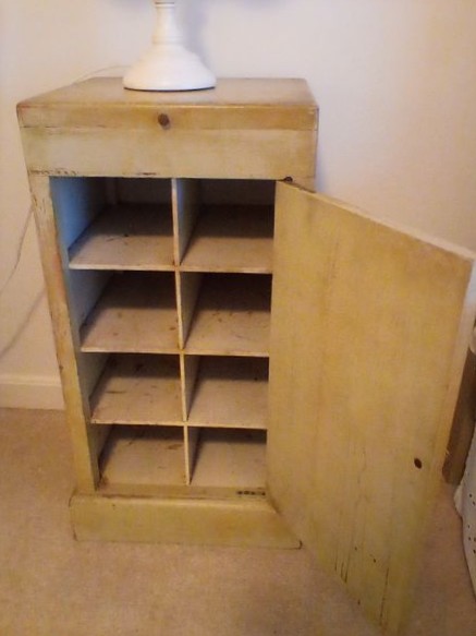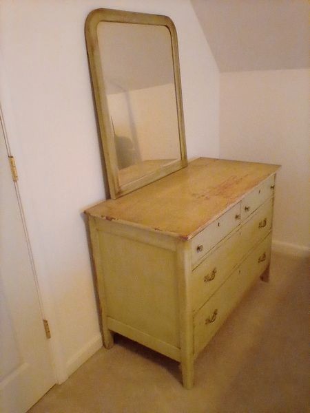 Green Painted Twin Bedroom Set. Pair of twin four-post beds, 58"H; matching four-drawer chest, 44"Wx32"Dx22"H with attached wood framed mirror, 27"Wx33"H; shoe caddy (with jewelry holder top) side table, 15"Wx14"Dx30"H (closed); white table lamp with fabric shade; pair of white bedspreads (minor stain on one) with matching pillow shams; opt Bob-O-Pedic mattress sets. Loc on 2nd fl.