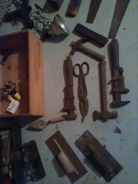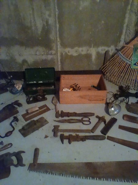 Antique Farm and Hand Tools. Includingseveral saws; hand tools; wrenches trowels; rakes; wood plane; glass door know; tool box & more. See photos. Loc in basement.