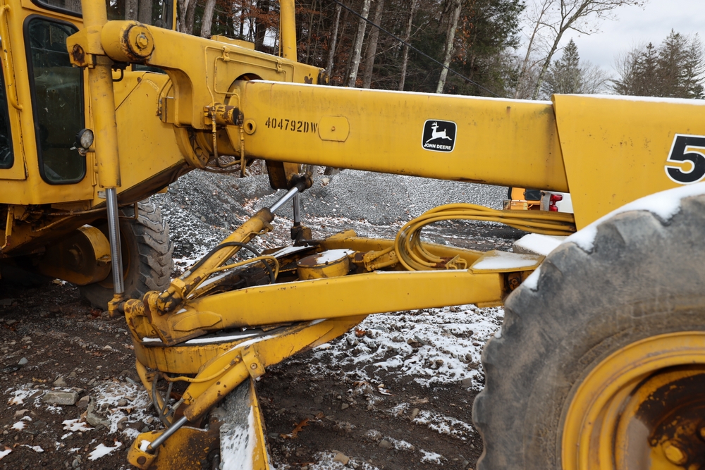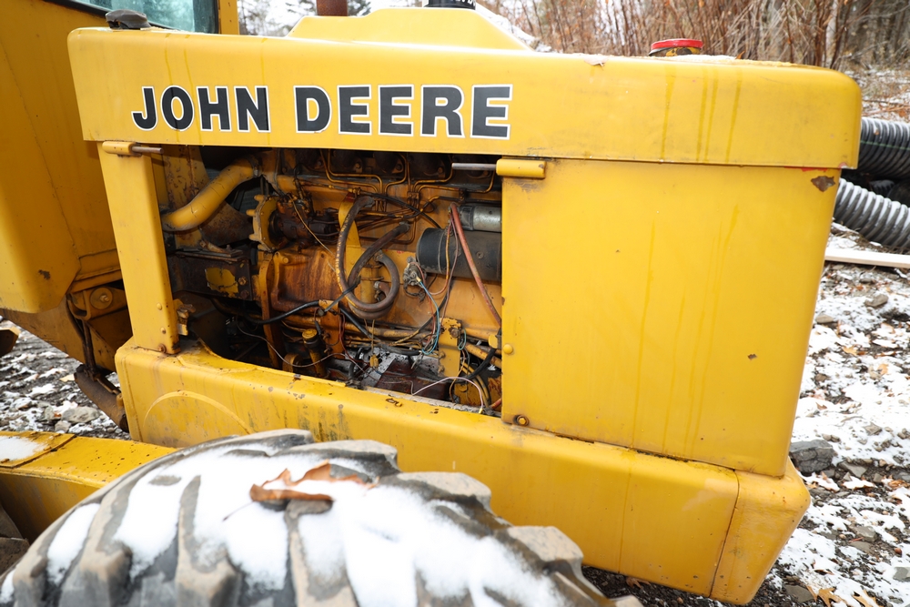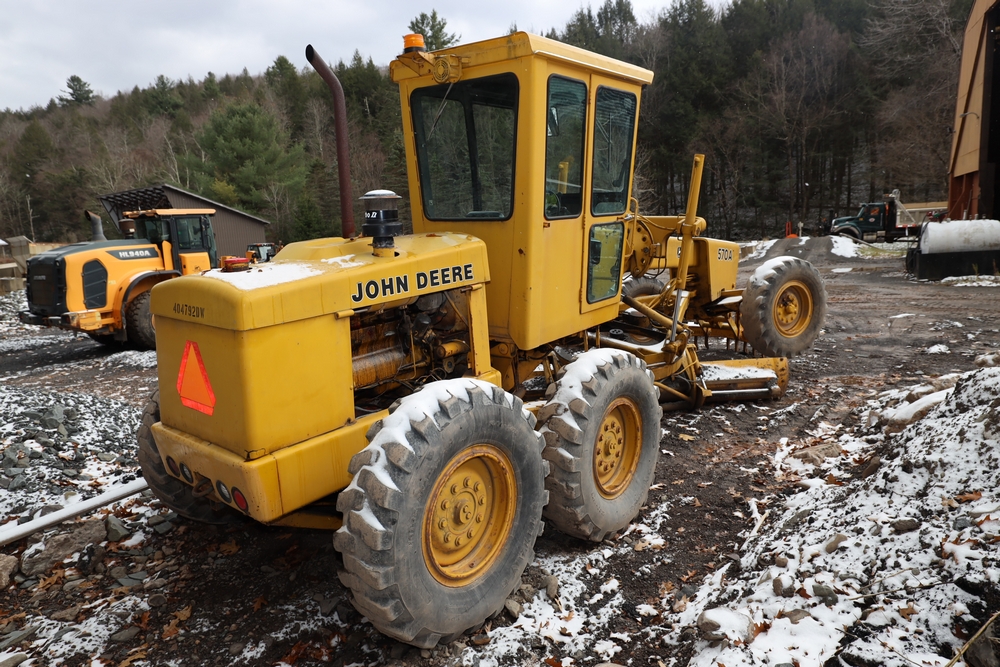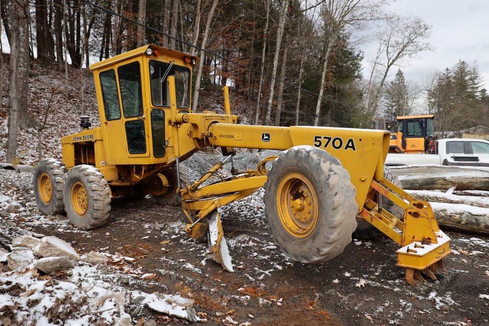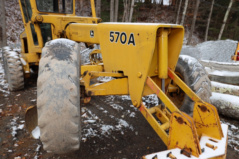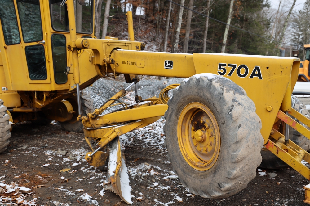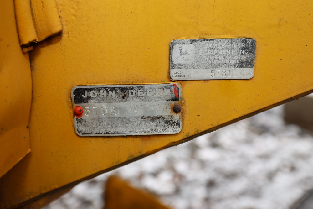 1982 John Deere 570A Grader. SN: 404792DW. Hours reading: 2763.1. Seller notes: Runs, operates, 2 side windows broke out.