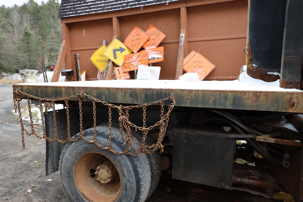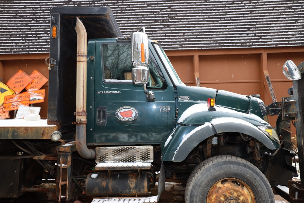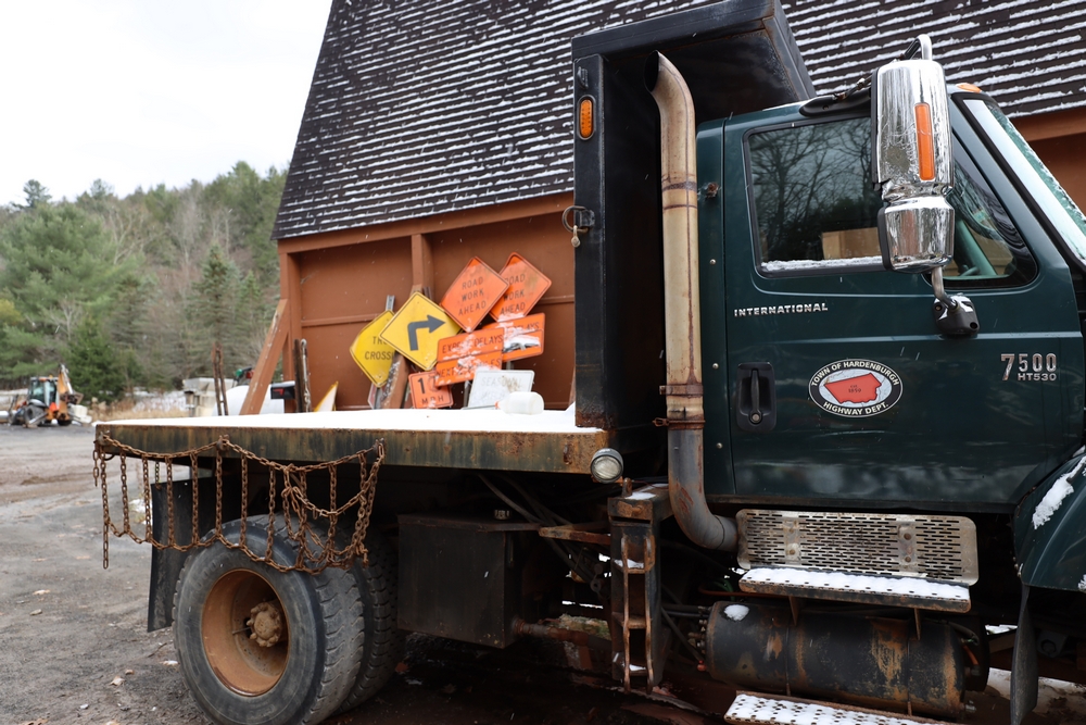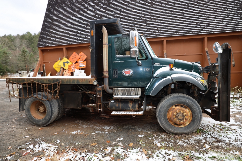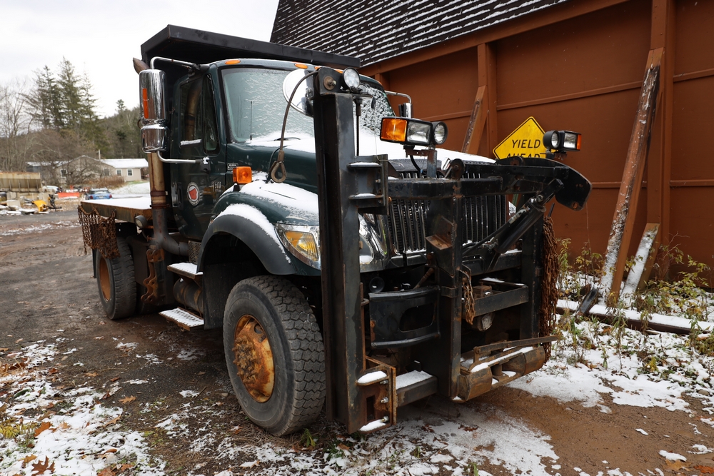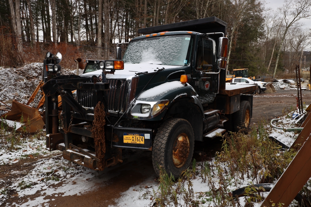 Items include 2021 Case 580SN Backhoe Loader, 1982 John Deere 570A Grader, 2003 Case 580M Series 2 Backhoe Loader, 2003 International WorkStar 7500, 1978 John Deere 570A Grader, Tenco plow, and salt spreaders. Items are located in Arkville, NY.